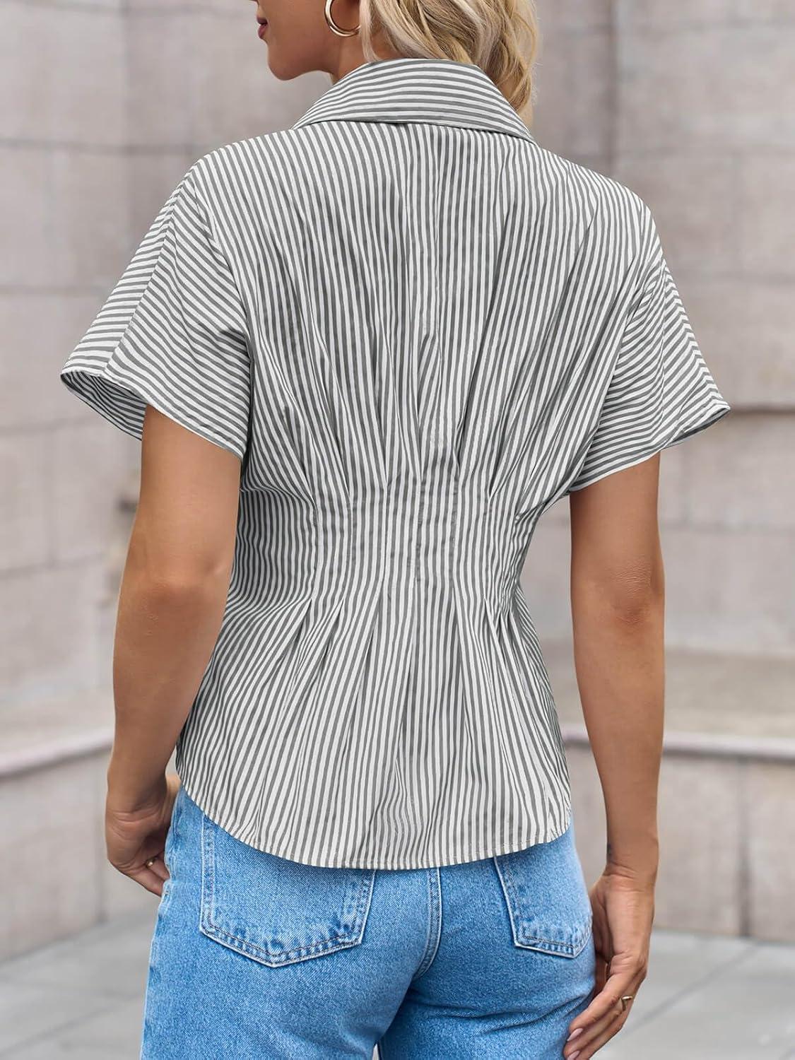 Tankaneo Womens Striped Peplum Button Down Shirts Short Sleeve Pleated Tops Summer Business Casual Blouses(Light Grey)