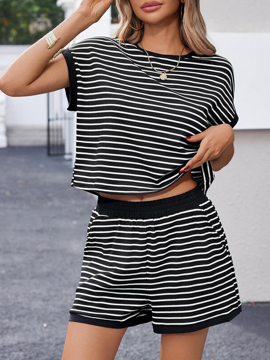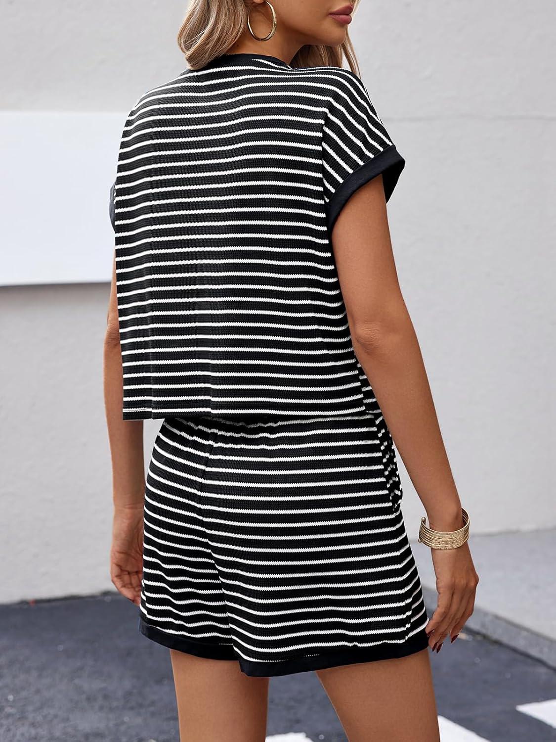 Tankaneo Womens Summer 2 Piece Sets Striped Short Sleeve T Shirts and Shorts Loungewear Matching Set(Black)