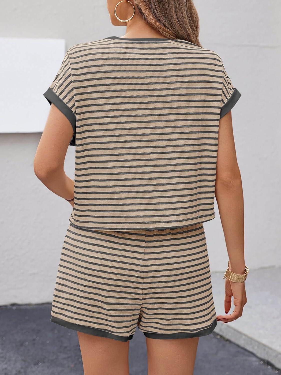 Tankaneo Womens Summer 2 Piece Sets Striped Short Sleeve T Shirts and Shorts Loungewear Matching Set(Grey)