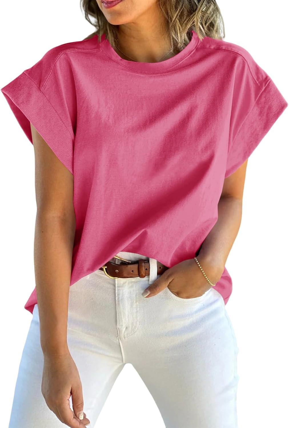 Tankaneo Womens Summer Cap Sleeve Tank Top Crew Neck Solid Casual Loose Fit Basic Tee Shirt(Rose Red)