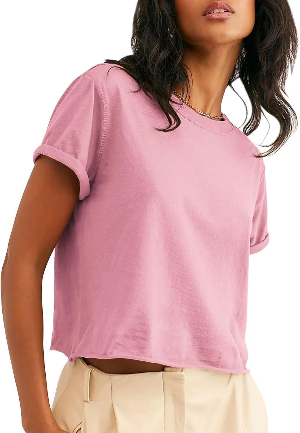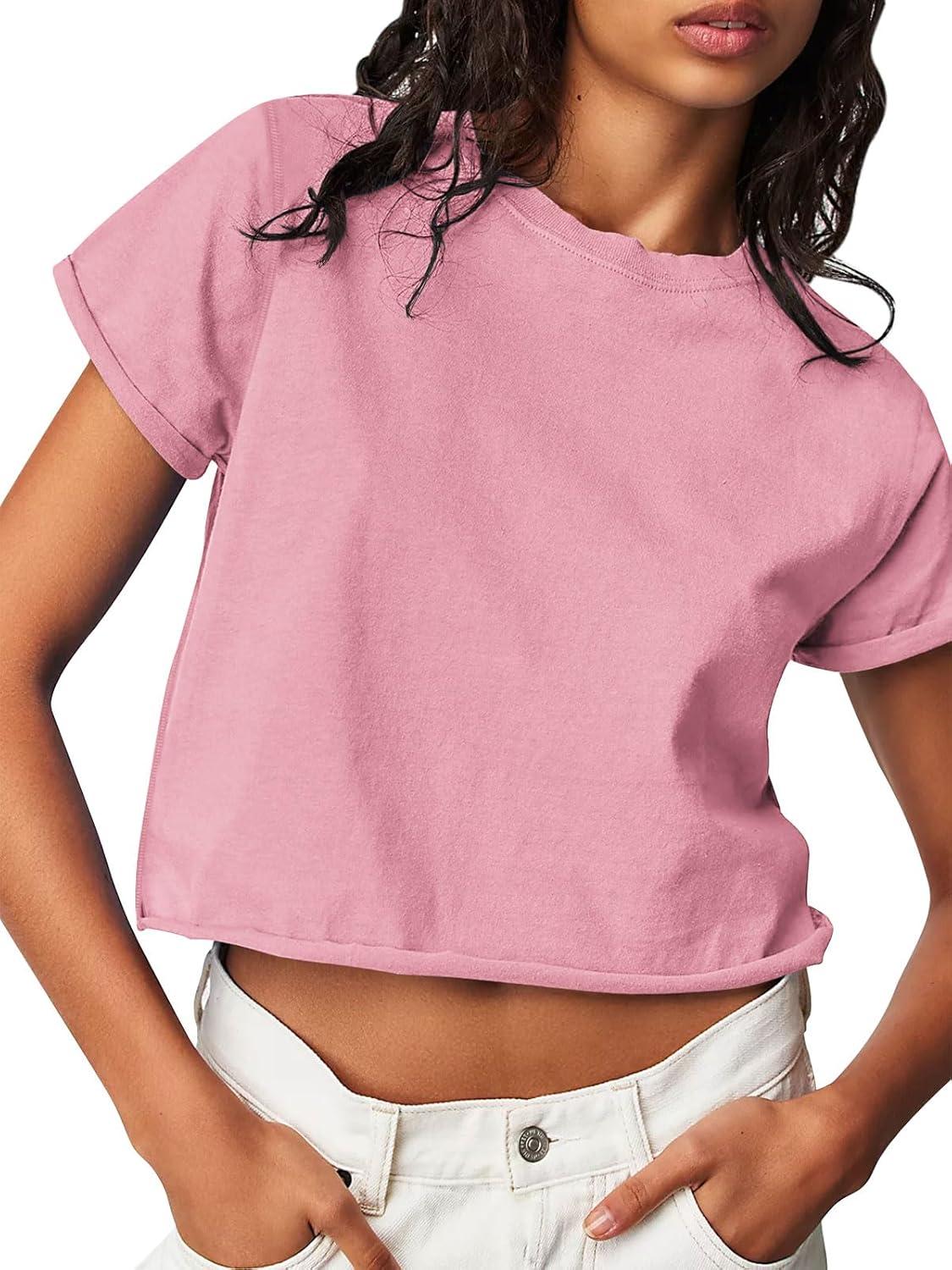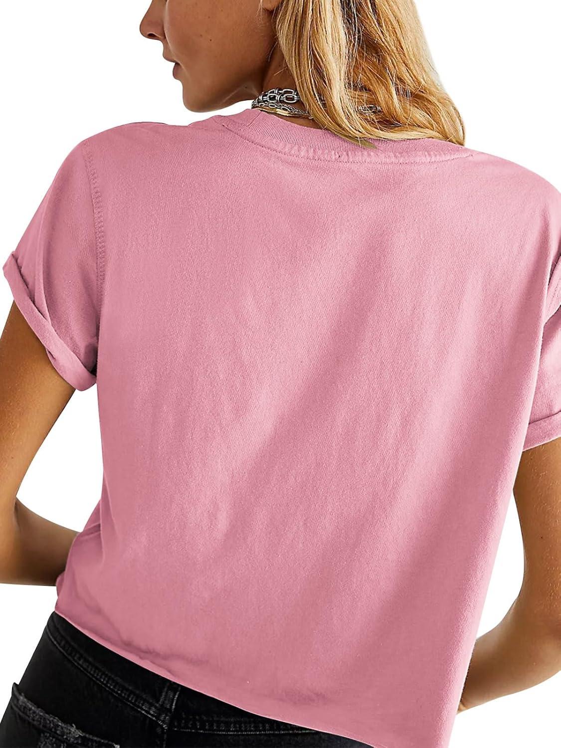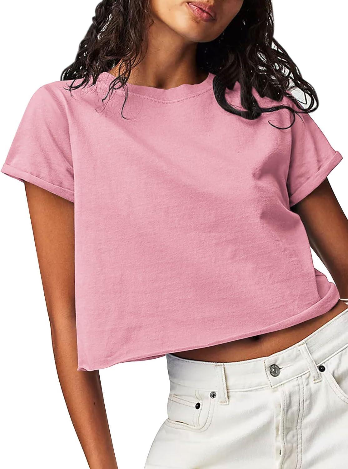 Tankaneo Womens Summer Crop Tops Trendy 2025 Short Sleeve Crewneck Tee Casual Cute Workout Cropped T Shirts Basic Top(Pink)