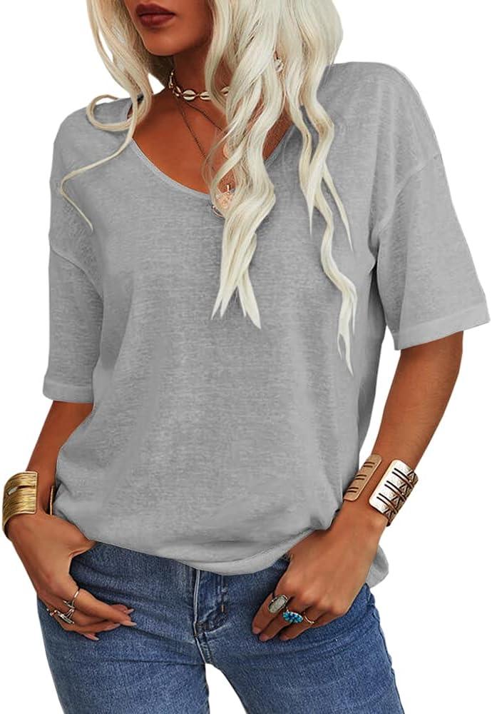 Tankaneo Women’s Summer Fashion V-Neck Half Sleeves T Shirt Solid Casual Loose Basic Tunics Tops(Gray)
