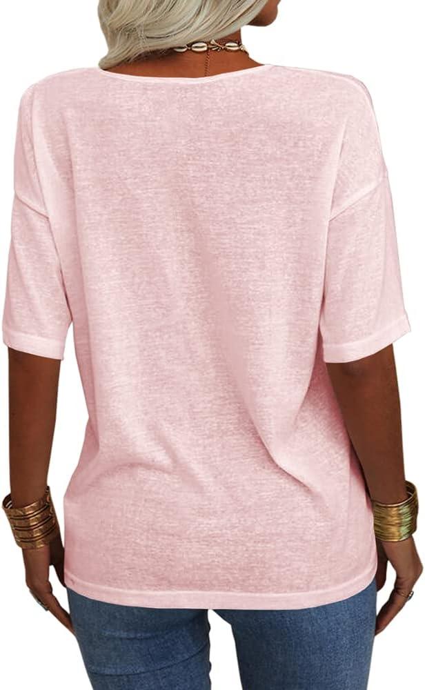 Tankaneo Women’s Summer Fashion V-Neck Half Sleeves T Shirt Solid Casual Loose Basic Tunics Tops(Pink)