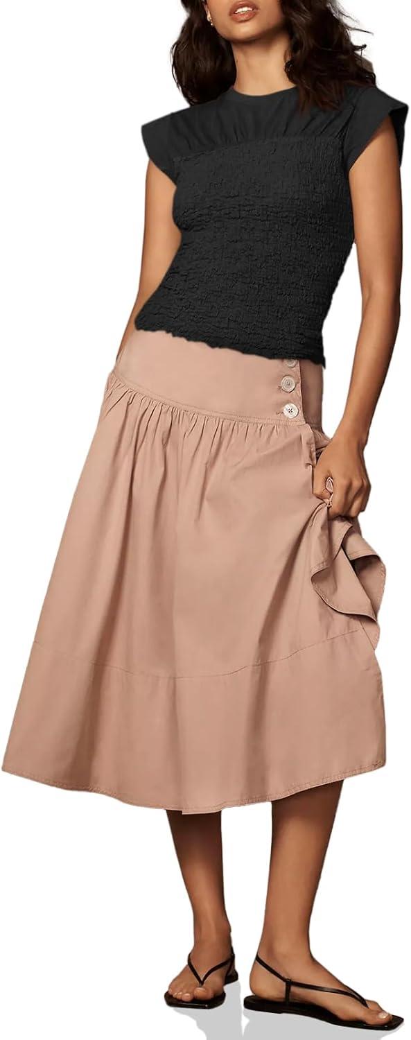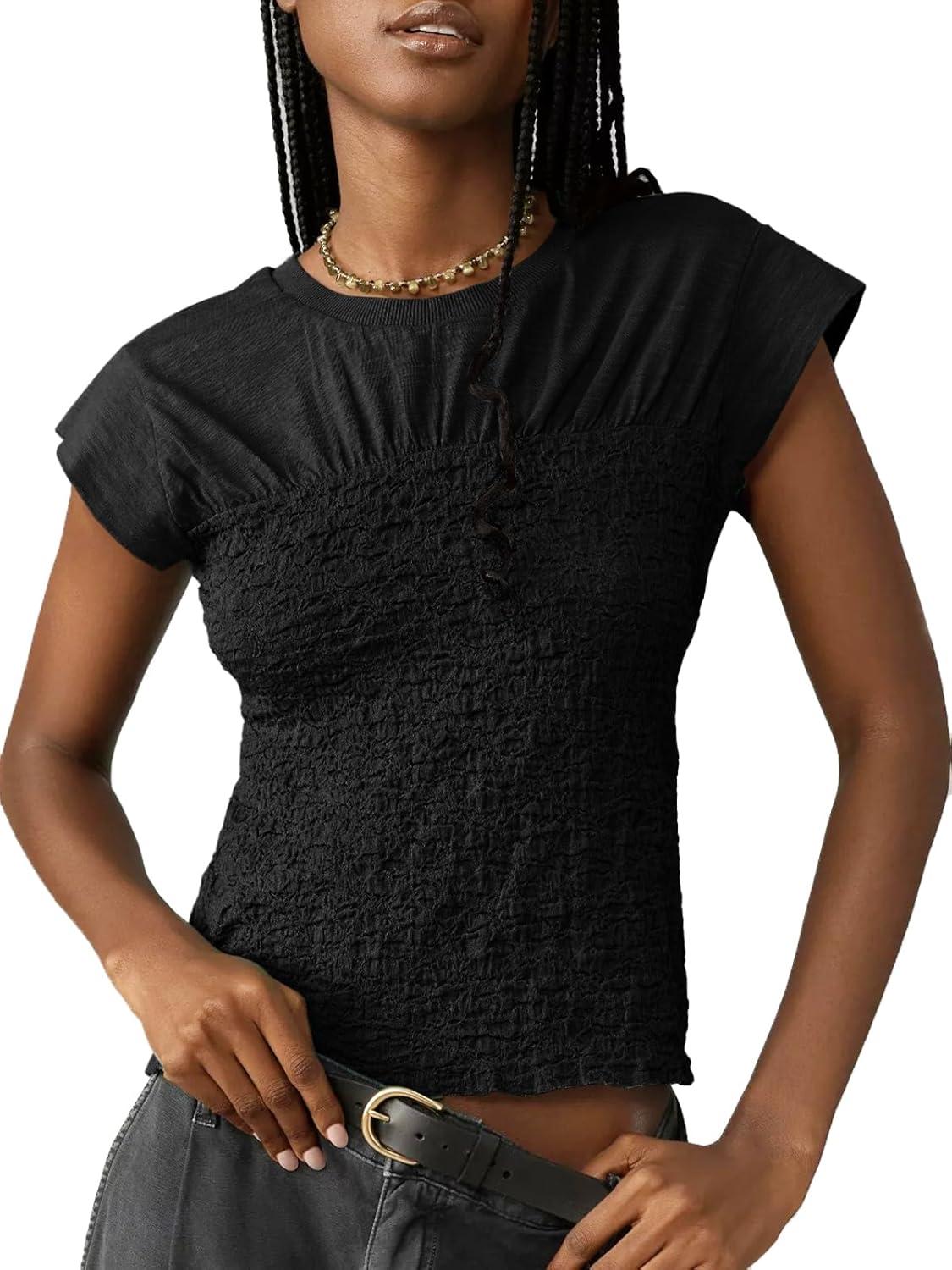 Tankaneo Womens Summer Smocked Tank Tops Textured Cap Sleeve Slim Fit Tops Crew Neck Patchwork Baby Tee Shirt(Black)