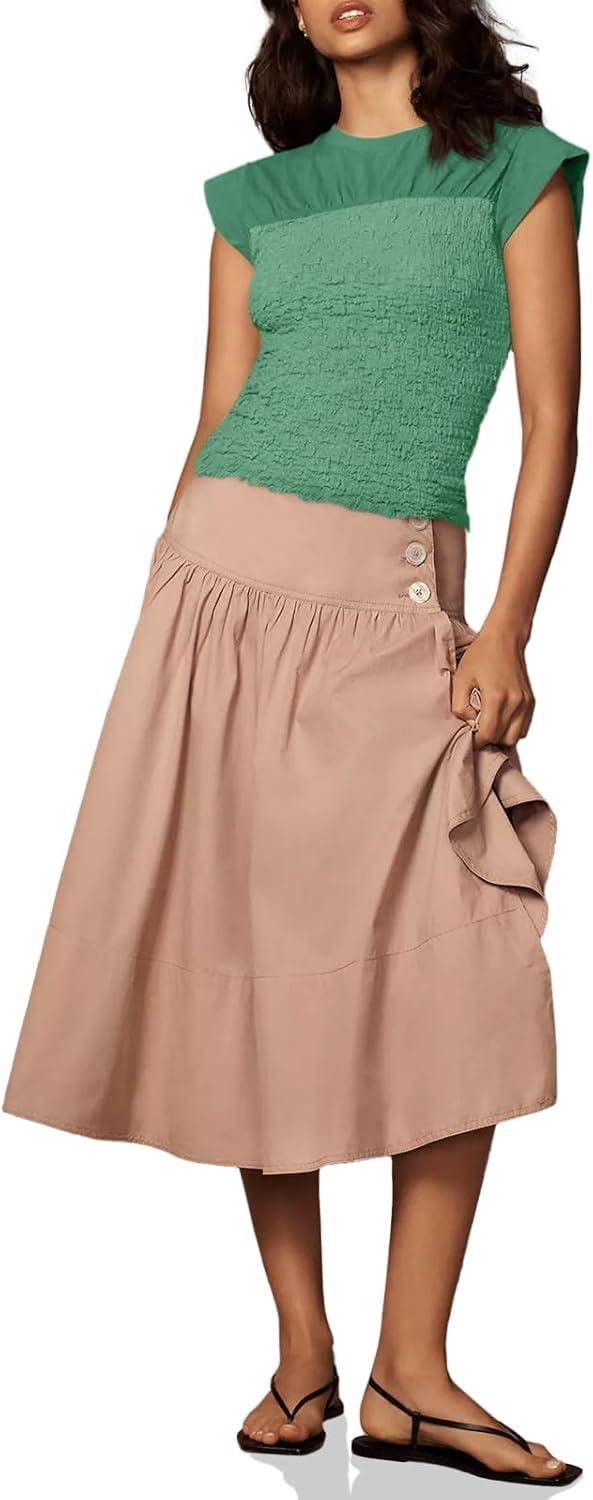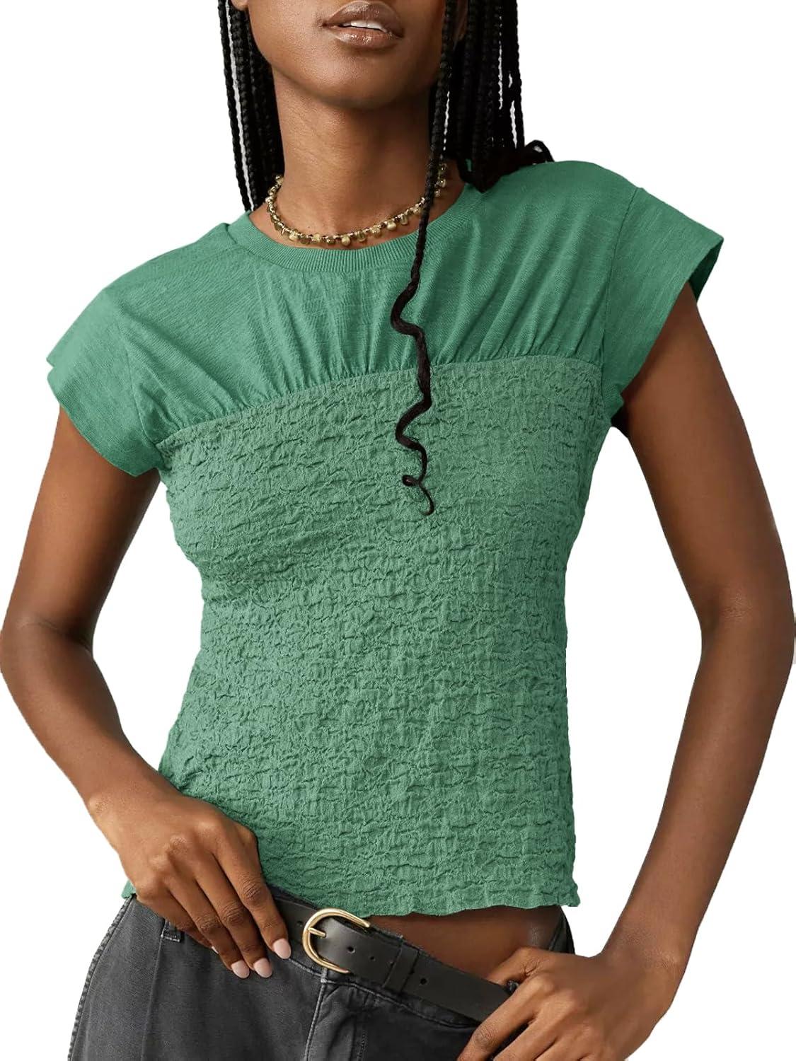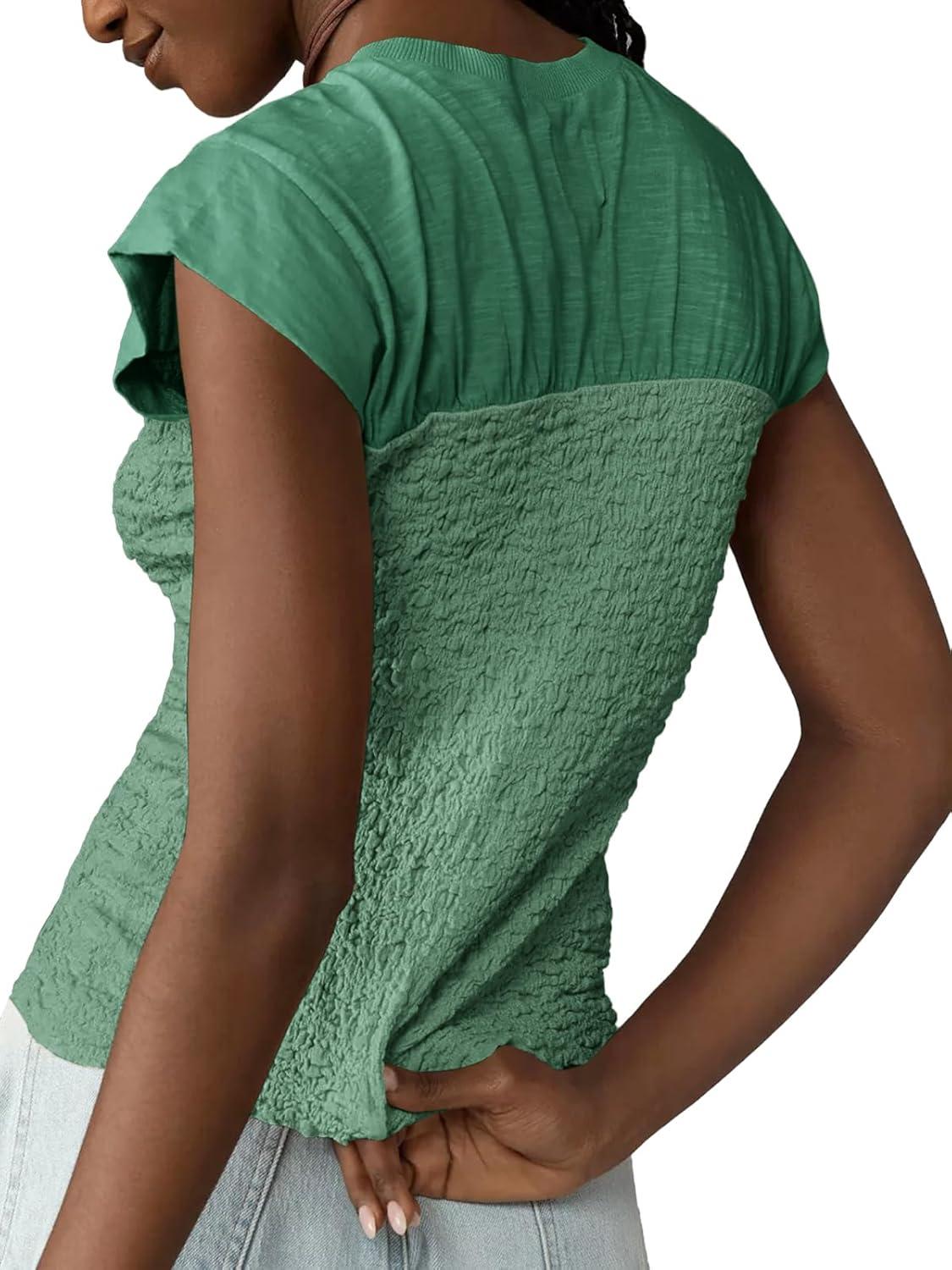 Tankaneo Womens Summer Smocked Tank Tops Textured Cap Sleeve Slim Fit Tops Crew Neck Patchwork Baby Tee Shirt(Green)