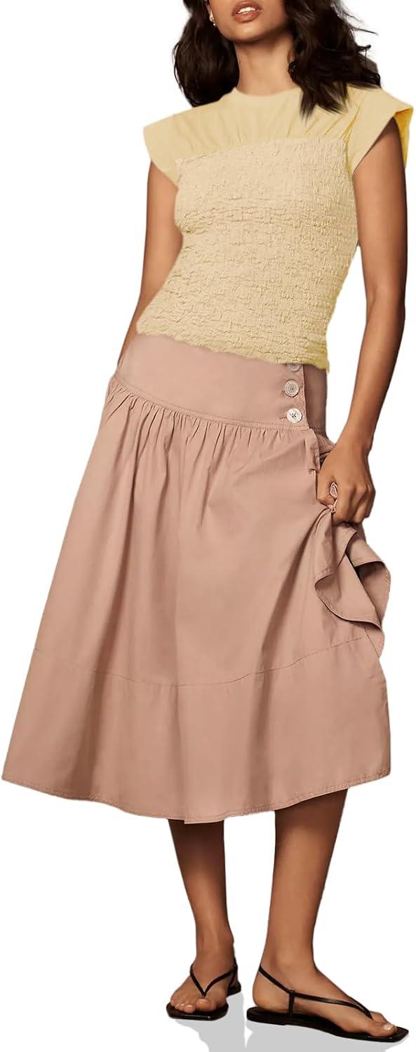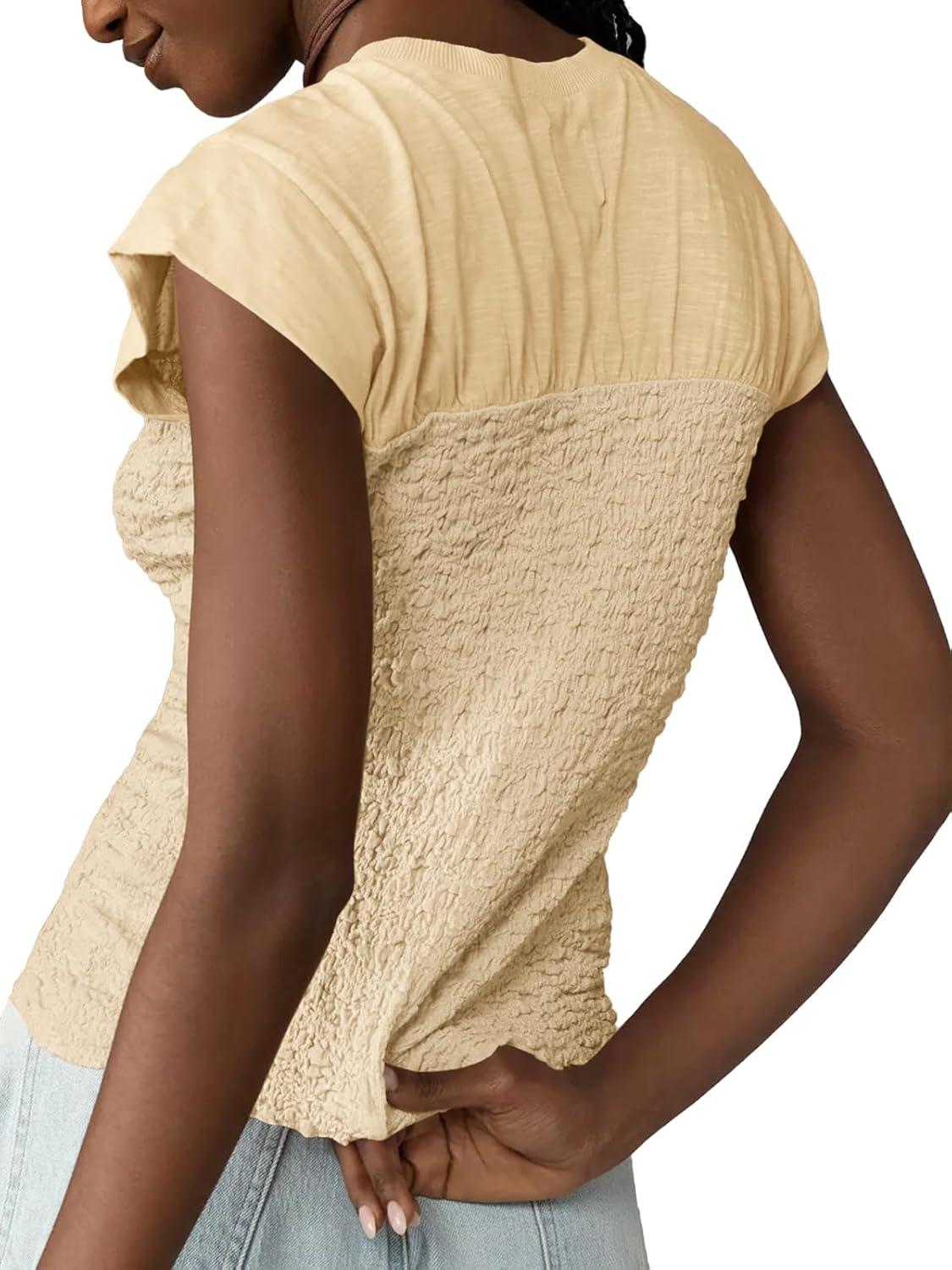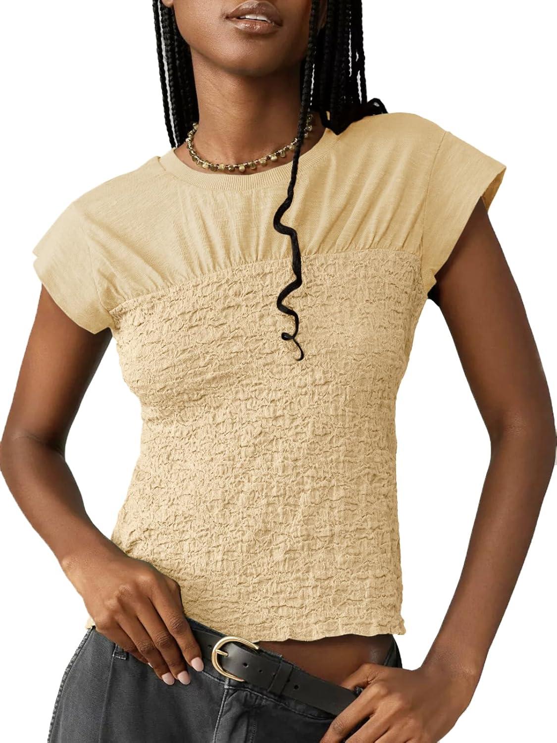 Tankaneo Womens Summer Smocked Tank Tops Textured Cap Sleeve Slim Fit Tops Crew Neck Patchwork Baby Tee Shirt(Light Khaki)