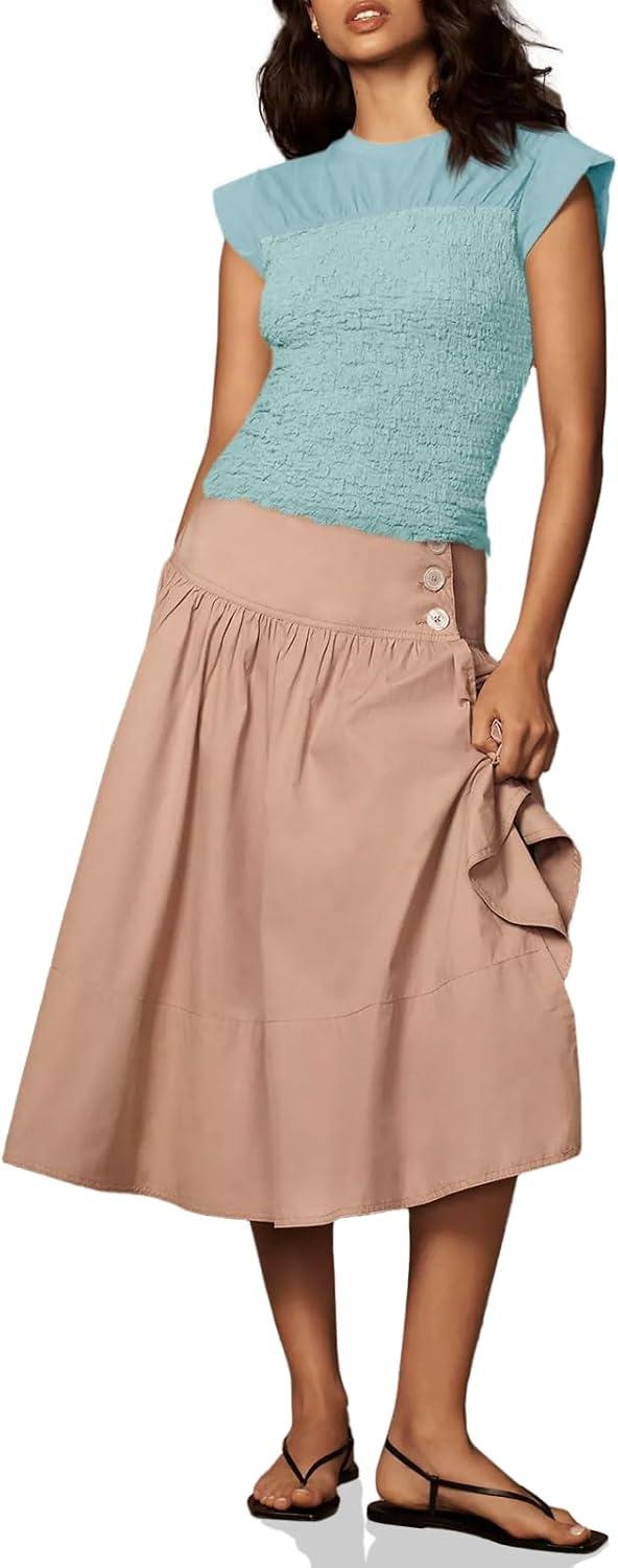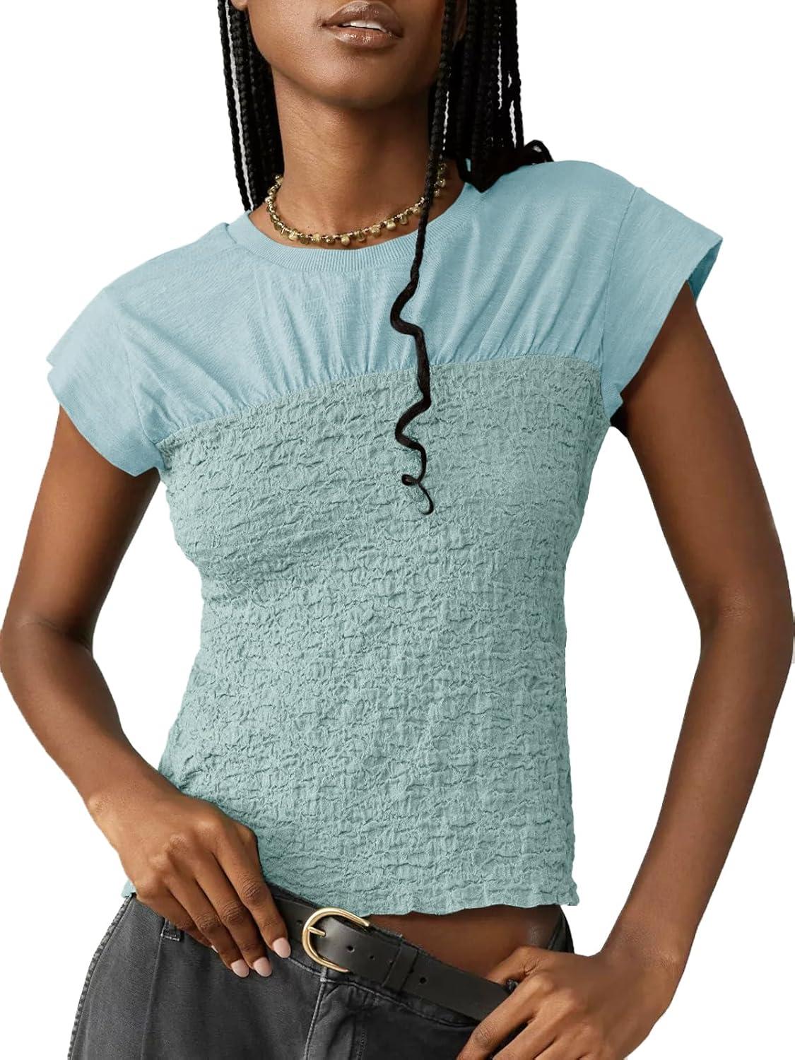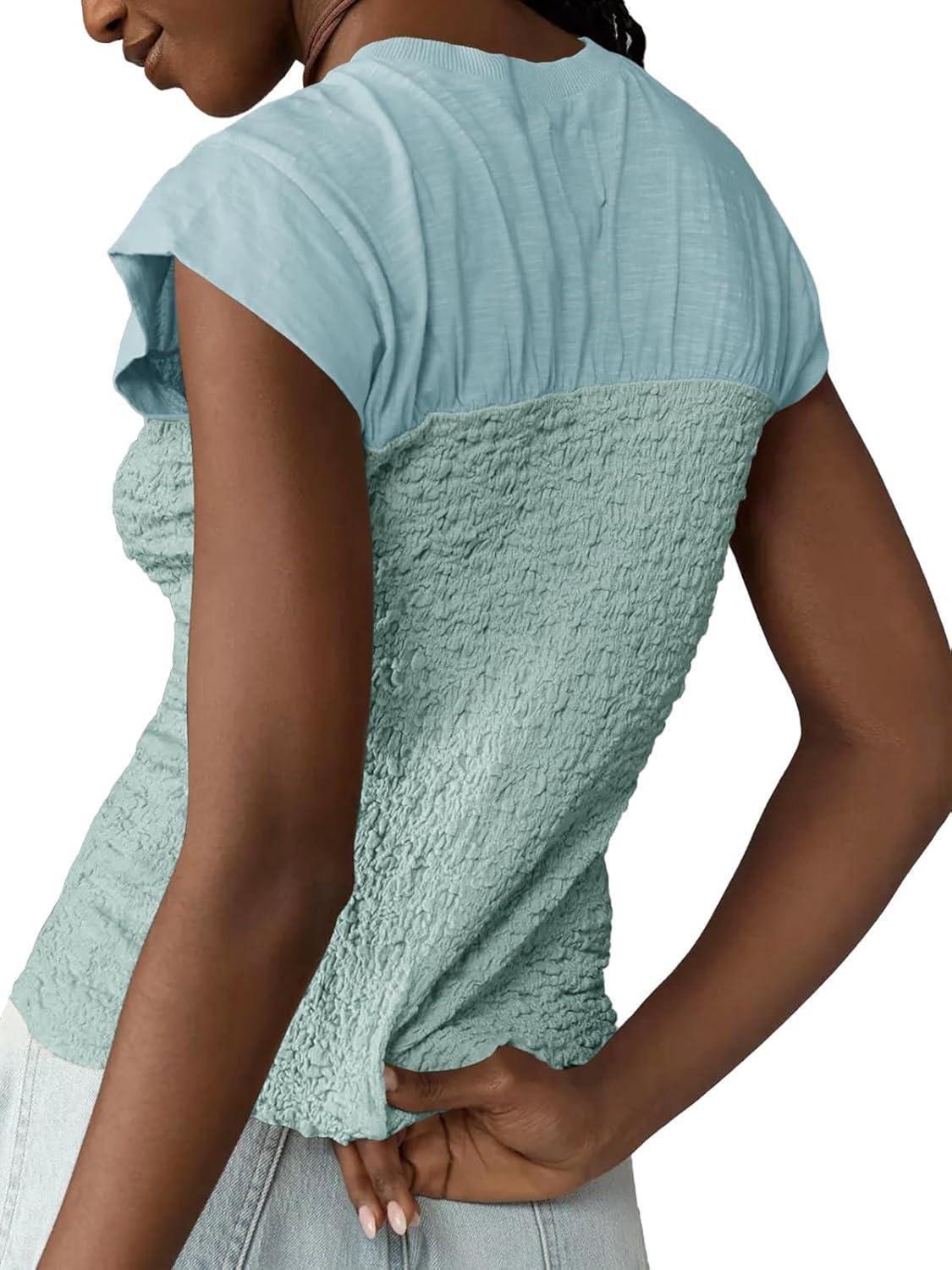 Tankaneo Womens Summer Smocked Tank Tops Textured Cap Sleeve Slim Fit Tops Crew Neck Patchwork Baby Tee Shirt(Sky Blue)