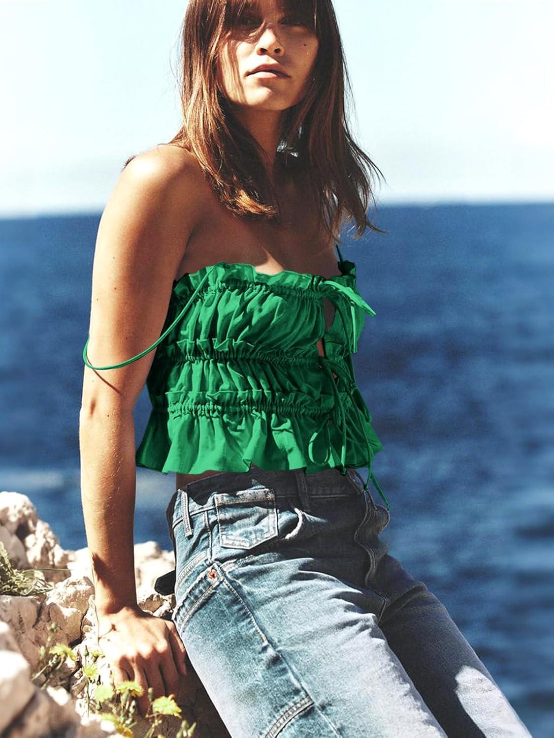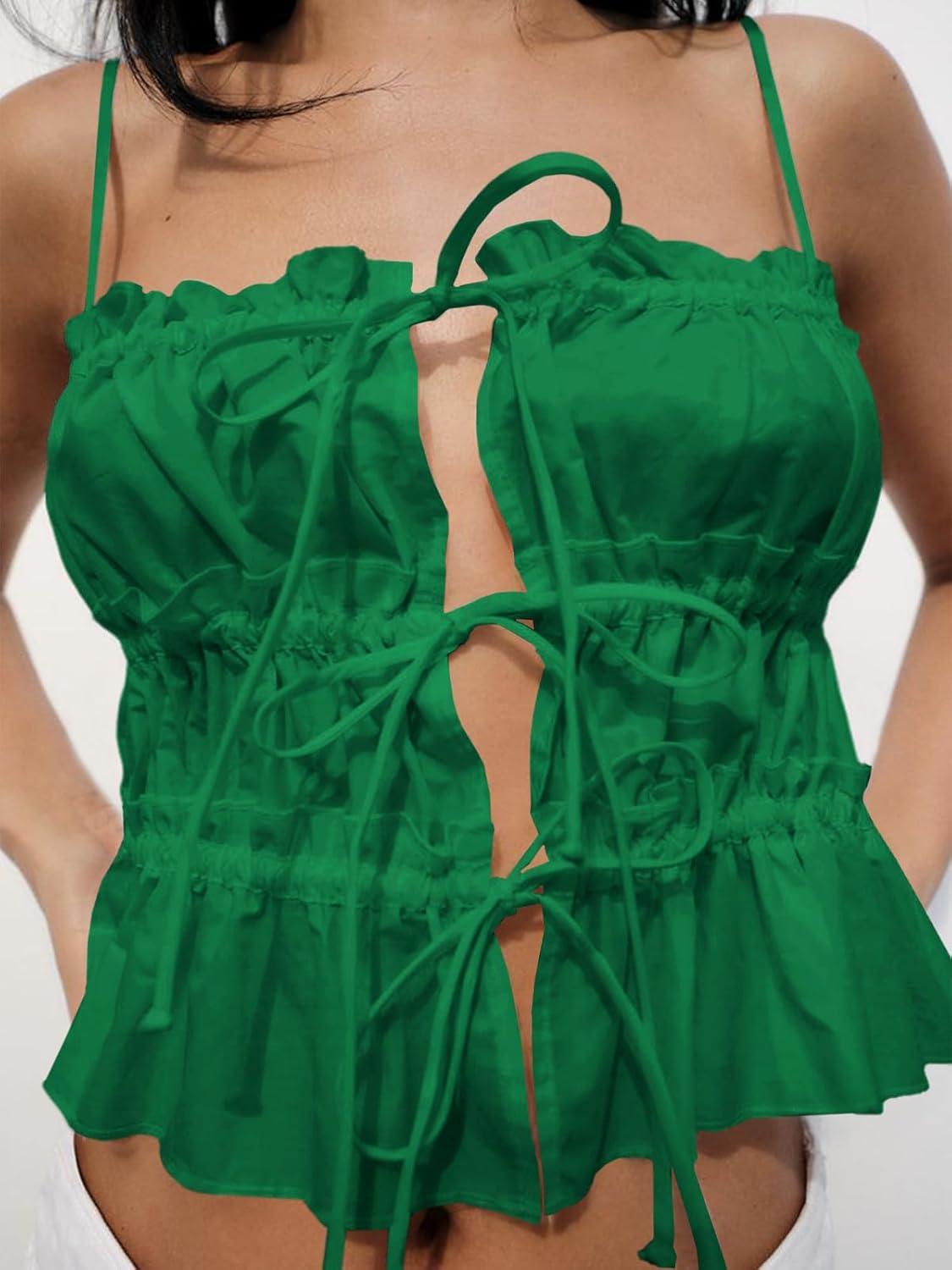 Tankaneo Womens Summer Tie Front Crop Tops Cute Ruffle Ruched Spaghetti Strap Tank Tops Y2K Going Out Shirts(Green)
