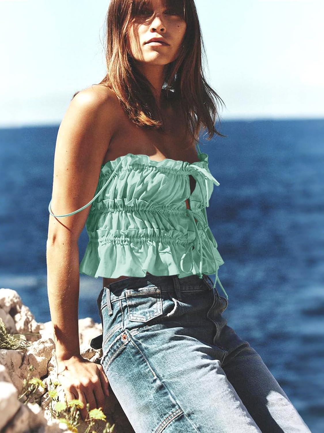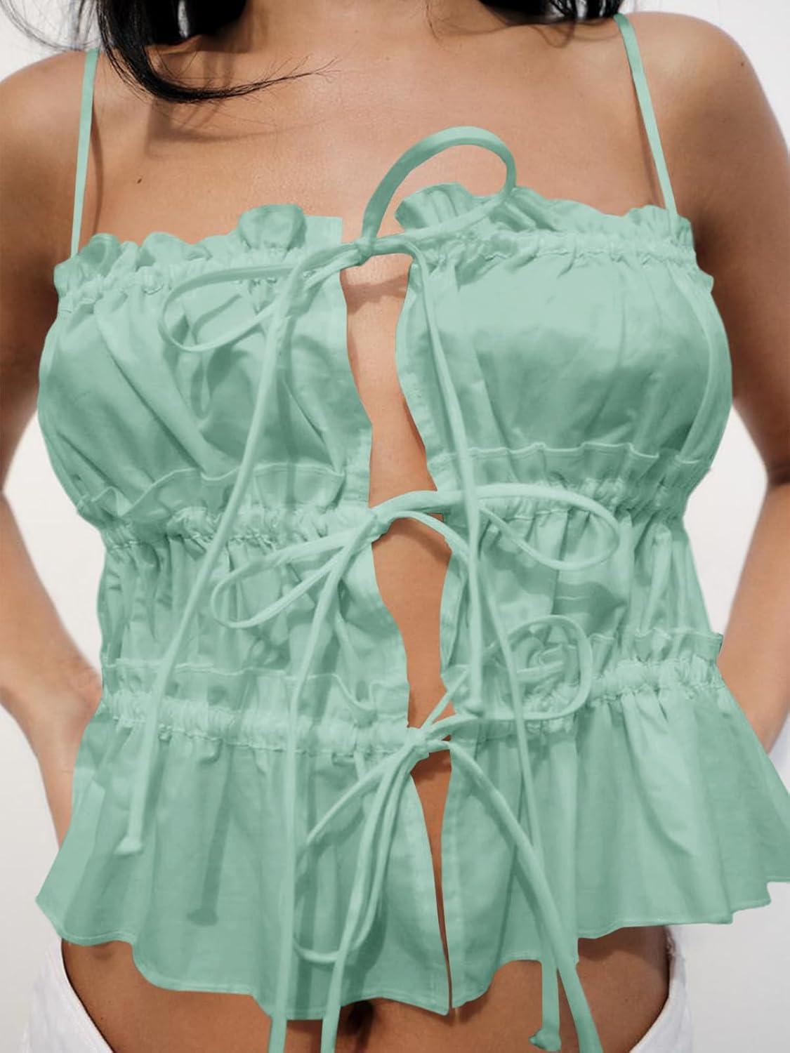 Tankaneo Womens Summer Tie Front Crop Tops Cute Ruffle Ruched Spaghetti Strap Tank Tops Y2K Going Out Shirts(Mint Green)