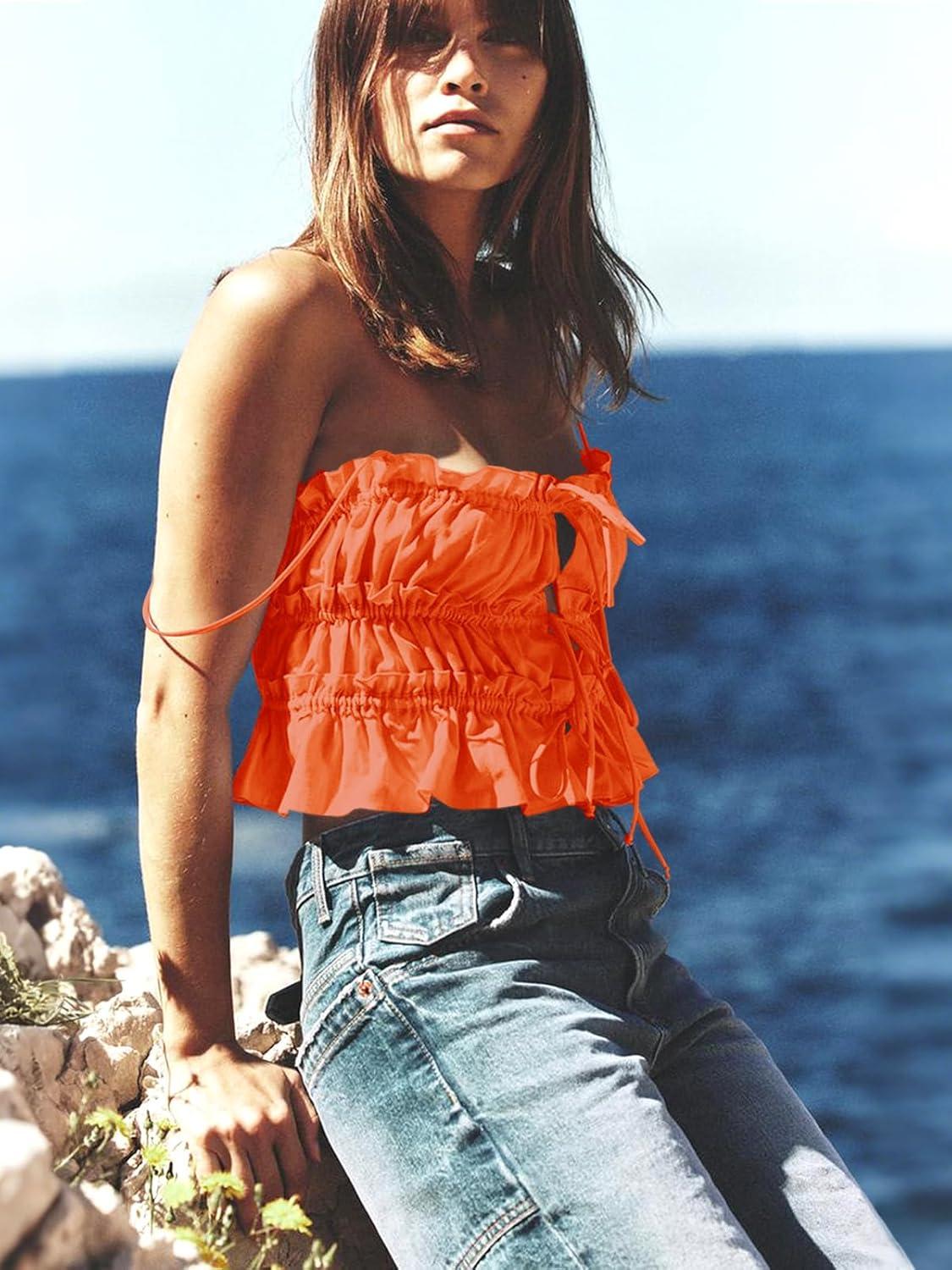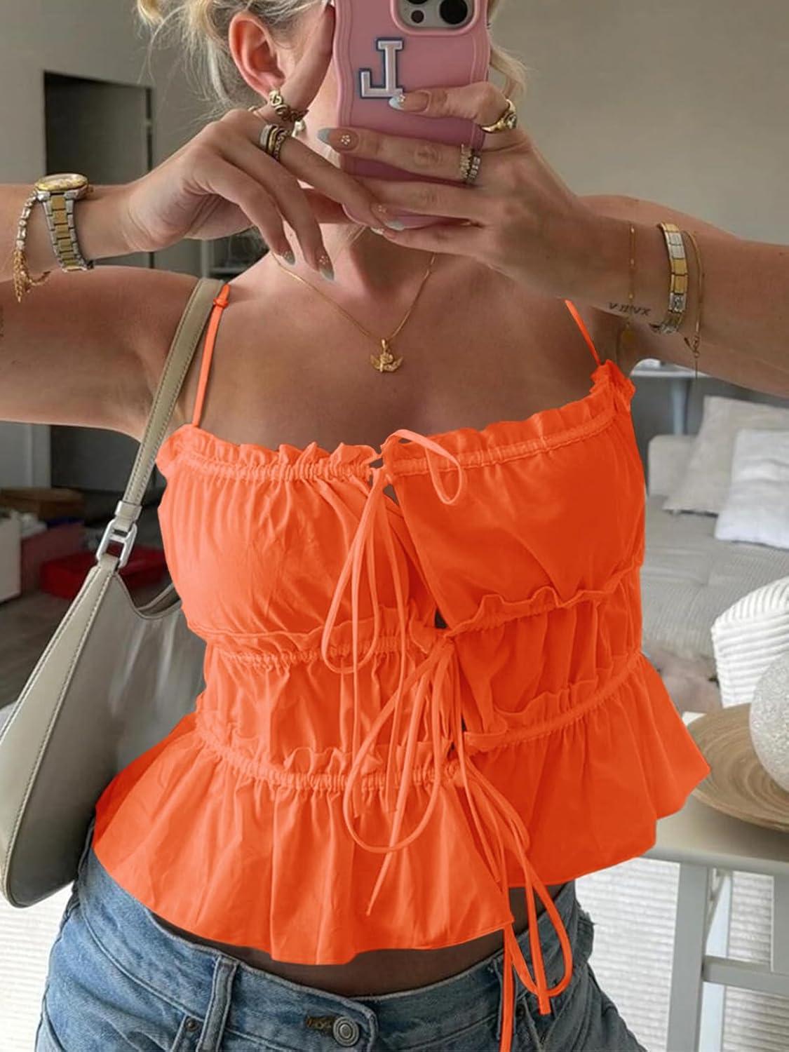 Tankaneo Womens Summer Tie Front Crop Tops Cute Ruffle Ruched Spaghetti Strap Tank Tops Y2K Going Out Shirts(Orange)
