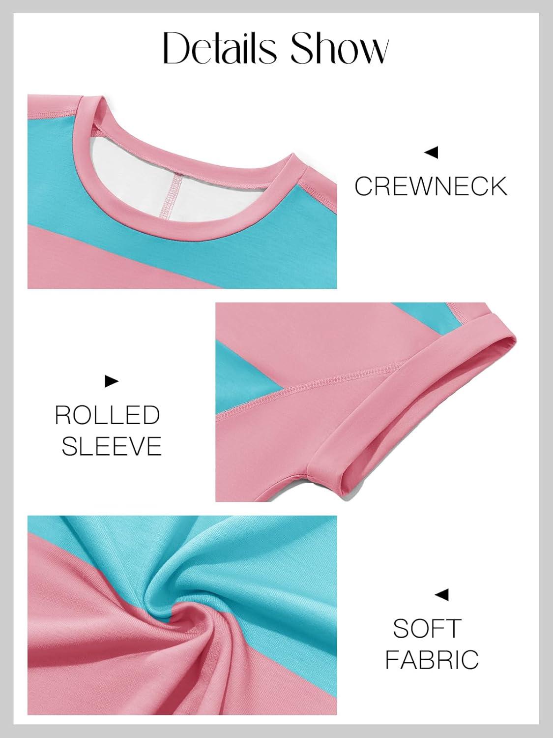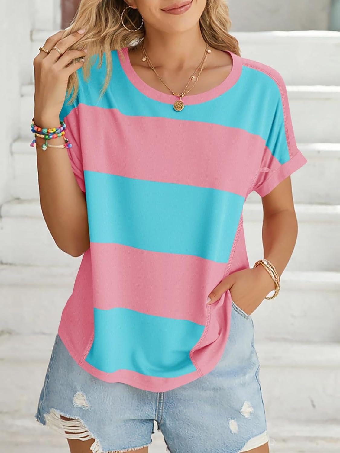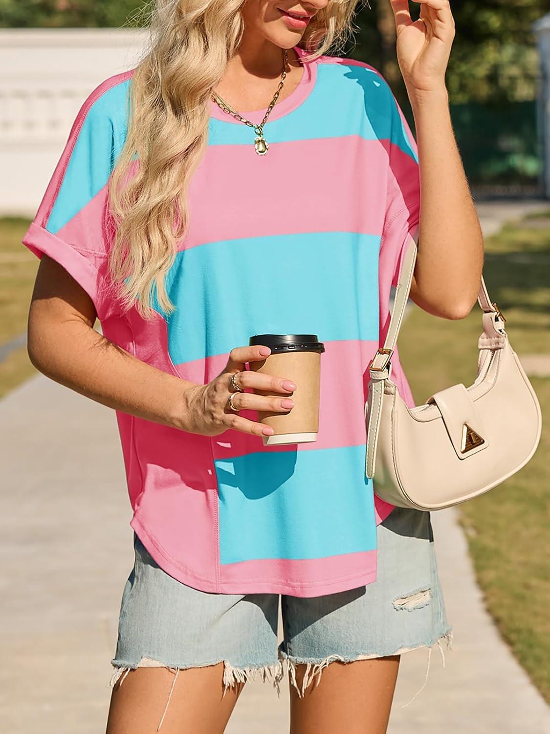 Tankaneo Womens Summer Tops Striped Oversized Short Sleeve Crew Neck Color Block Casual T Shirts Loose Basic Tee Blouses(Naked Pink)