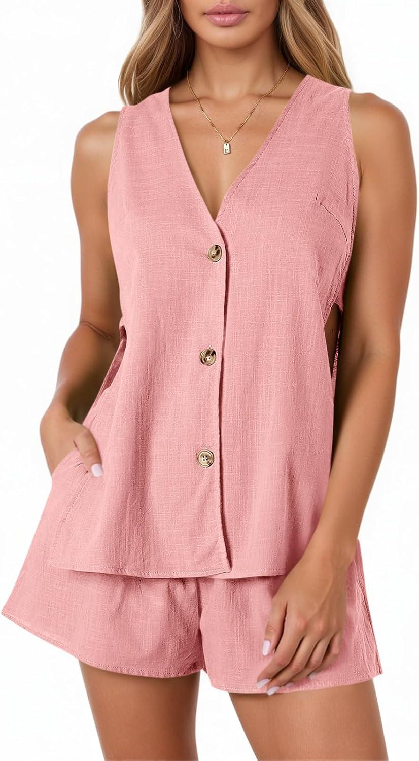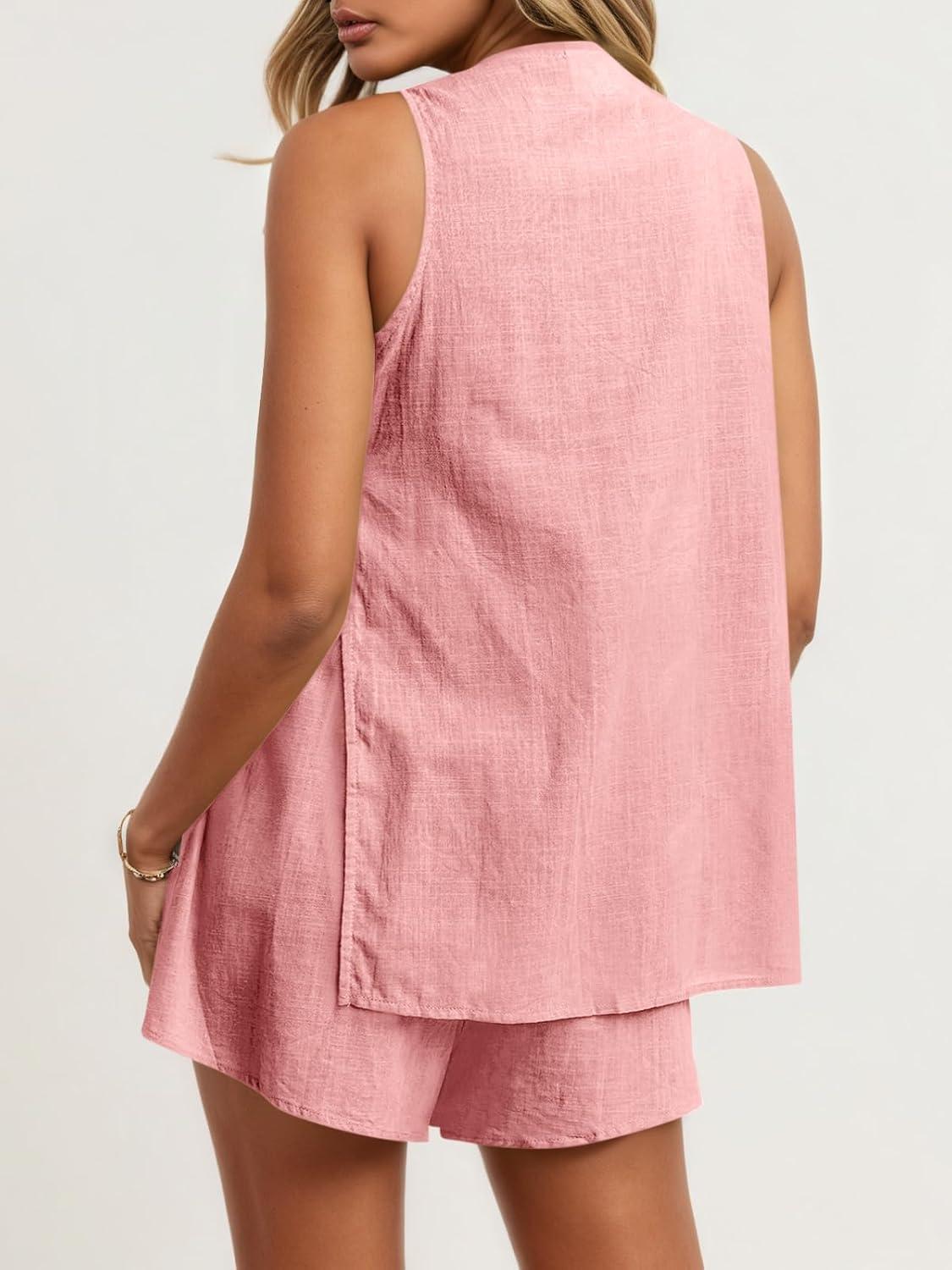 Tankaneo Womens Summer Vacation Outfits Beach Travel Cruise Resort Wear 2 Piece Short Sets Casual Tank Tops and Shorts(Pink)