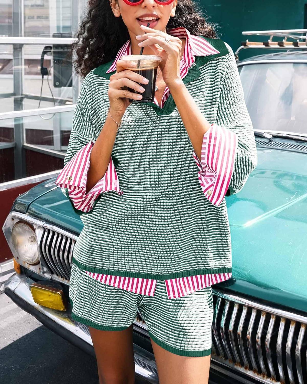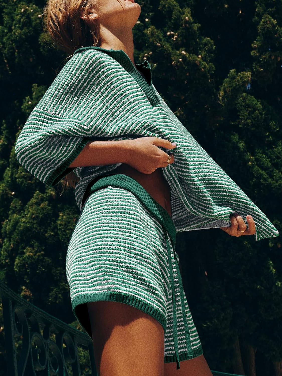 Tankaneo Womens Sweater Set 2 Piece Outfits Oversized 3/4 Sleeve V Neck Knit Tops High Waisted Shorts Lounge Sets(Dark Green)