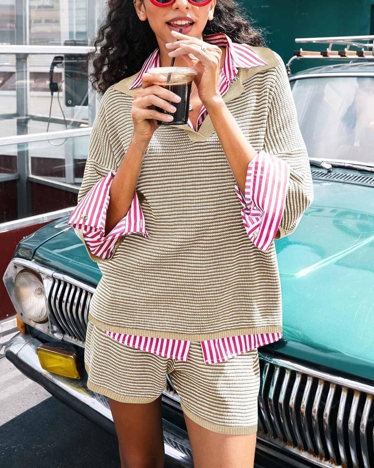 Tankaneo Womens Sweater Set 2 Piece Outfits Oversized 3/4 Sleeve V Neck Knit Tops High Waisted Shorts Lounge Sets(Khaki)
