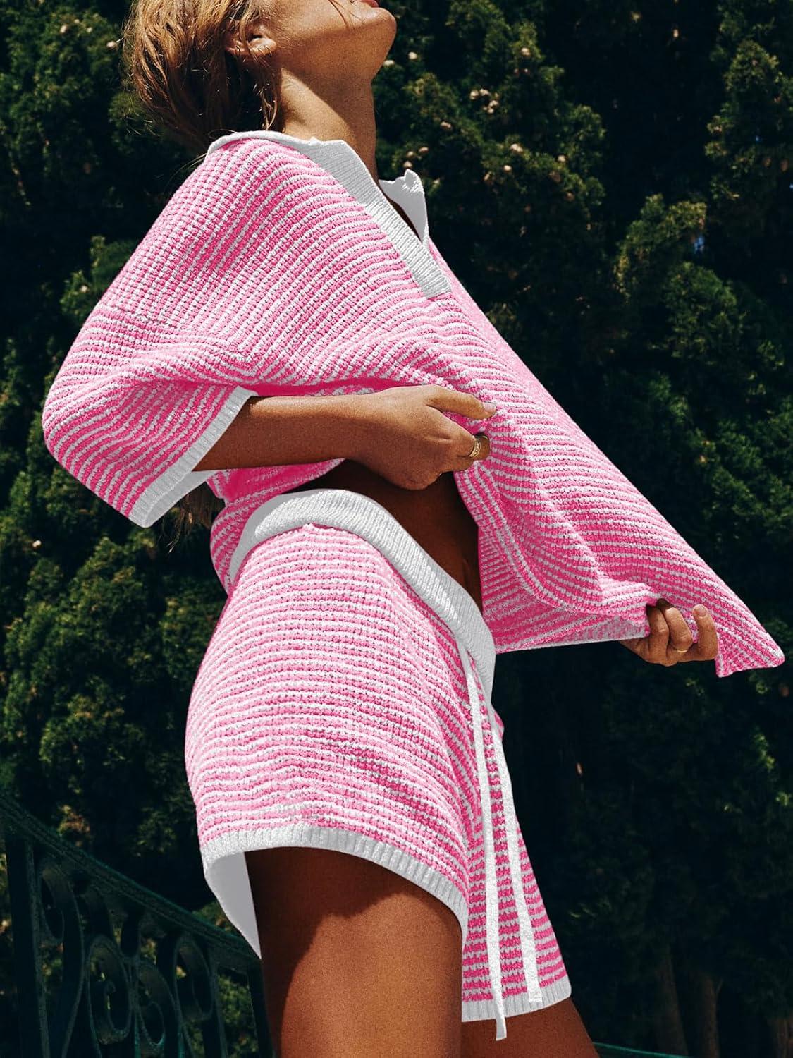 Tankaneo Womens Sweater Set 2 Piece Outfits Oversized 3/4 Sleeve V Neck Knit Tops High Waisted Shorts Lounge Sets(Light Pink)