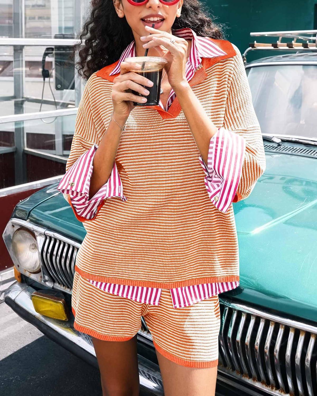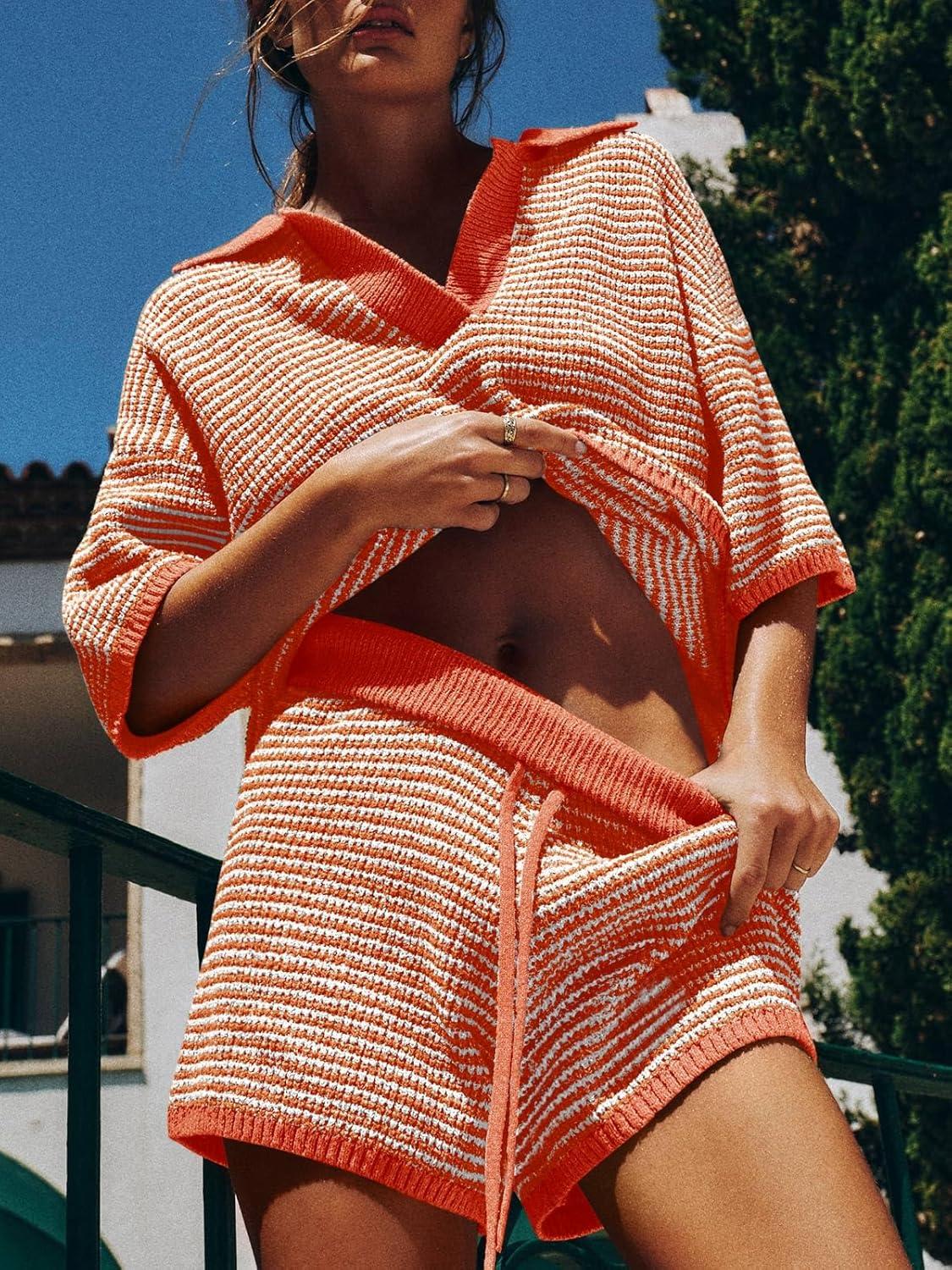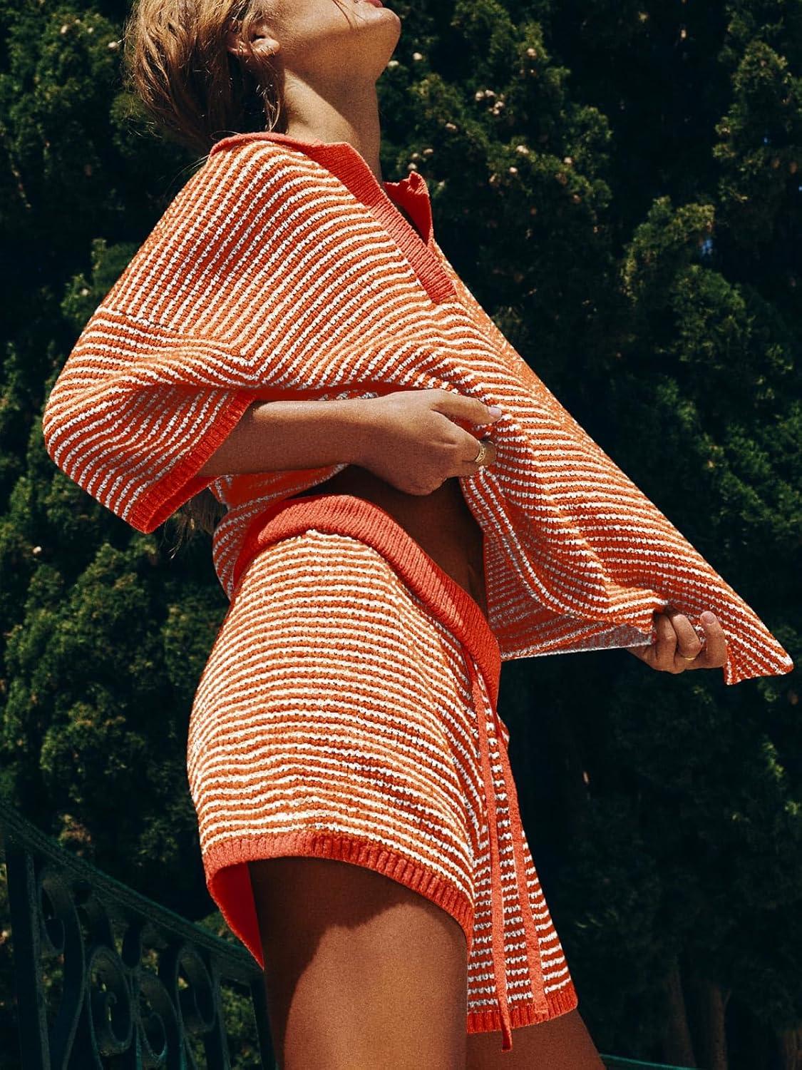 Tankaneo Womens Sweater Set 2 Piece Outfits Oversized 3/4 Sleeve V Neck Knit Tops High Waisted Shorts Lounge Sets(Orange-white)