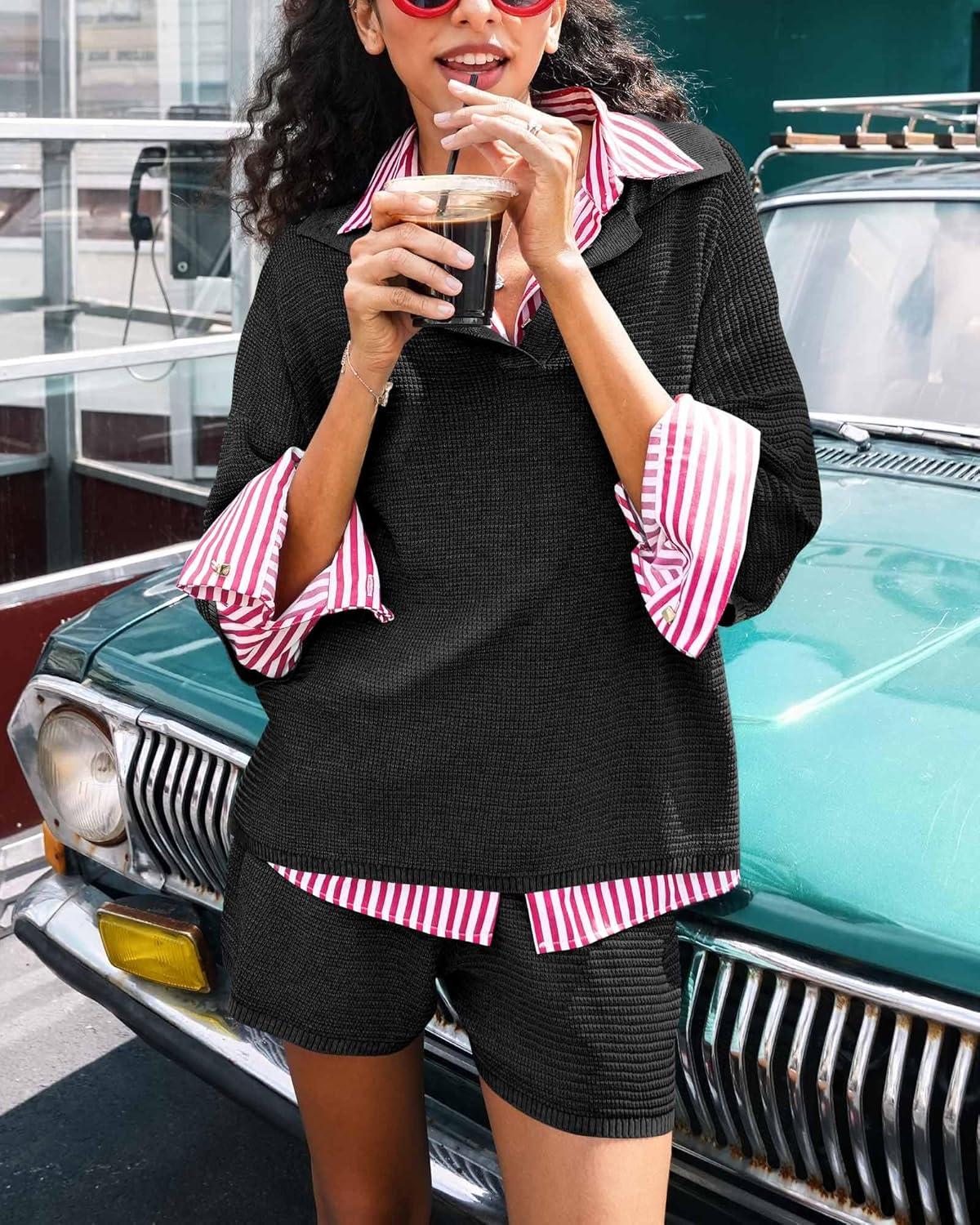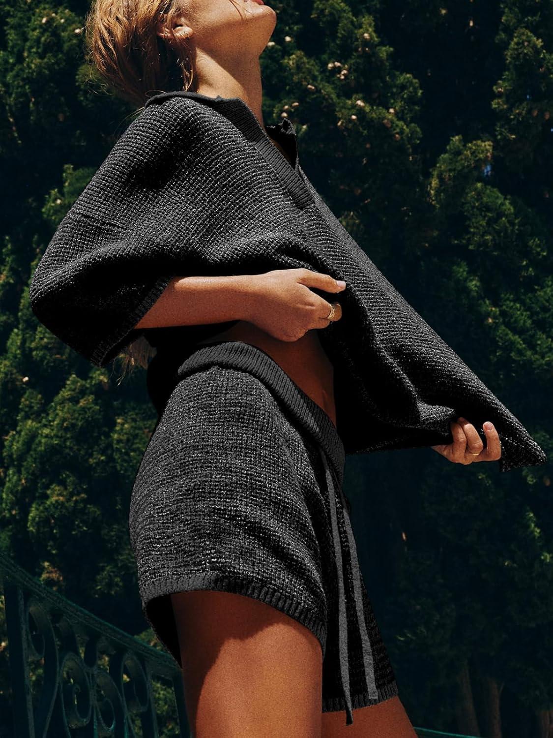 Tankaneo Womens Sweater Set 2 Piece Outfits Oversized 3/4 Sleeve V Neck Knit Tops High Waisted Shorts Lounge Sets(Pure Black)