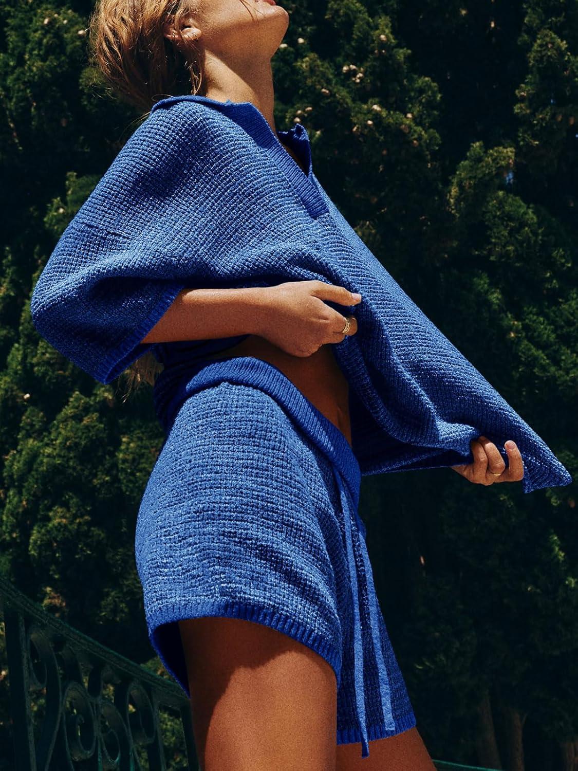 Tankaneo Womens Sweater Set 2 Piece Outfits Oversized 3/4 Sleeve V Neck Knit Tops High Waisted Shorts Lounge Sets(Pure Blue)