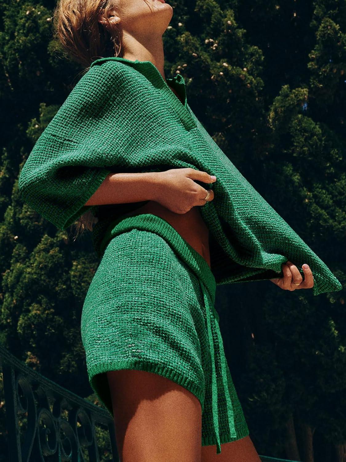 Tankaneo Womens Sweater Set 2 Piece Outfits Oversized 3/4 Sleeve V Neck Knit Tops High Waisted Shorts Lounge Sets(Pure Green)