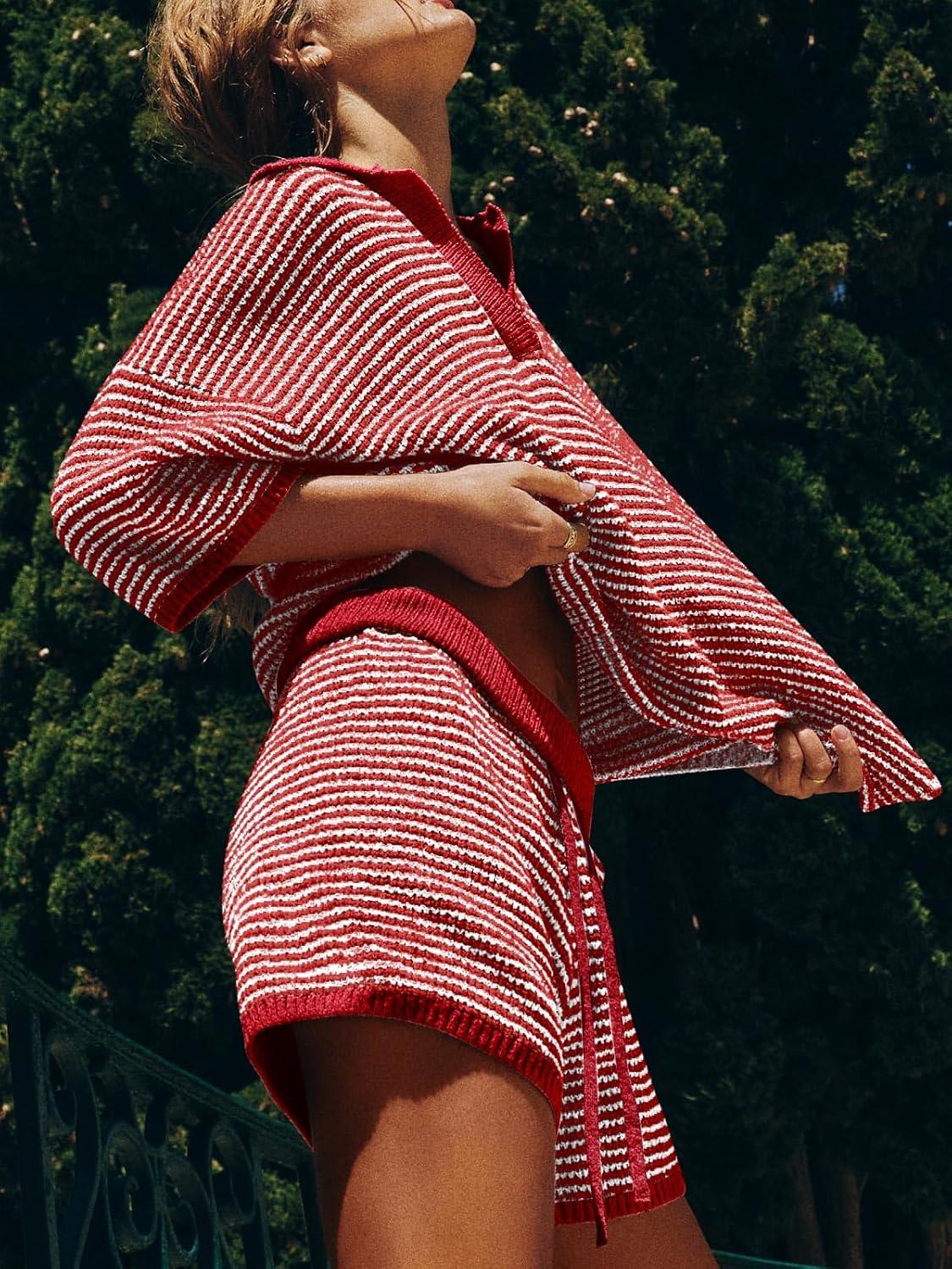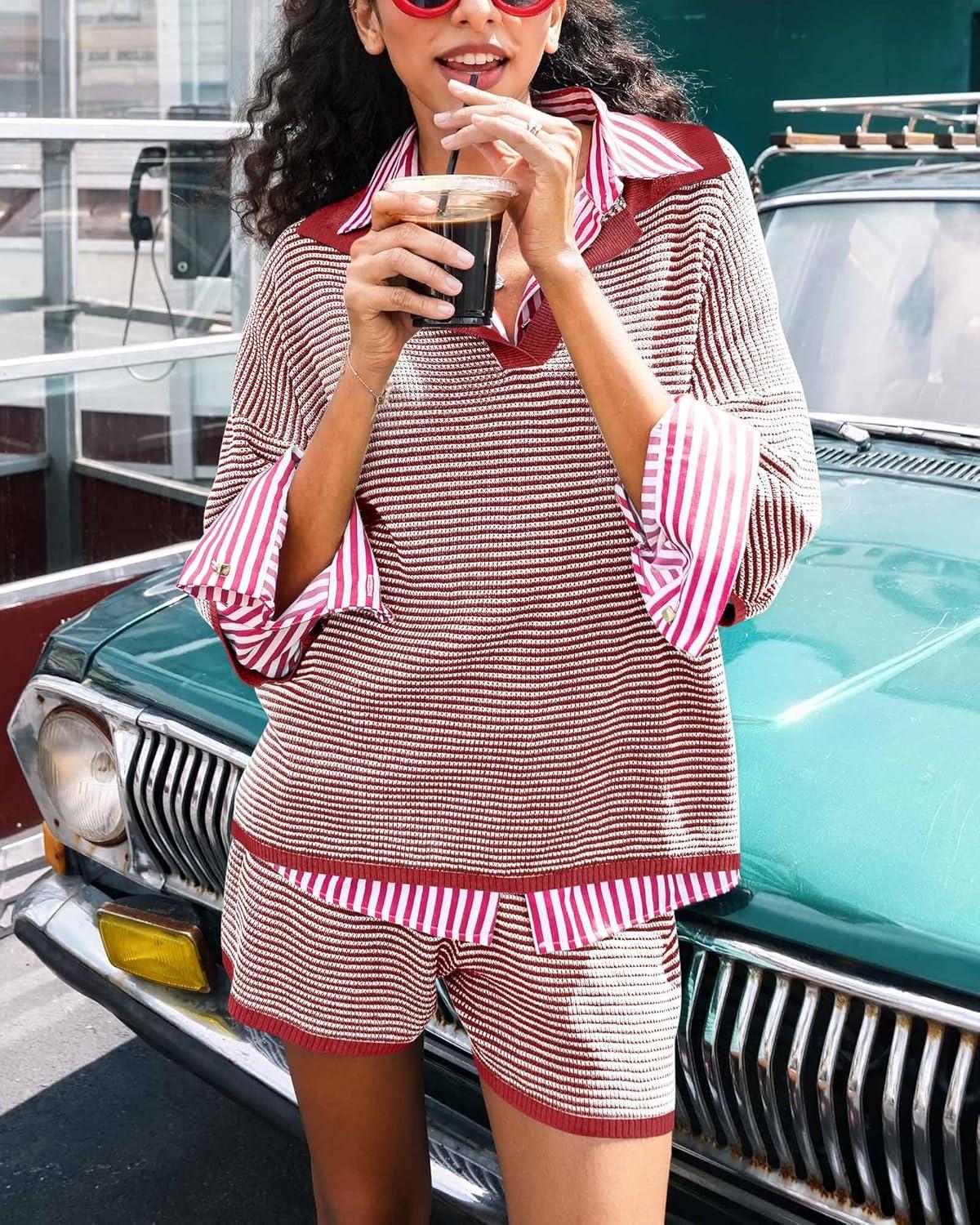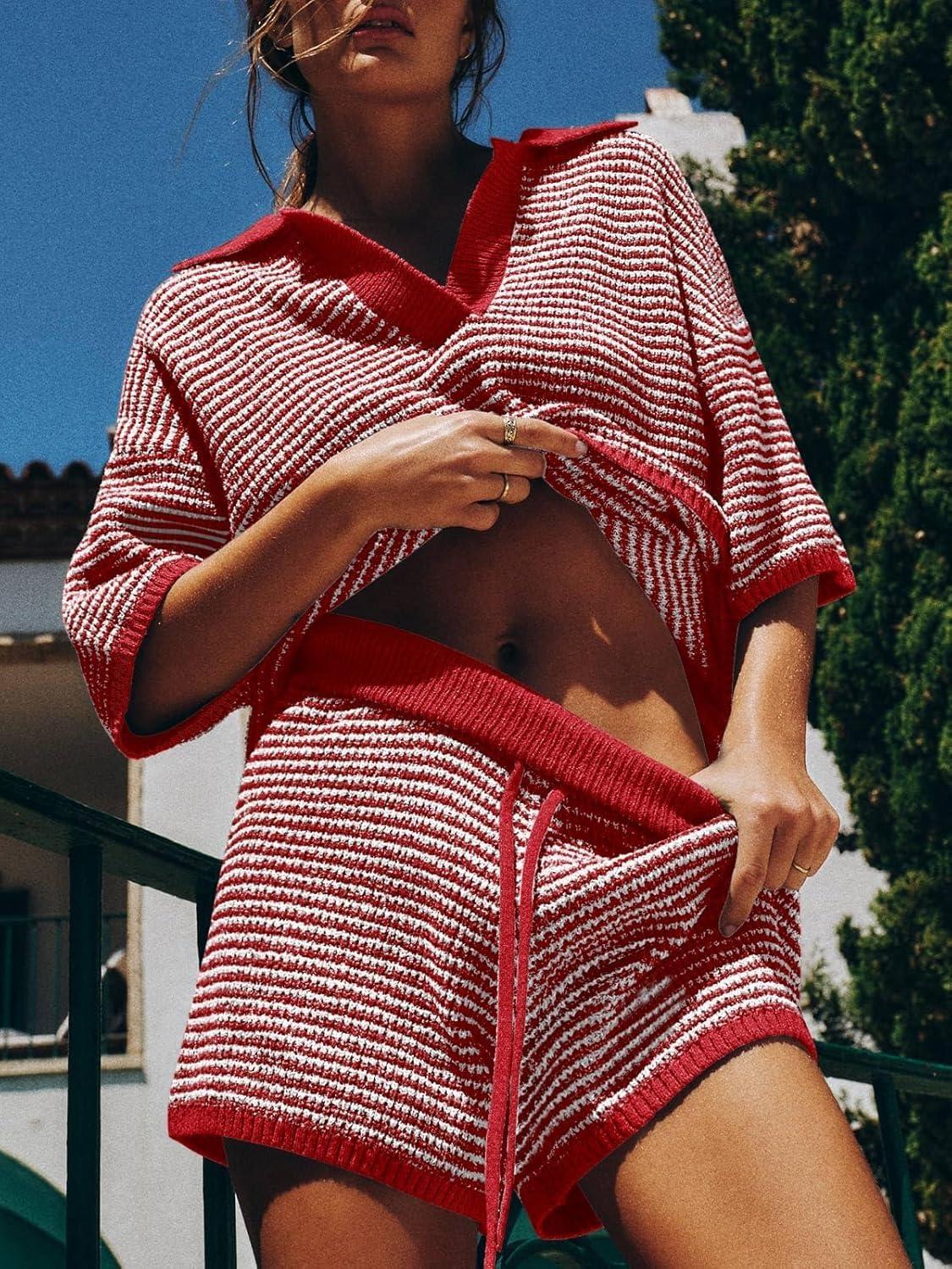 Tankaneo Womens Sweater Set 2 Piece Outfits Oversized 3/4 Sleeve V Neck Knit Tops High Waisted Shorts Lounge Sets(Red-white)