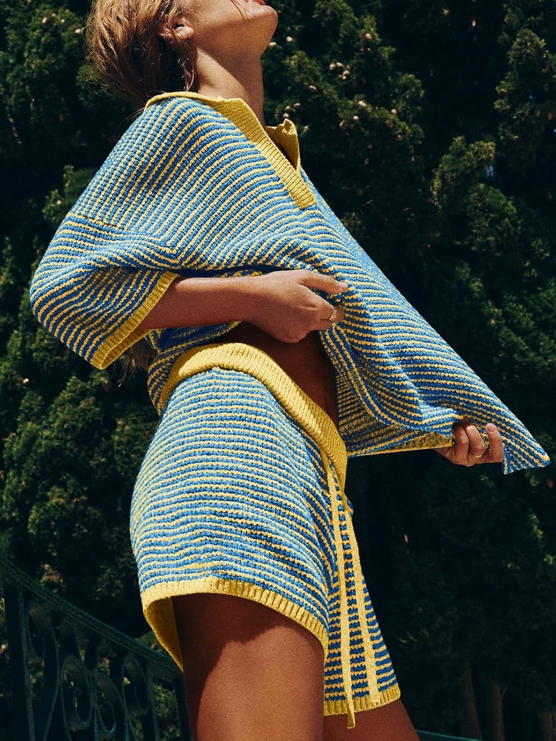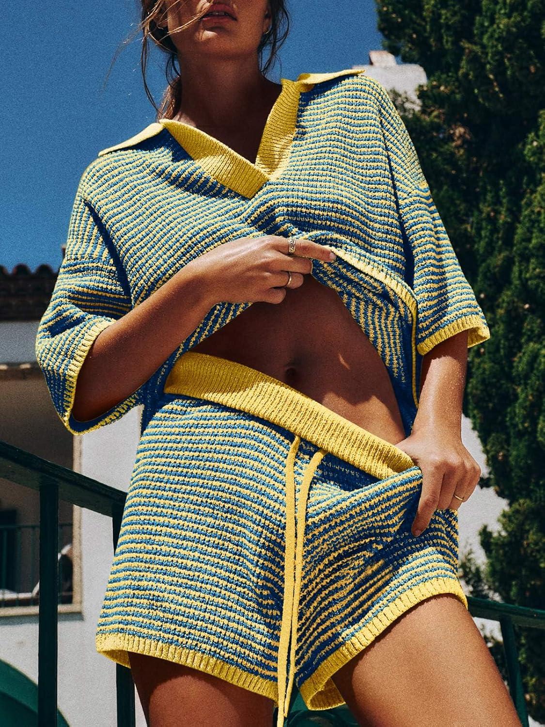 Tankaneo Womens Sweater Set 2 Piece Outfits Oversized 3/4 Sleeve V Neck Knit Tops High Waisted Shorts Lounge Sets(Royal Blue-yellow)