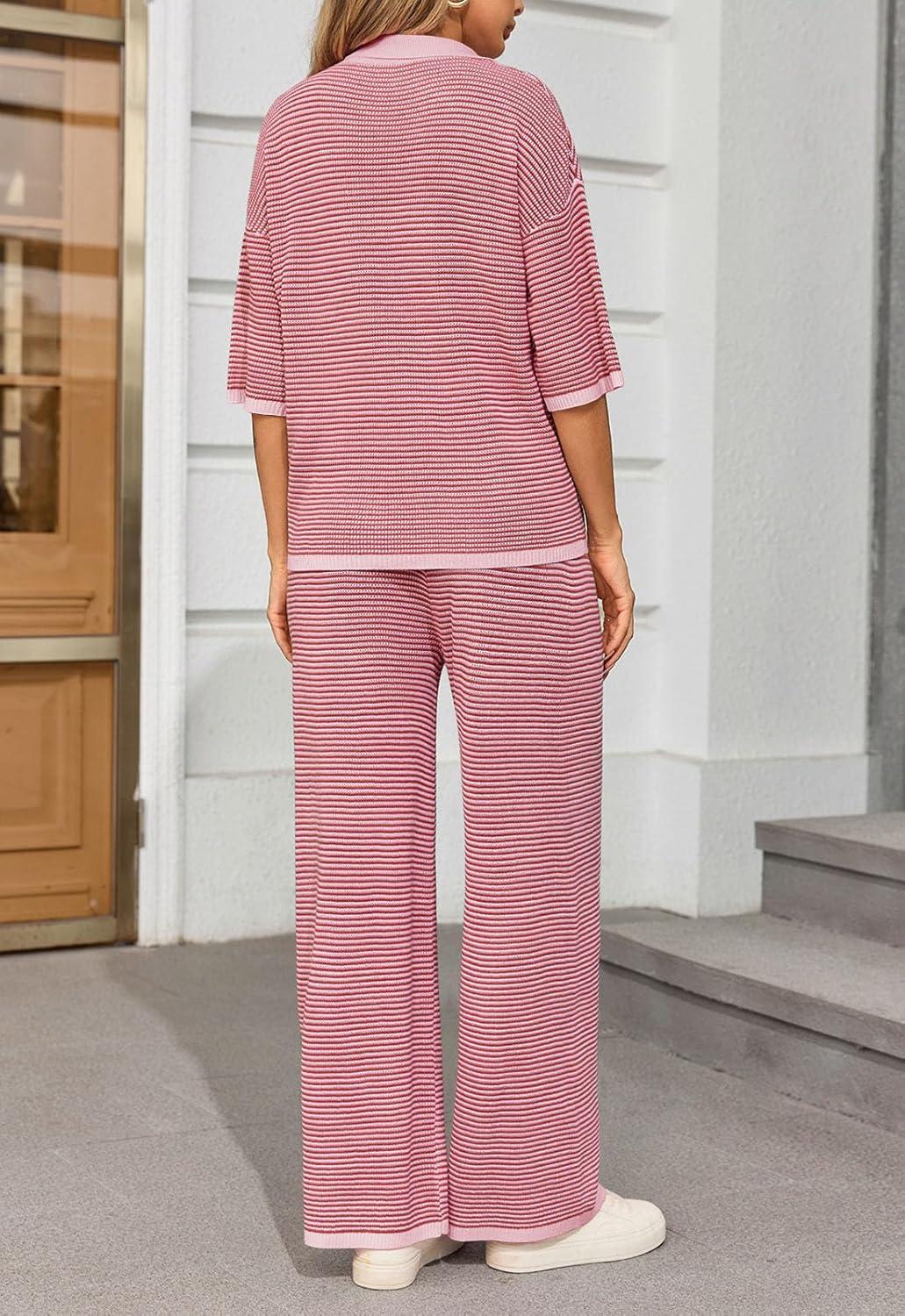 Tankaneo Womens Sweater Set Striped 2 Piece Outfits Oversized 3/4 Sleeve V Neck Knit Tops Wide Leg Pants Fall Lounge Sets(Pink)