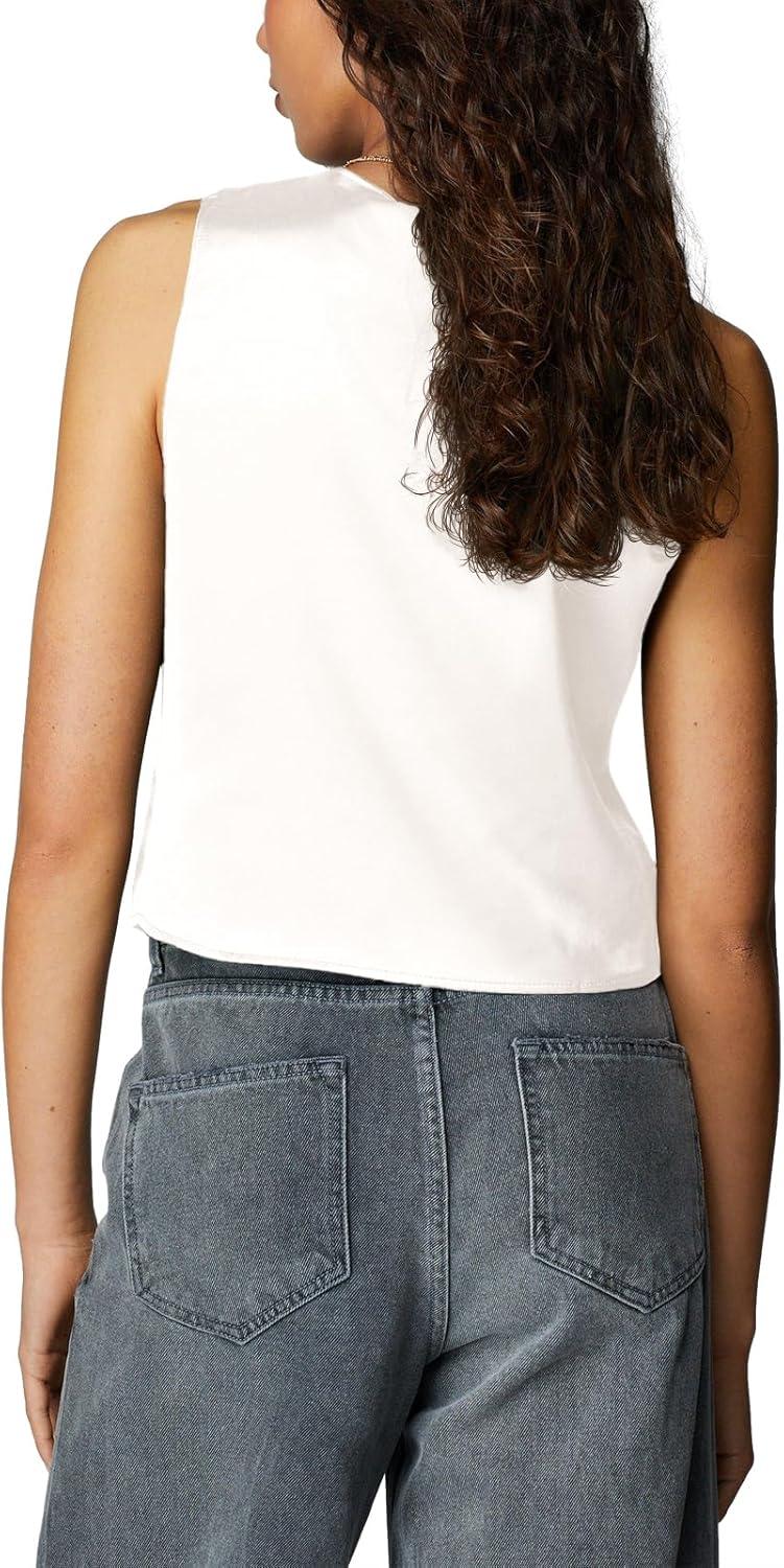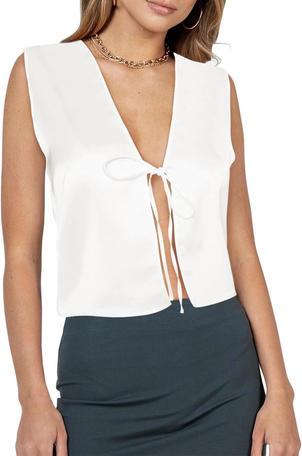 Tankaneo Womens Tie Front Tank Tops Summer V Neck Satin Sleeveless Club Sexy Y2K Cami Crop Tops(White)