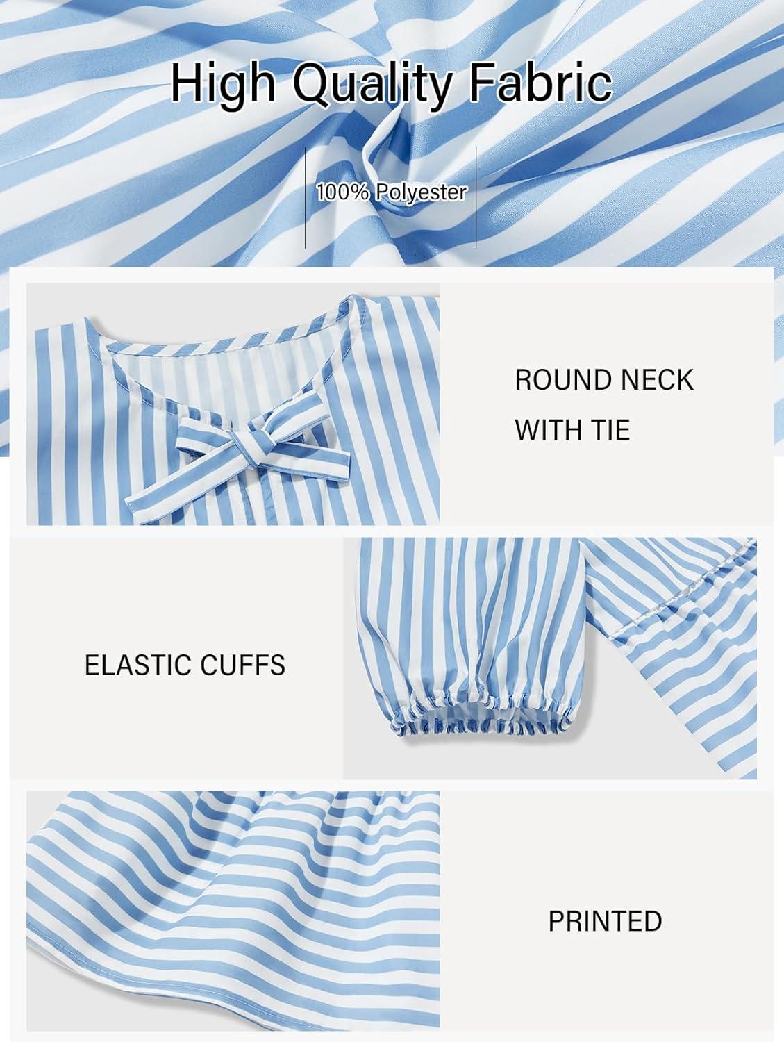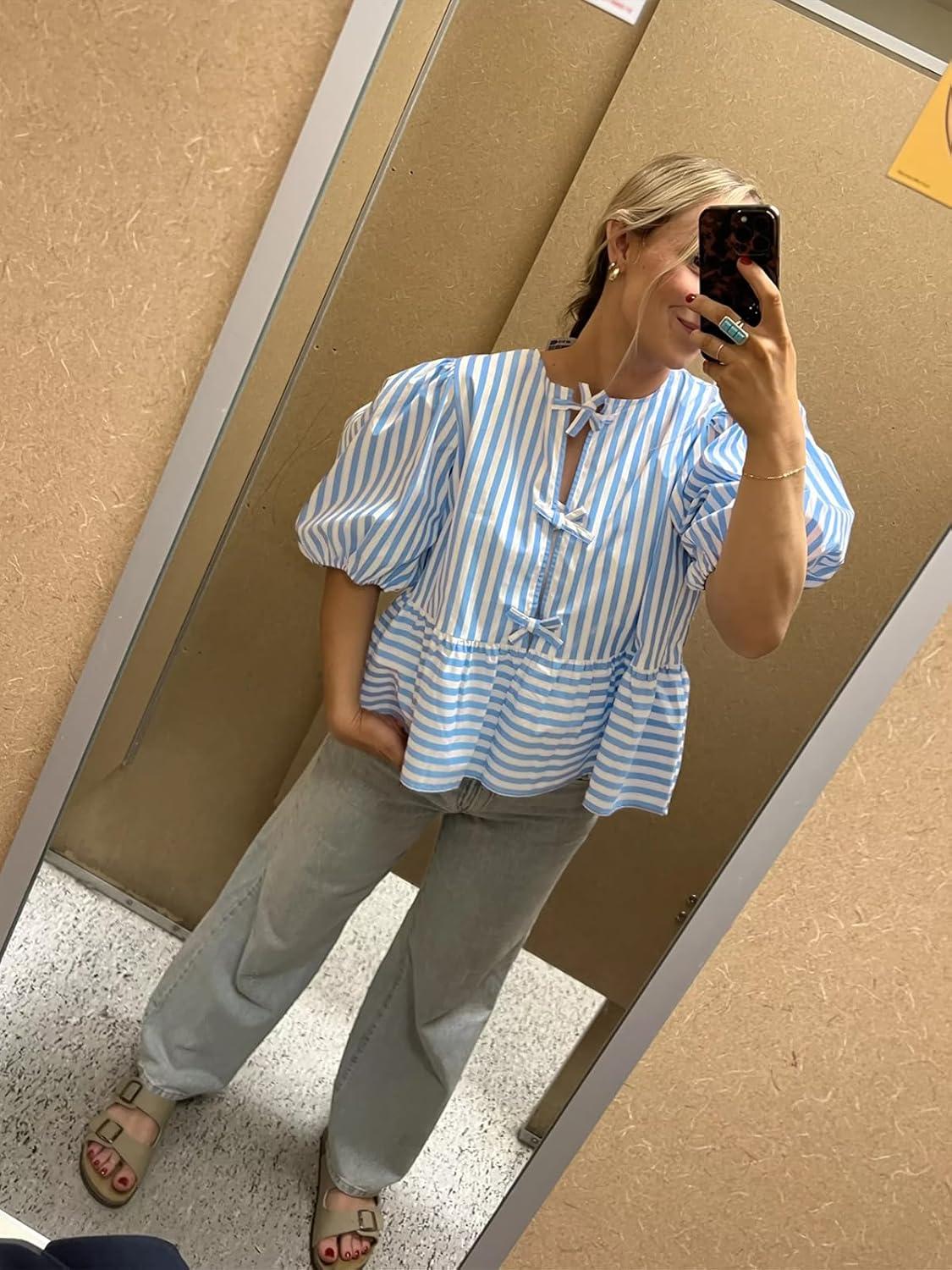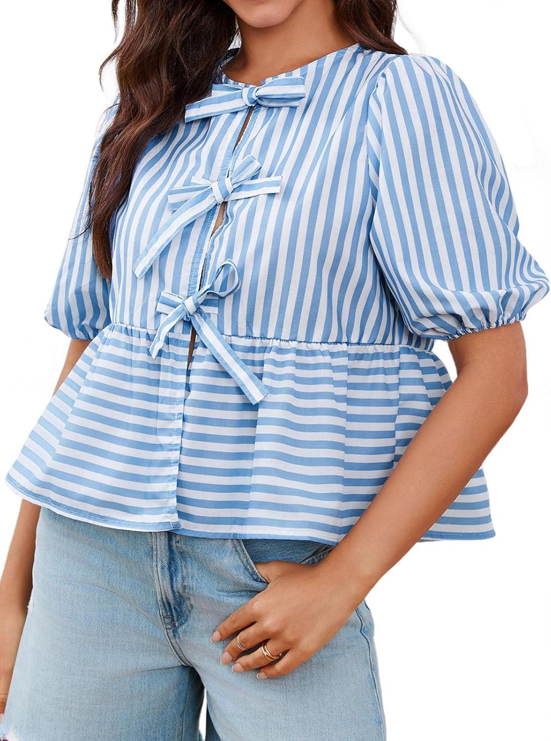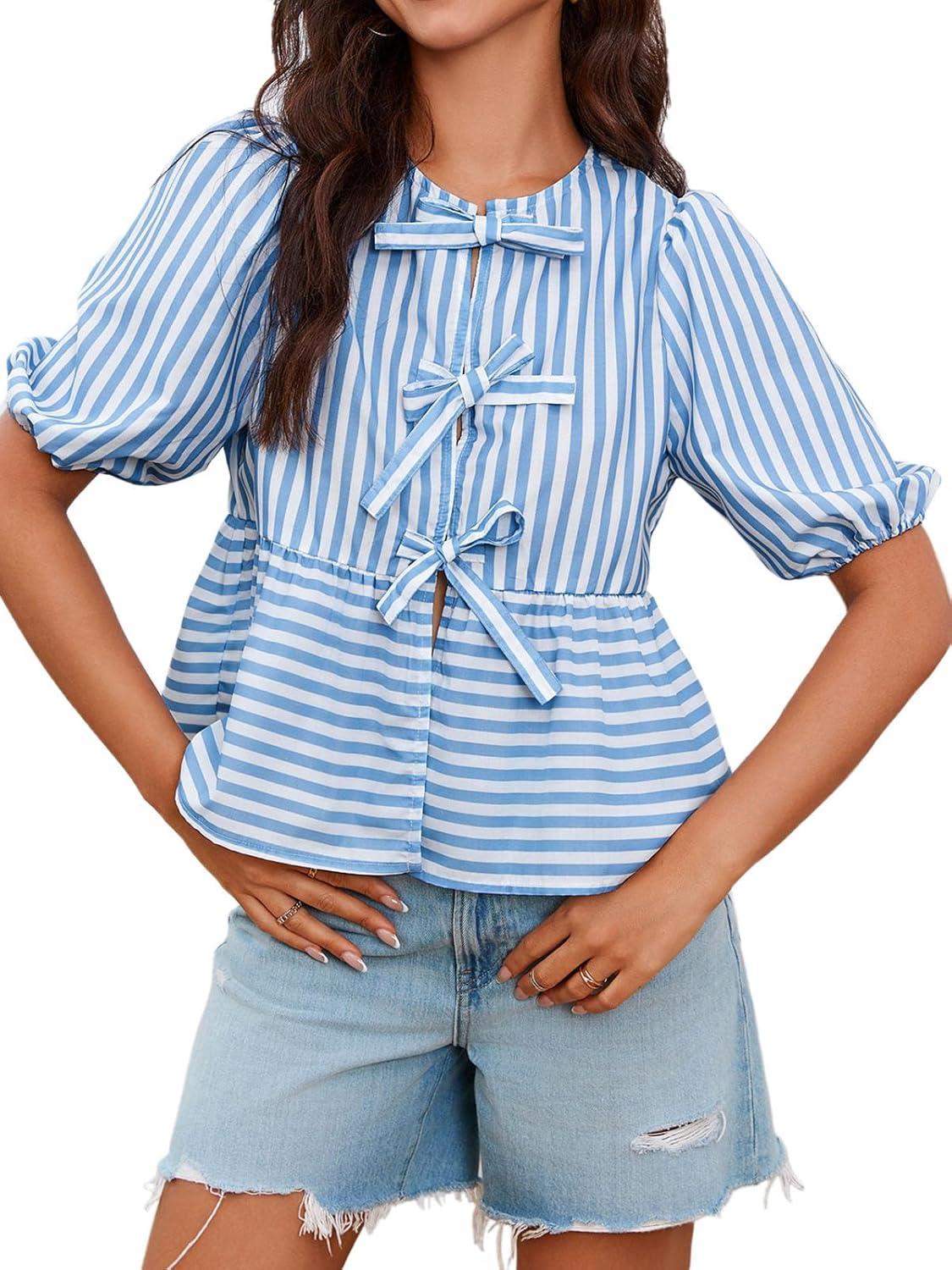 Tankaneo Womens Tie Front Tops Summer Peplum Babydoll Puff Short Sleeve Blouse Cute Cotton Shirts(Blue Striped)