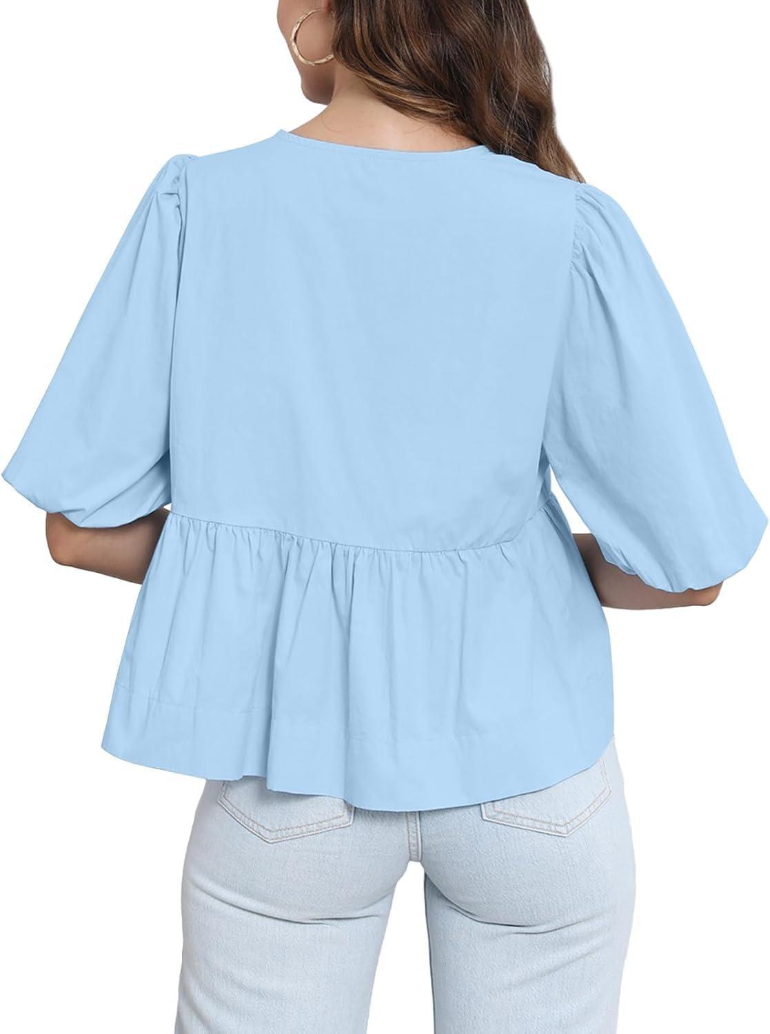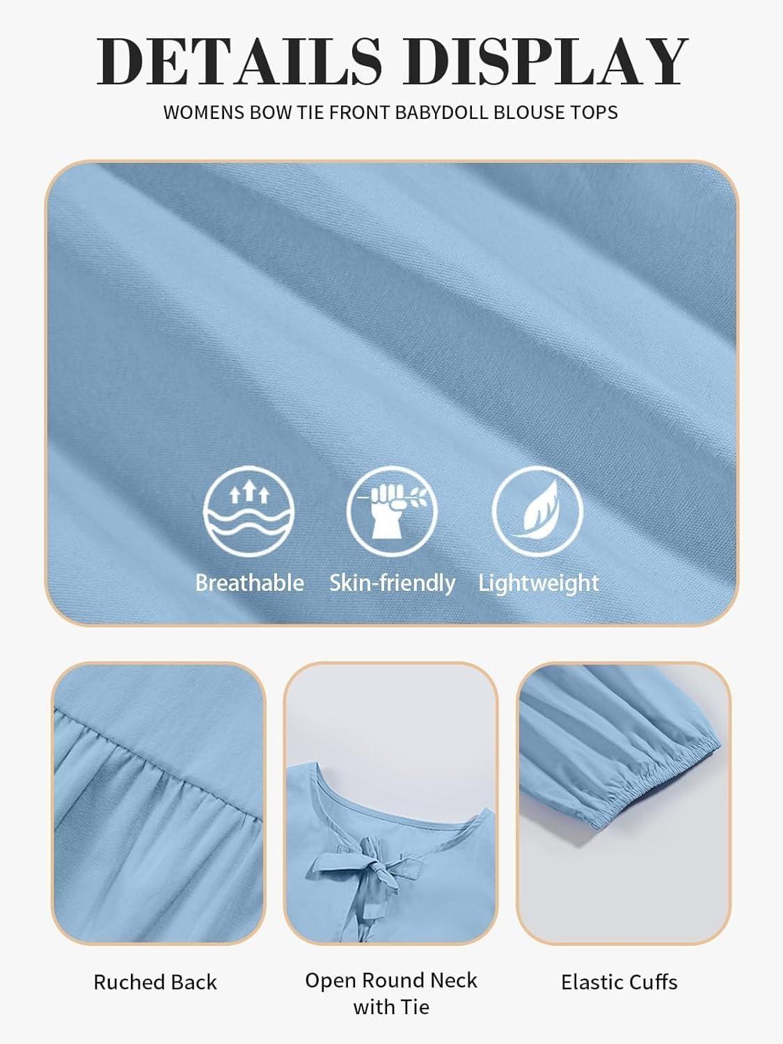 Tankaneo Womens Tie Front Tops Summer Peplum Babydoll Puff Short Sleeve Blouse Cute Cotton Shirts(Blue)