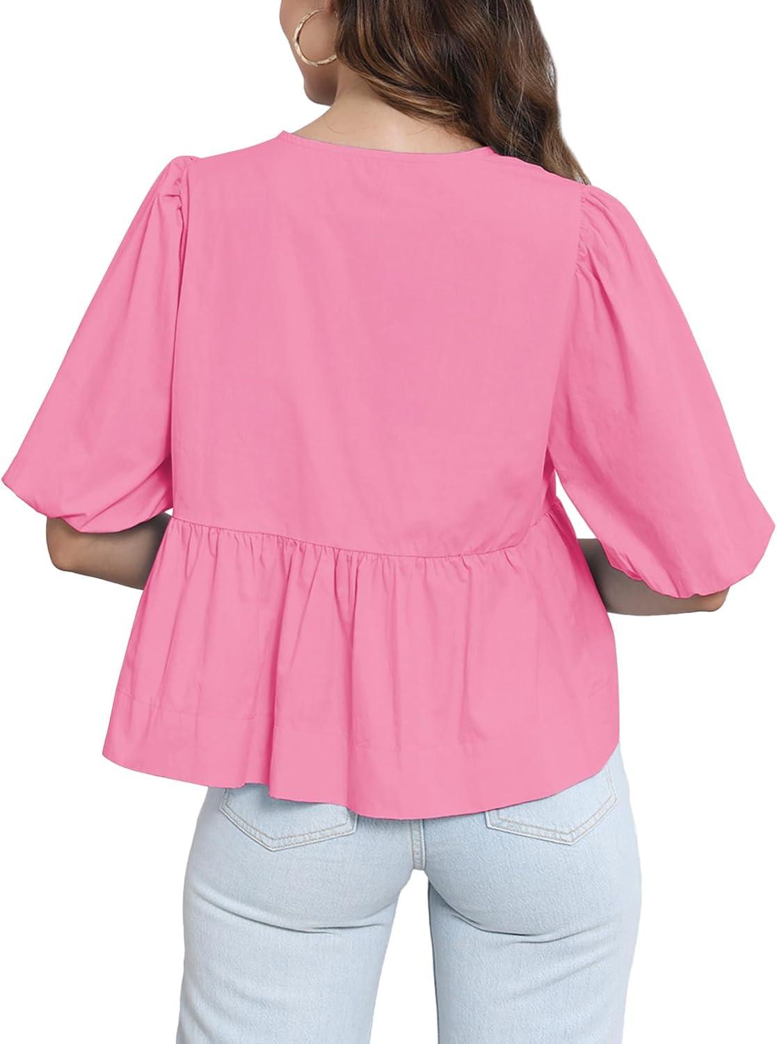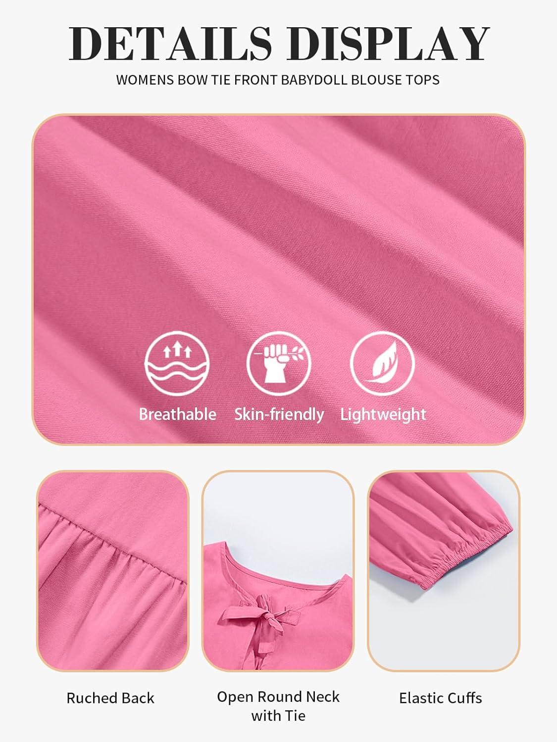 Tankaneo Womens Tie Front Tops Summer Peplum Babydoll Puff Short Sleeve Blouse Cute Cotton Shirts(Hot Pink)