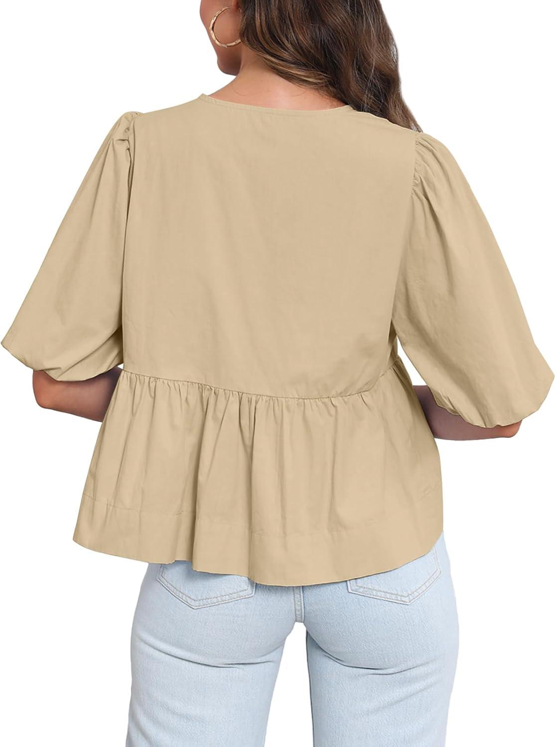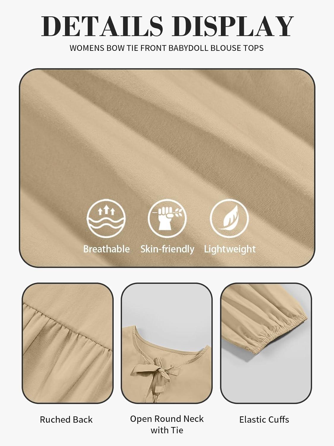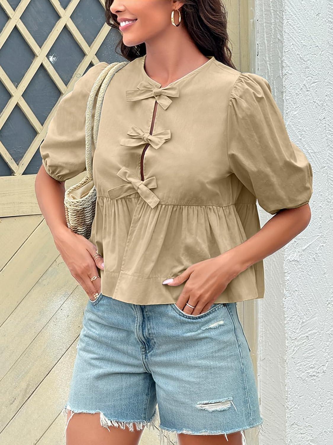 Tankaneo Womens Tie Front Tops Summer Peplum Babydoll Puff Short Sleeve Blouse Cute Cotton Shirts(Khaki)