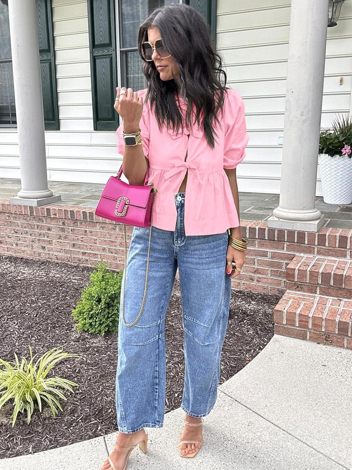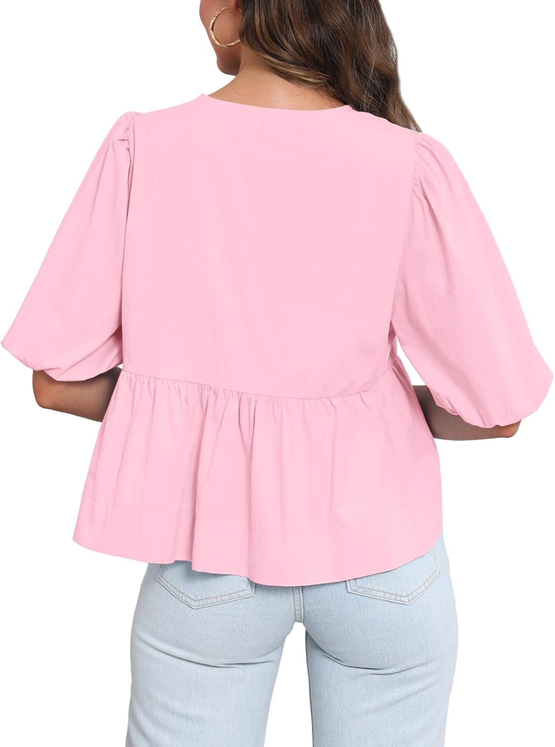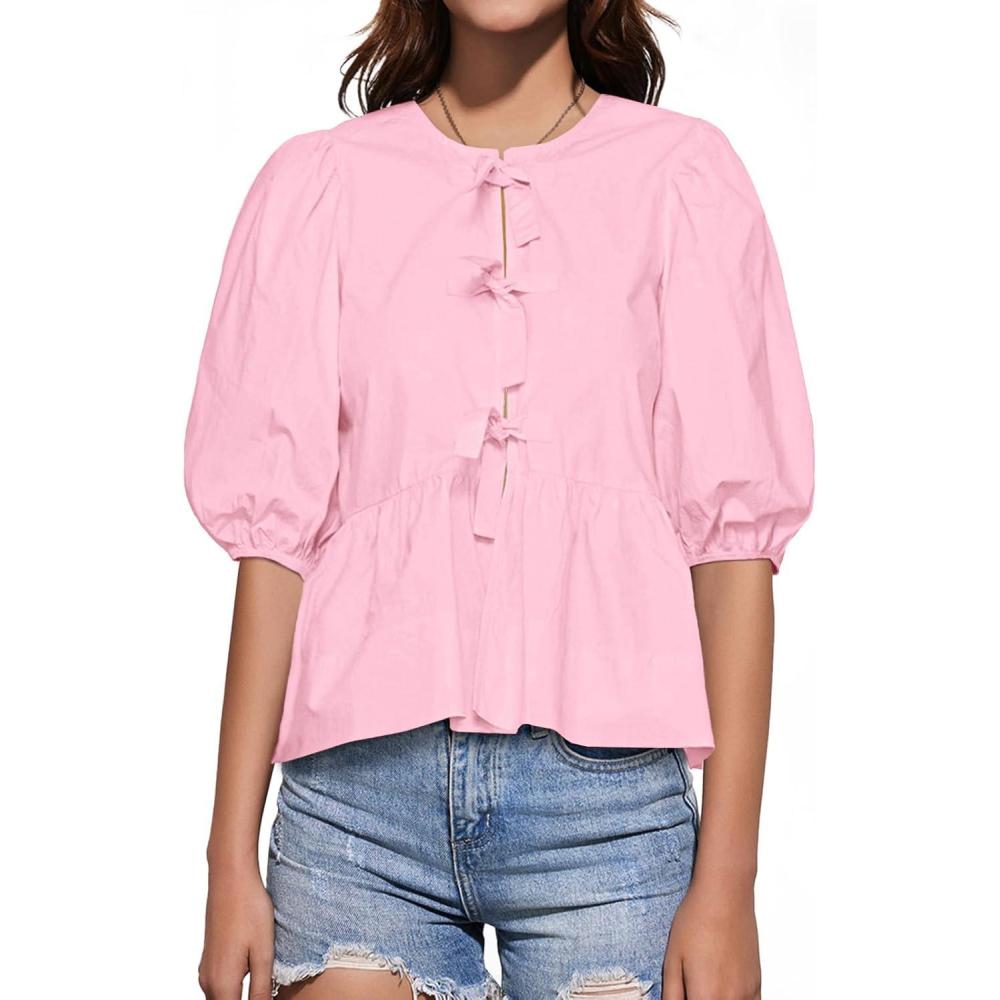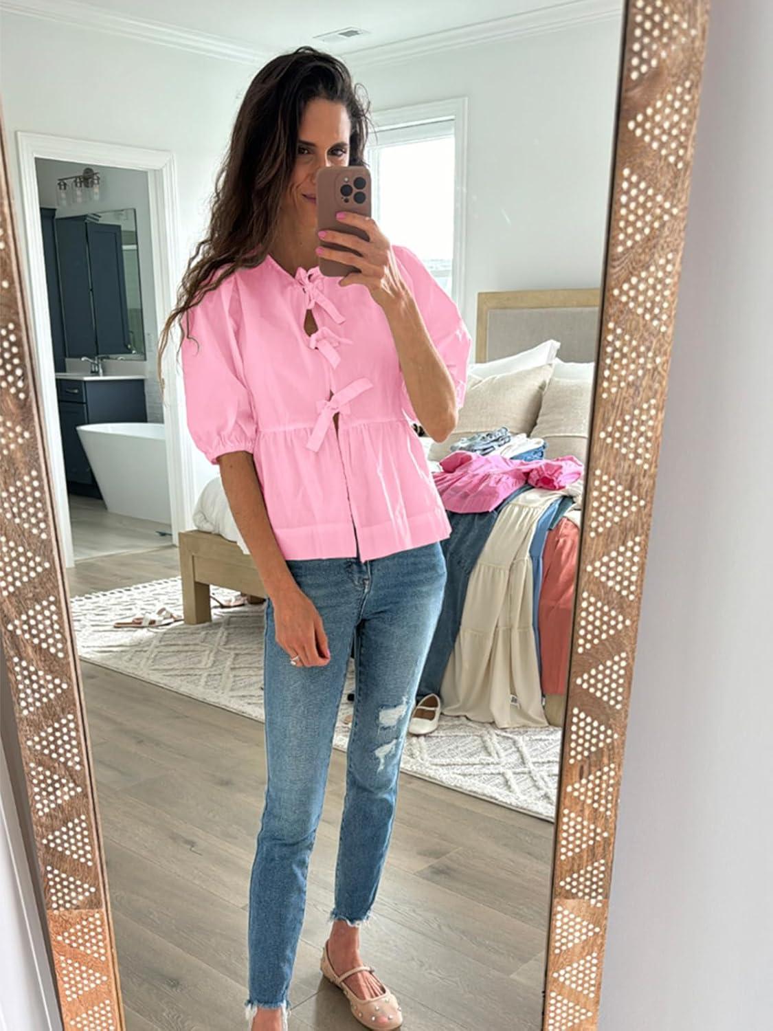 Tankaneo Womens Tie Front Tops Summer Peplum Babydoll Puff Short Sleeve Blouse Cute Cotton Shirts(Pink)