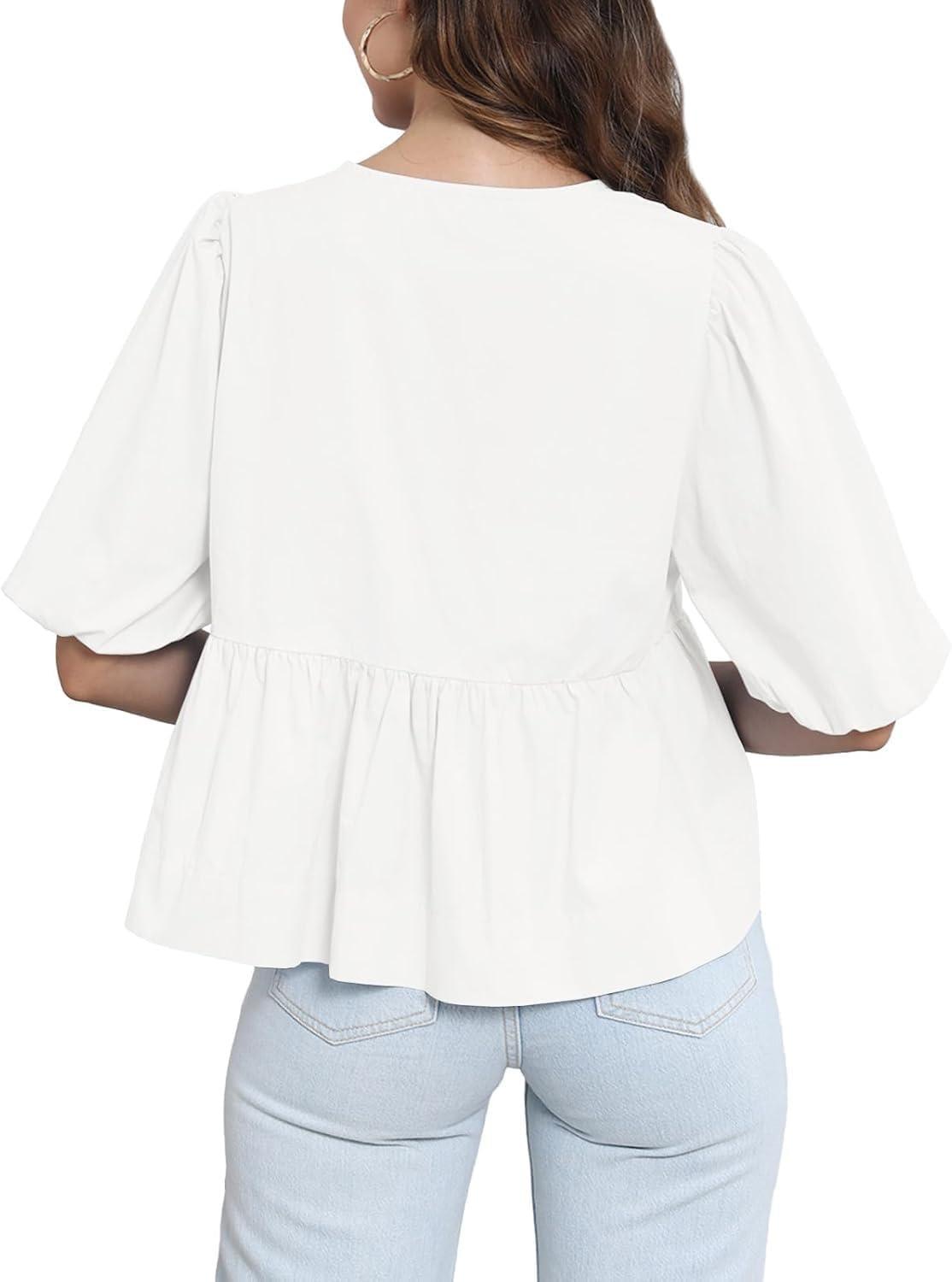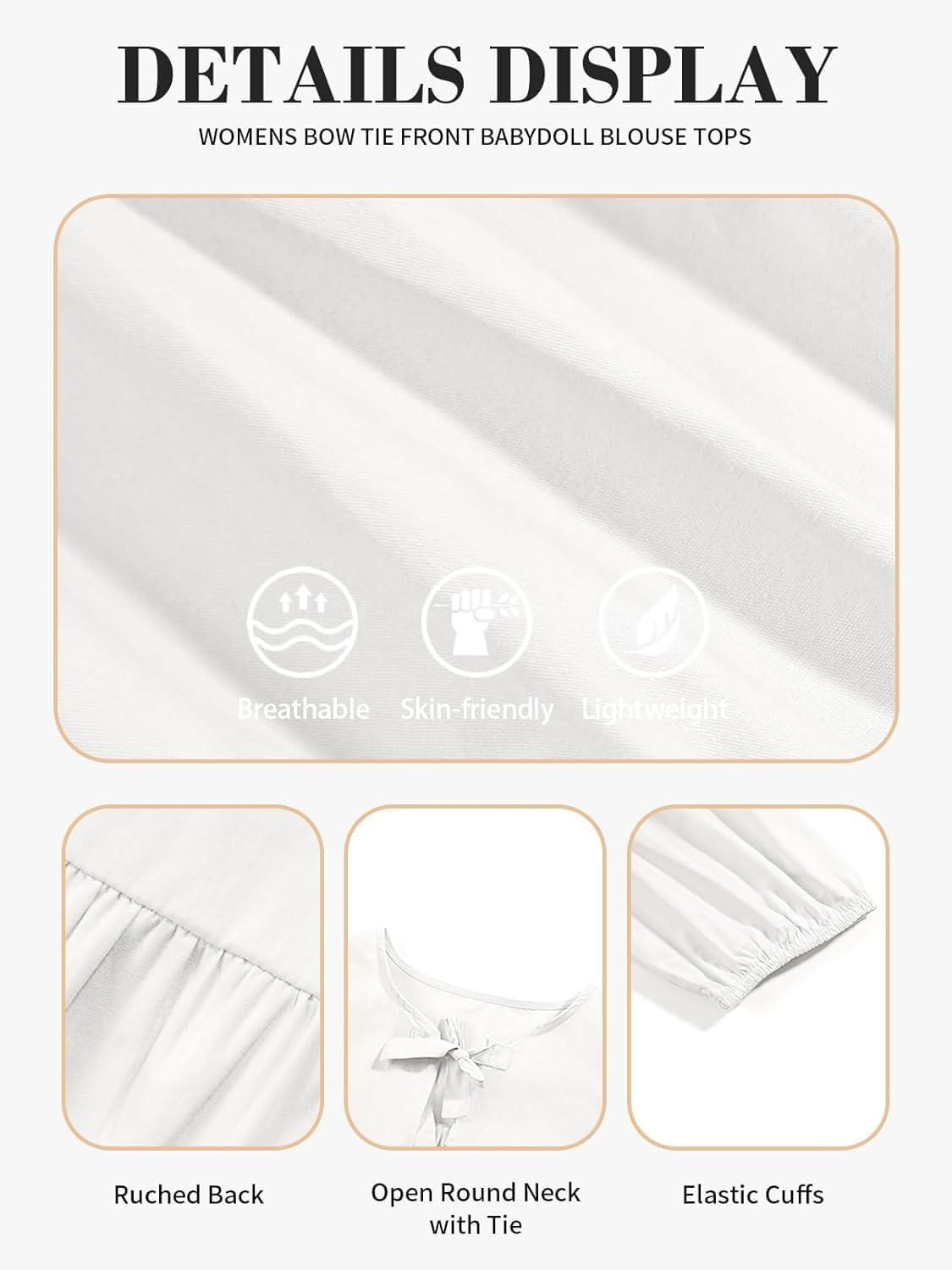 Tankaneo Womens Tie Front Tops Summer Peplum Babydoll Puff Short Sleeve Blouse Cute Cotton Shirts(White)