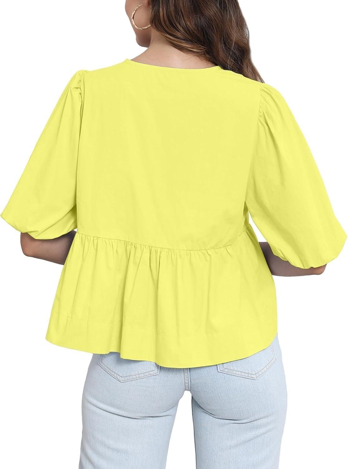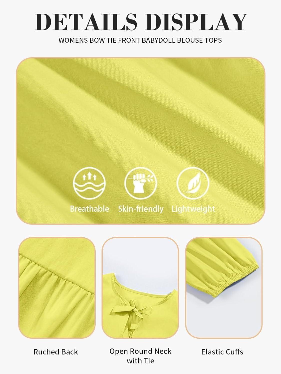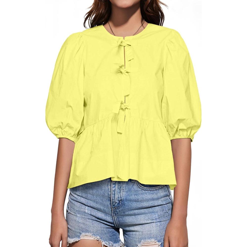 Tankaneo Womens Tie Front Tops Summer Peplum Babydoll Puff Short Sleeve Blouse Cute Cotton Shirts(Yellow)