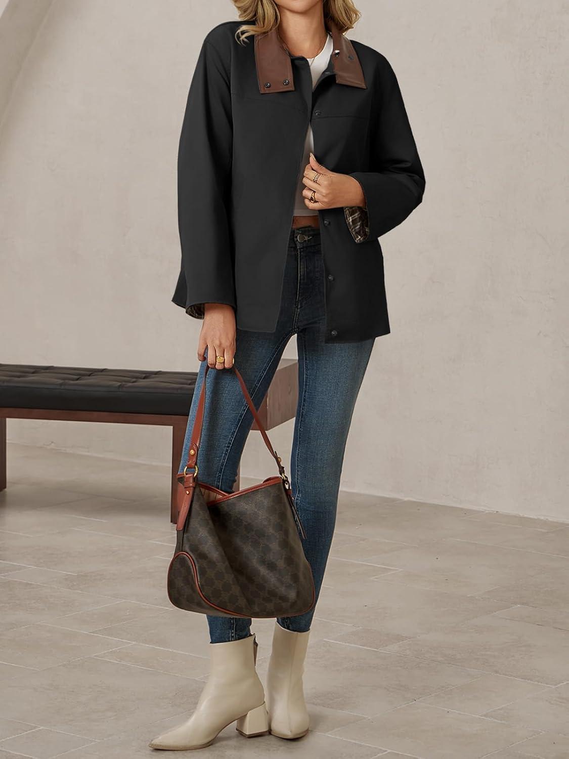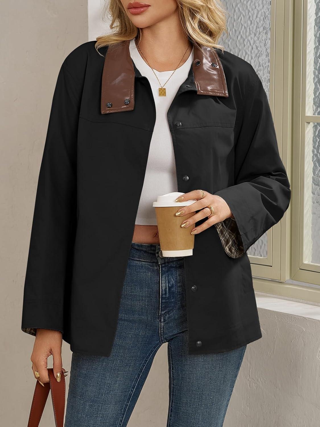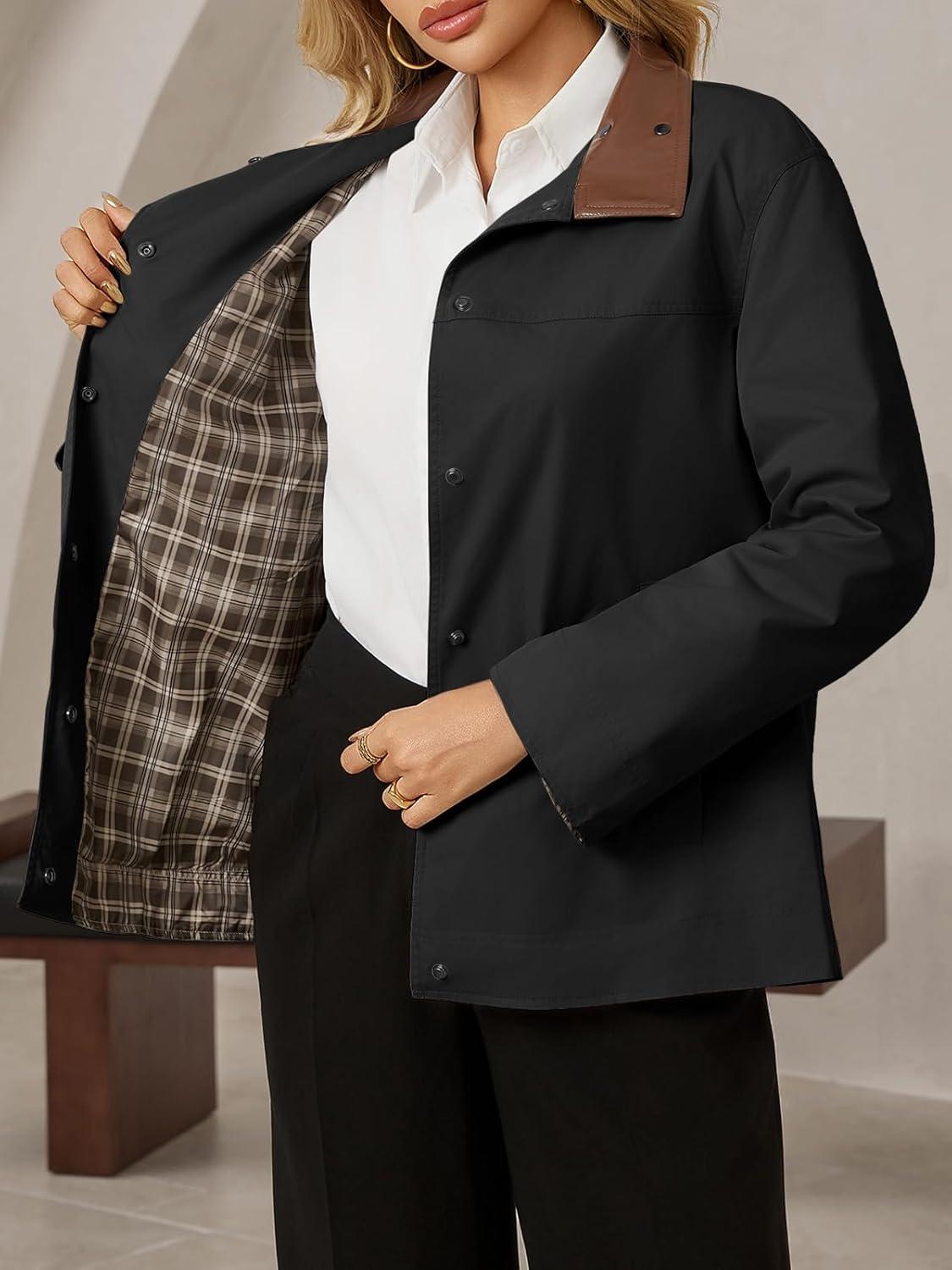 Tankaneo Womens Trench Coat Oversized Fall Barn Jacket Leather Collar Plaid Color Block Windproof Overcoat(Black)