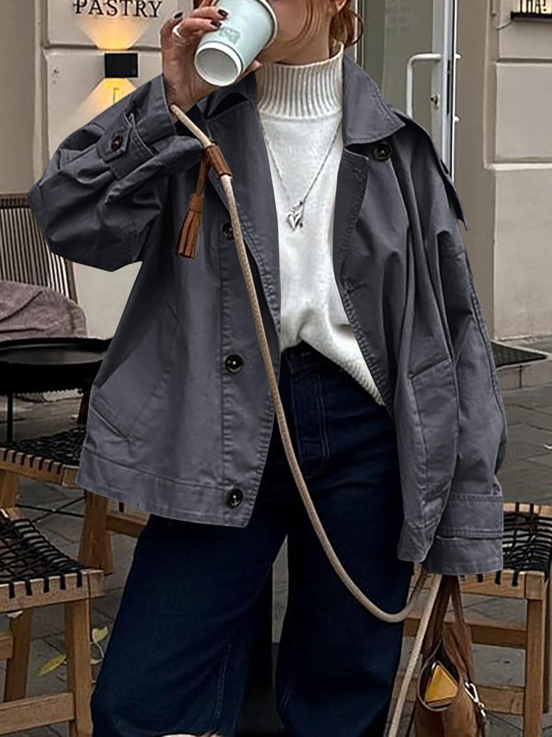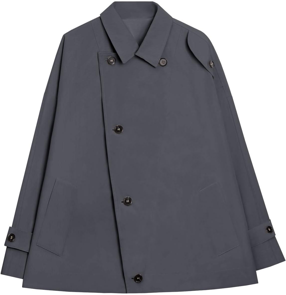Tankaneo Womens Trench Coat Single Breasted Lapel Casual Oversized Coats Short Jacket Fall Outerwear(Dark Grey)