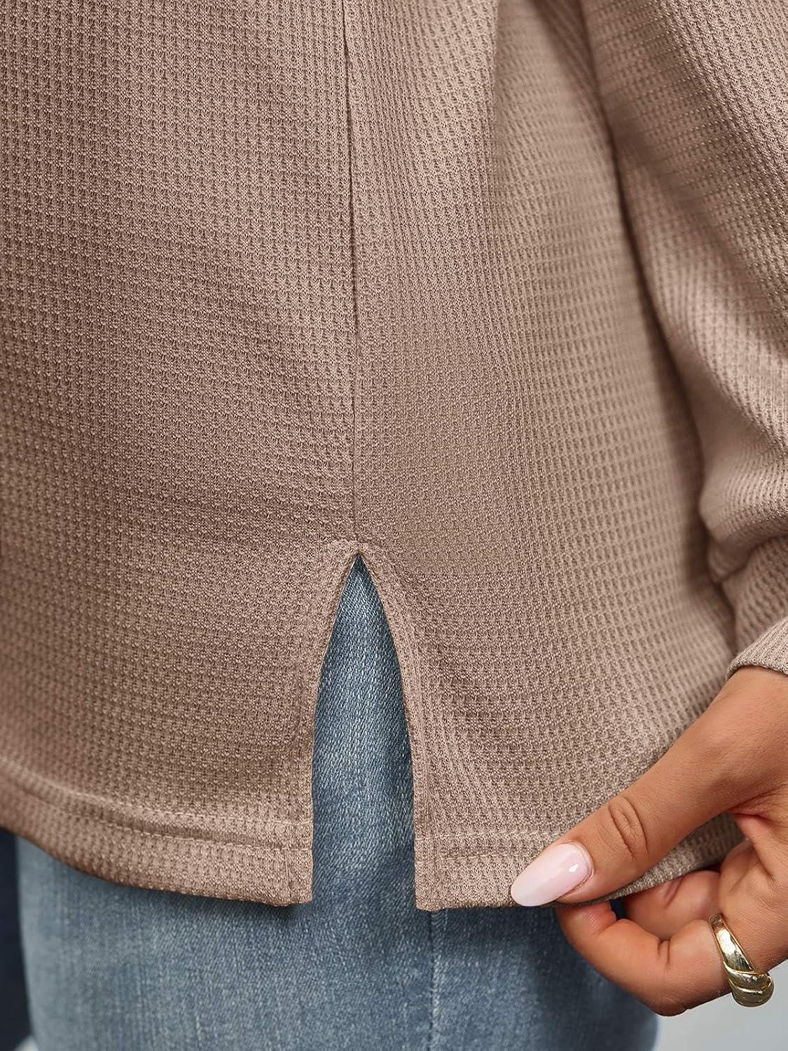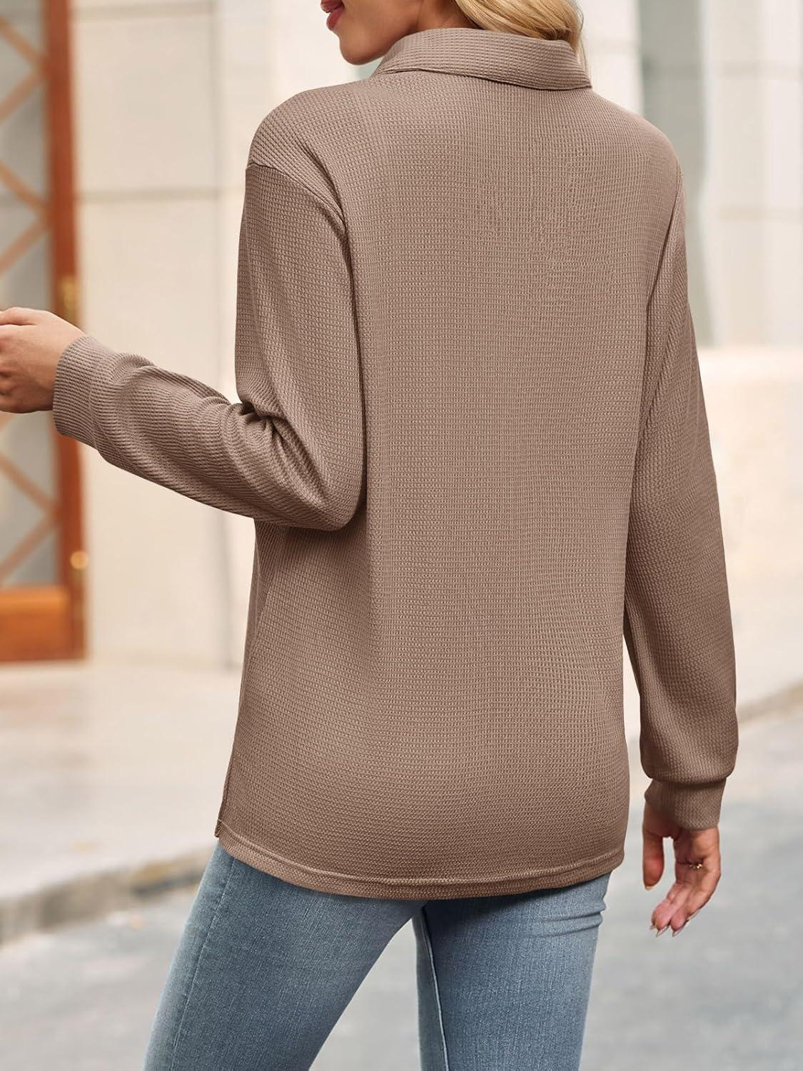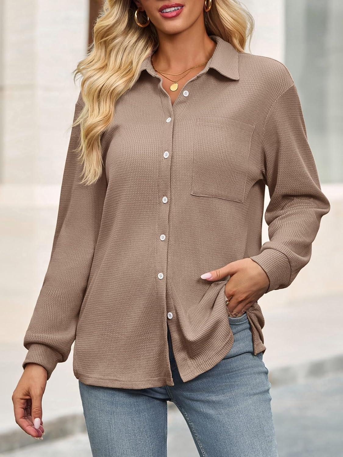 Tankaneo Womens Waffle Knit Button Down Shirts Fall Dressy Casual Long Sleeve V Neck Blouse Loose Fit Work Tops Shacket(Khaki)