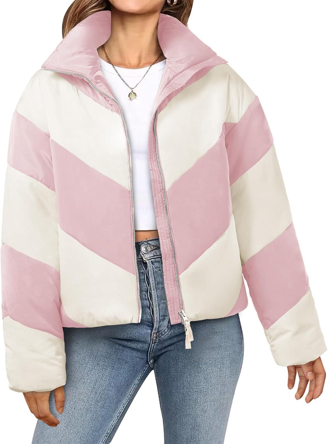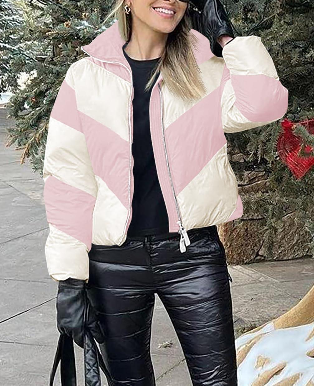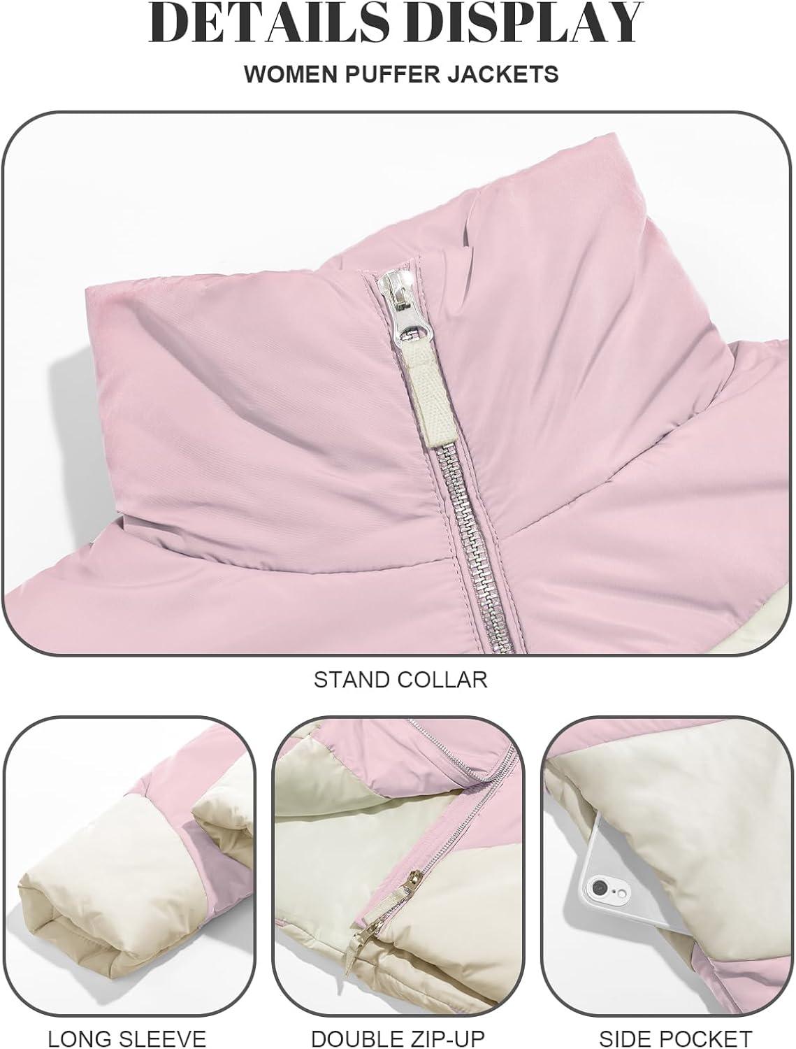 Tankaneo Womens Winter Cropped Puffer Jacket Color Block Zip Up Puffy Down Coats Oversized Outerwear(Pink)