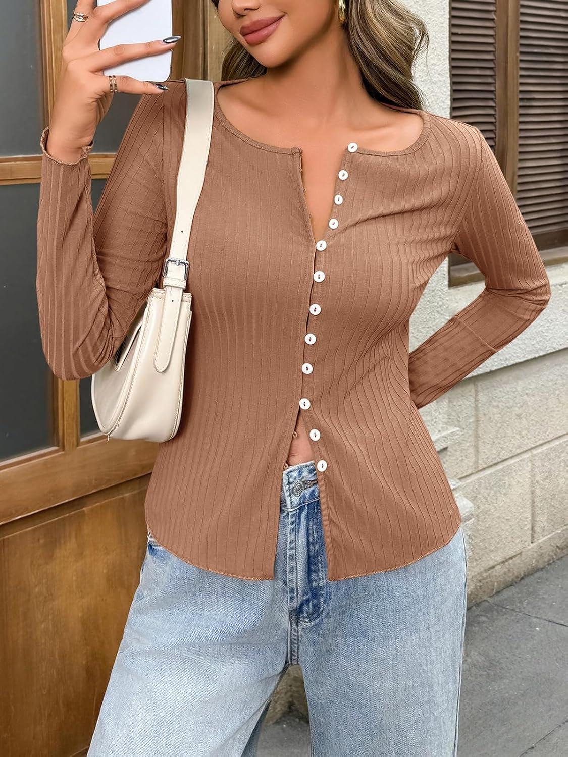 Womens Cardigans Button Down Long Sleeve Ribbed Shirts Cute Lighweight Fitted Y2K Fall Tops(Khaki)