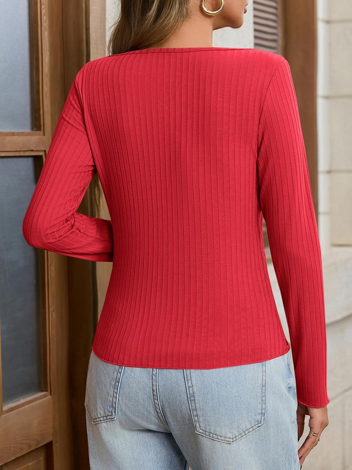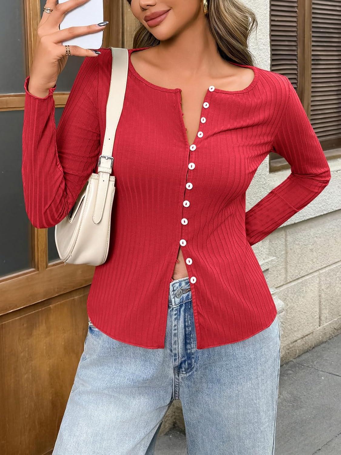 Womens Cardigans Button Down Long Sleeve Ribbed Shirts Cute Lighweight Fitted Y2K Fall Tops(Red)