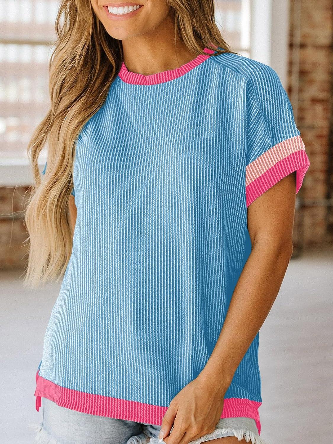Womens Color Block Oversized Tops Trendy Casual Summer Textured Ribbed Knit T Shirts Loose Fit Short Sleeve Tshirts(Sky Blue)