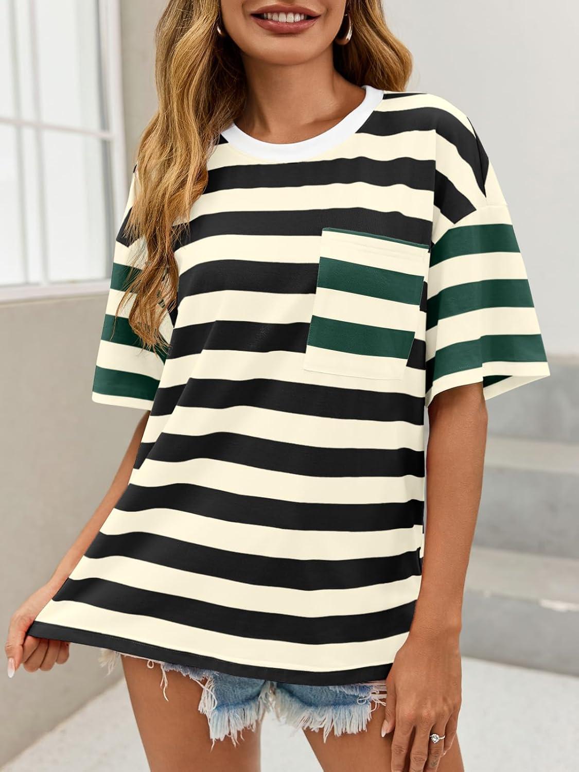 Womens Oversized Color Block Striped Tshirts Summer Casual Short Sleeve Tops Loose Fit Crew Neck Shirts(Black)
