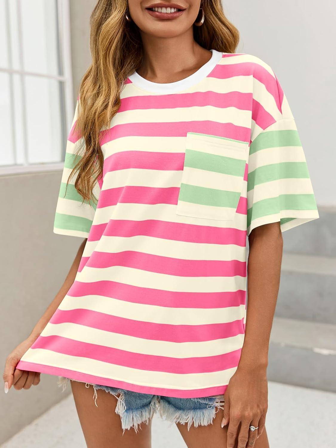 Womens Oversized Color Block Striped Tshirts Summer Casual Short Sleeve Tops Loose Fit Crew Neck Shirts(Pink Green)