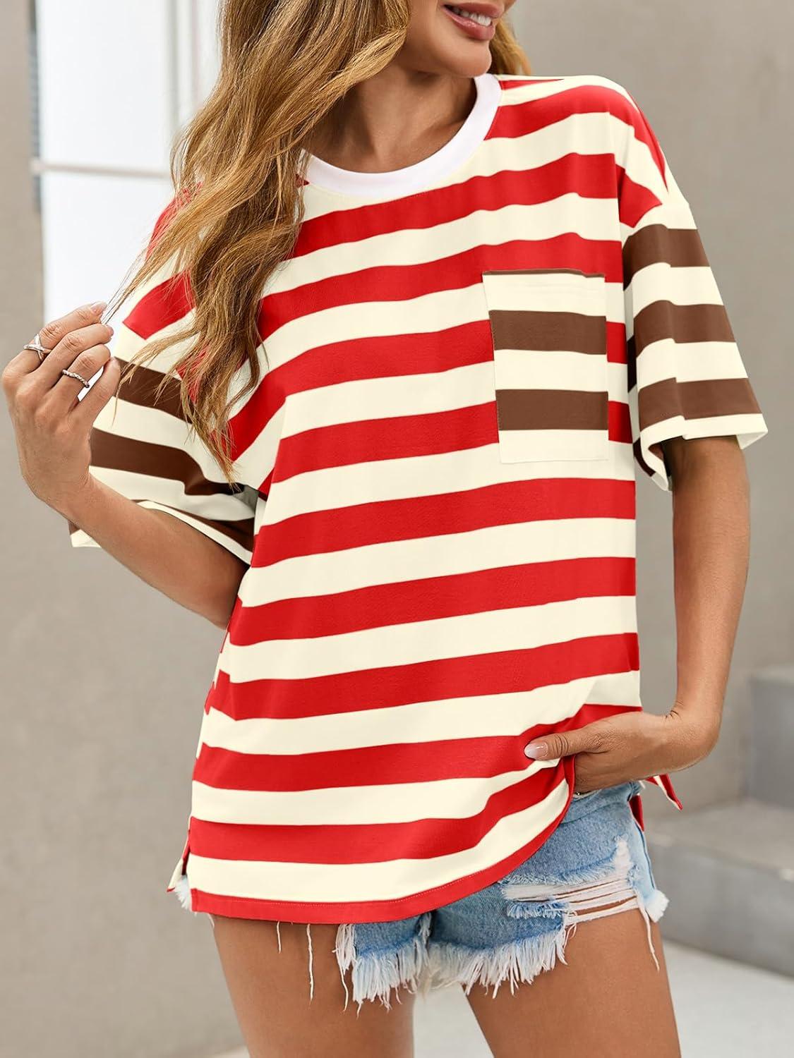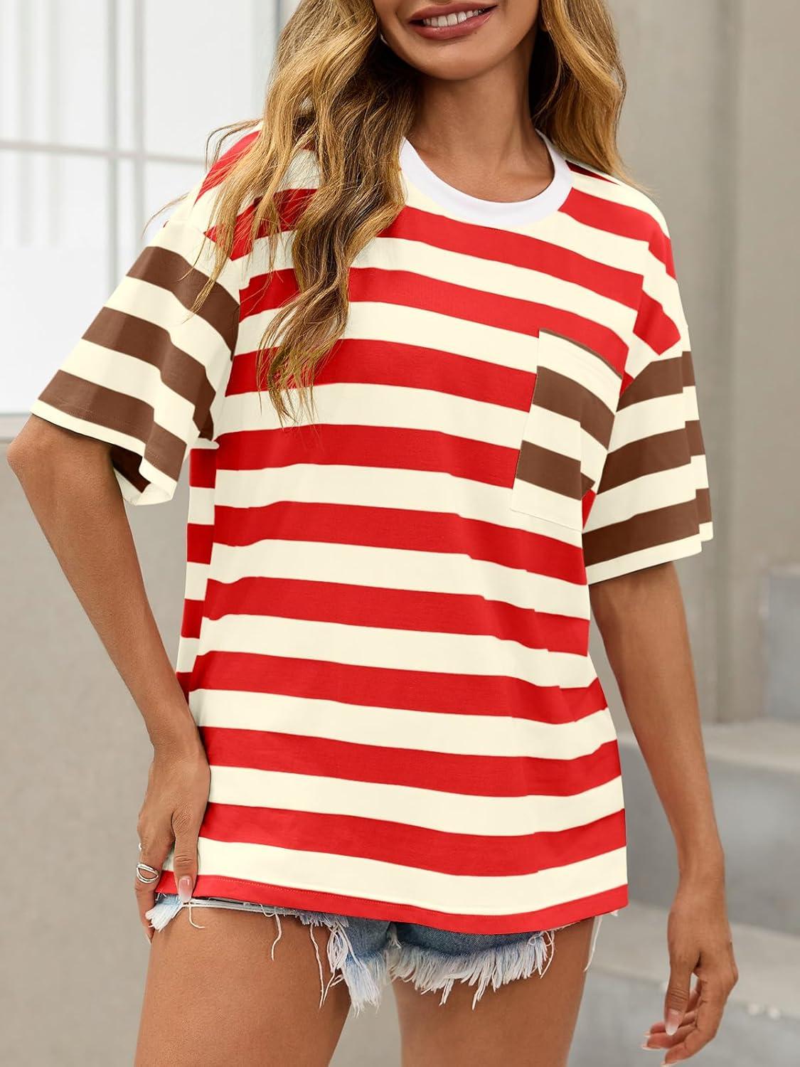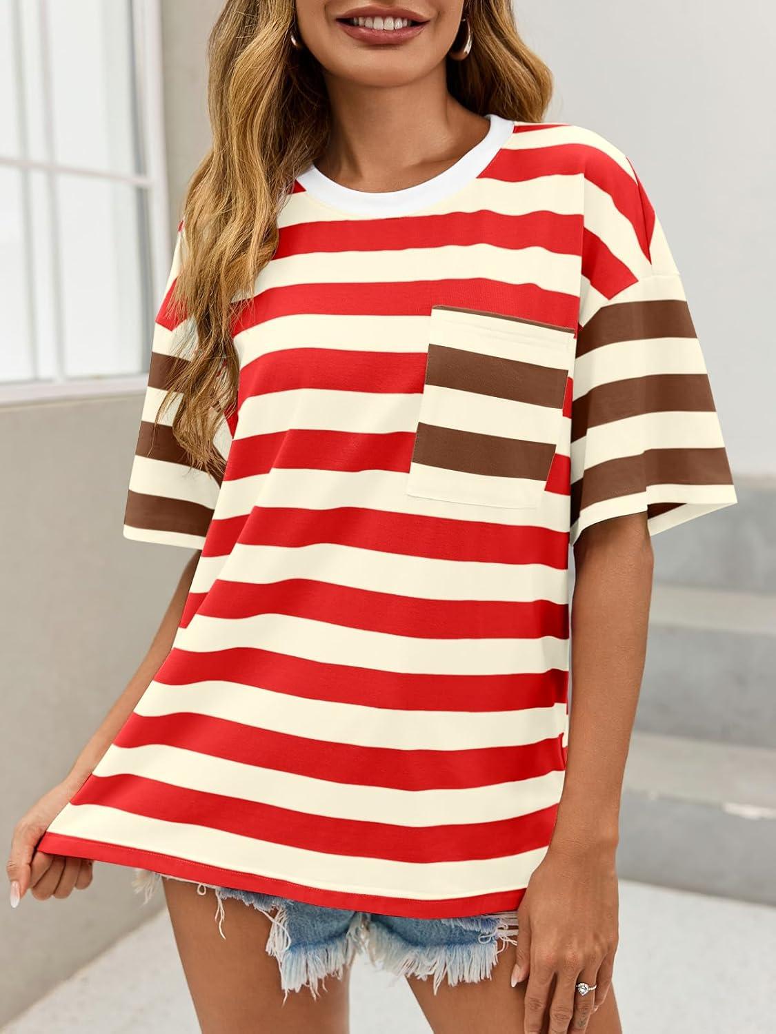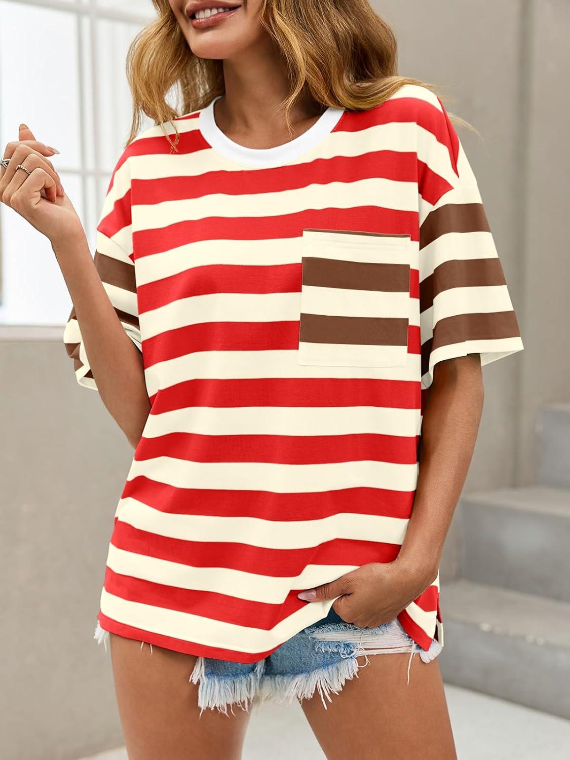 Womens Oversized Color Block Striped Tshirts Summer Casual Short Sleeve Tops Loose Fit Crew Neck Shirts(Red)