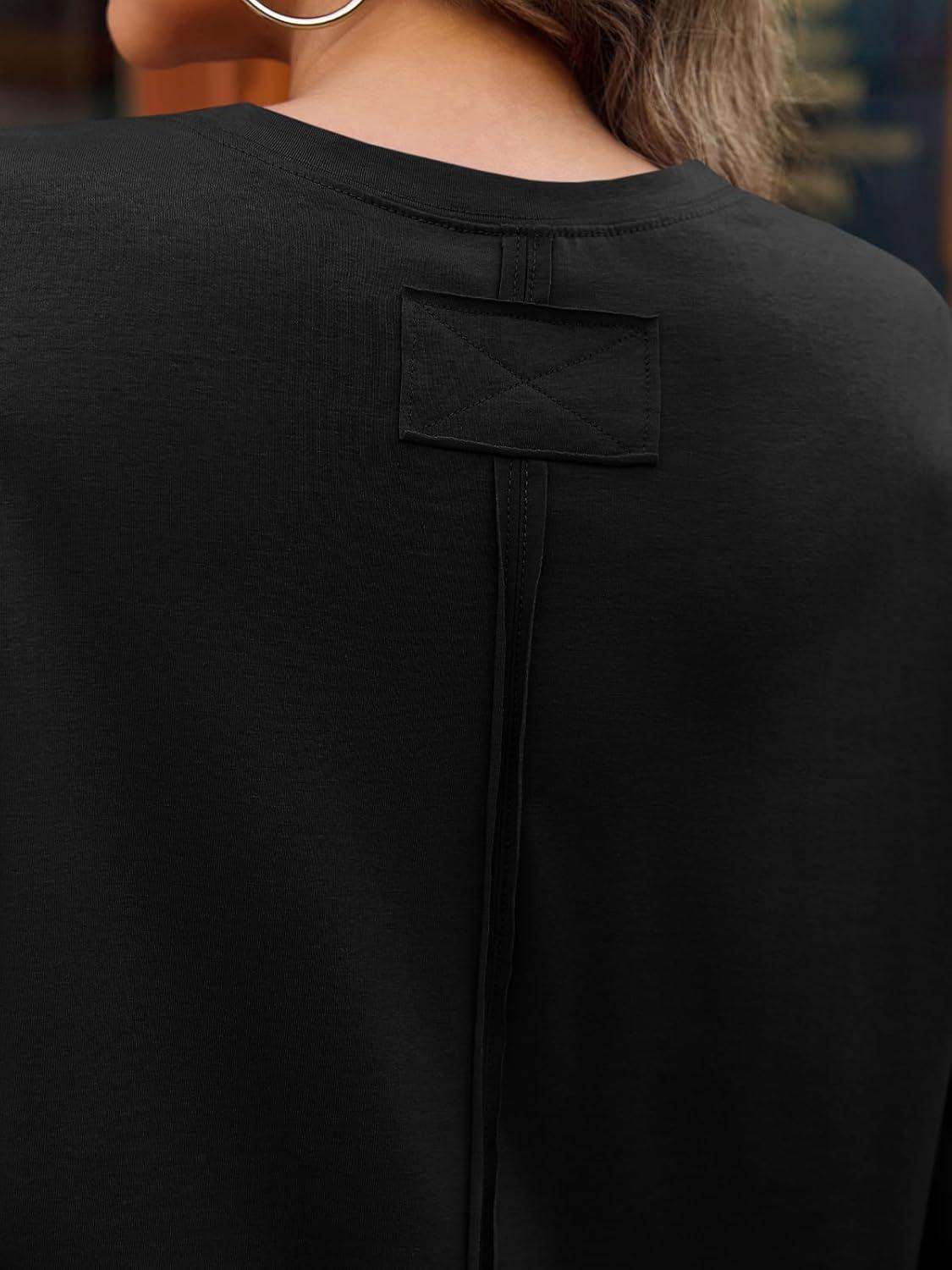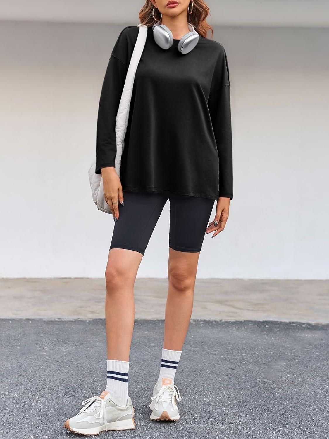 Womens Oversized Long Sleeve Shirts Crew Neck Casual Tops Loose Fit Side Slit Fall Tees(Black)