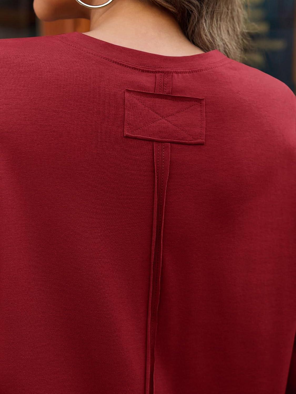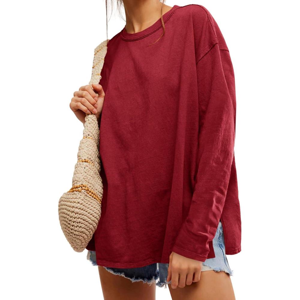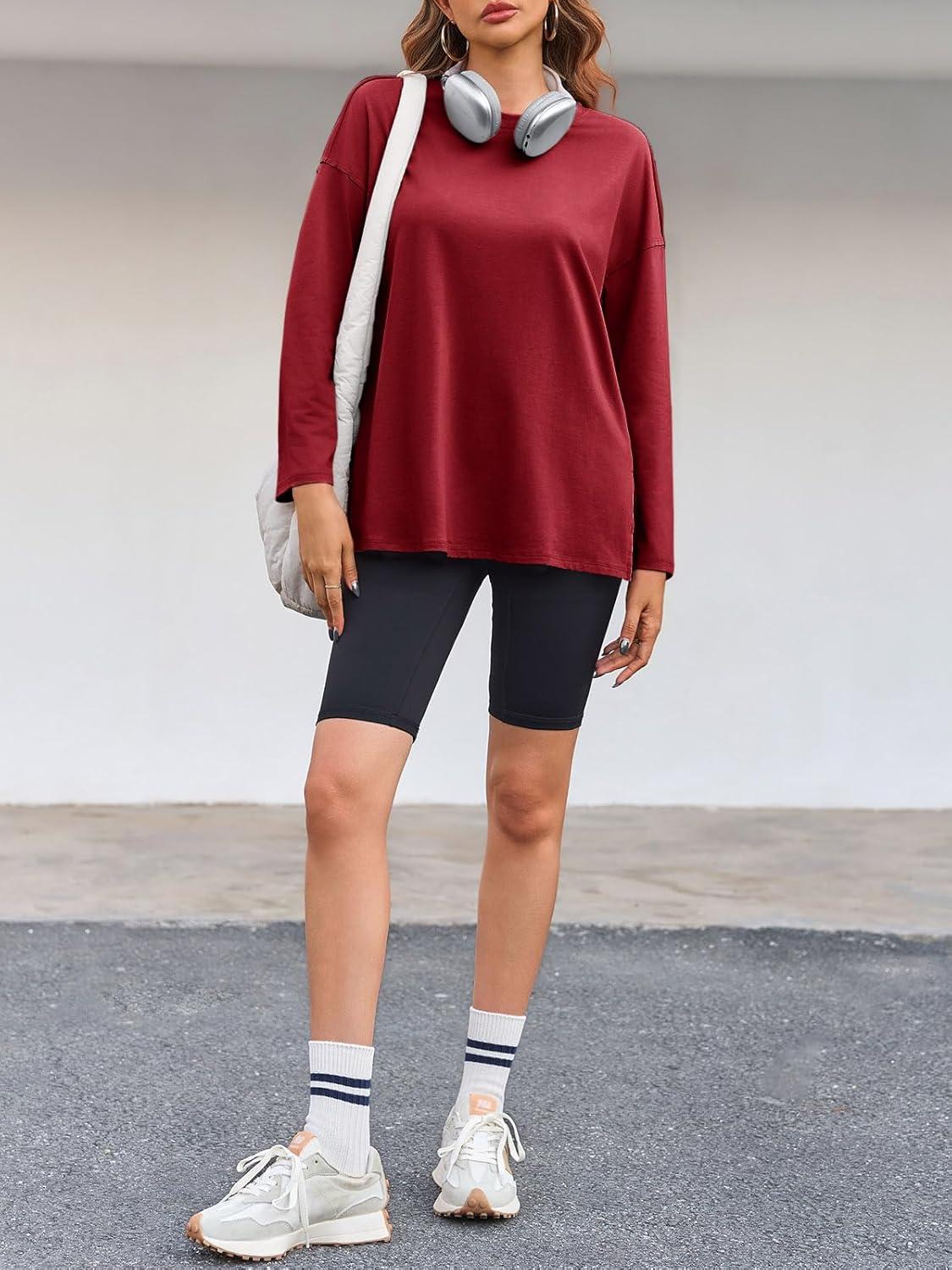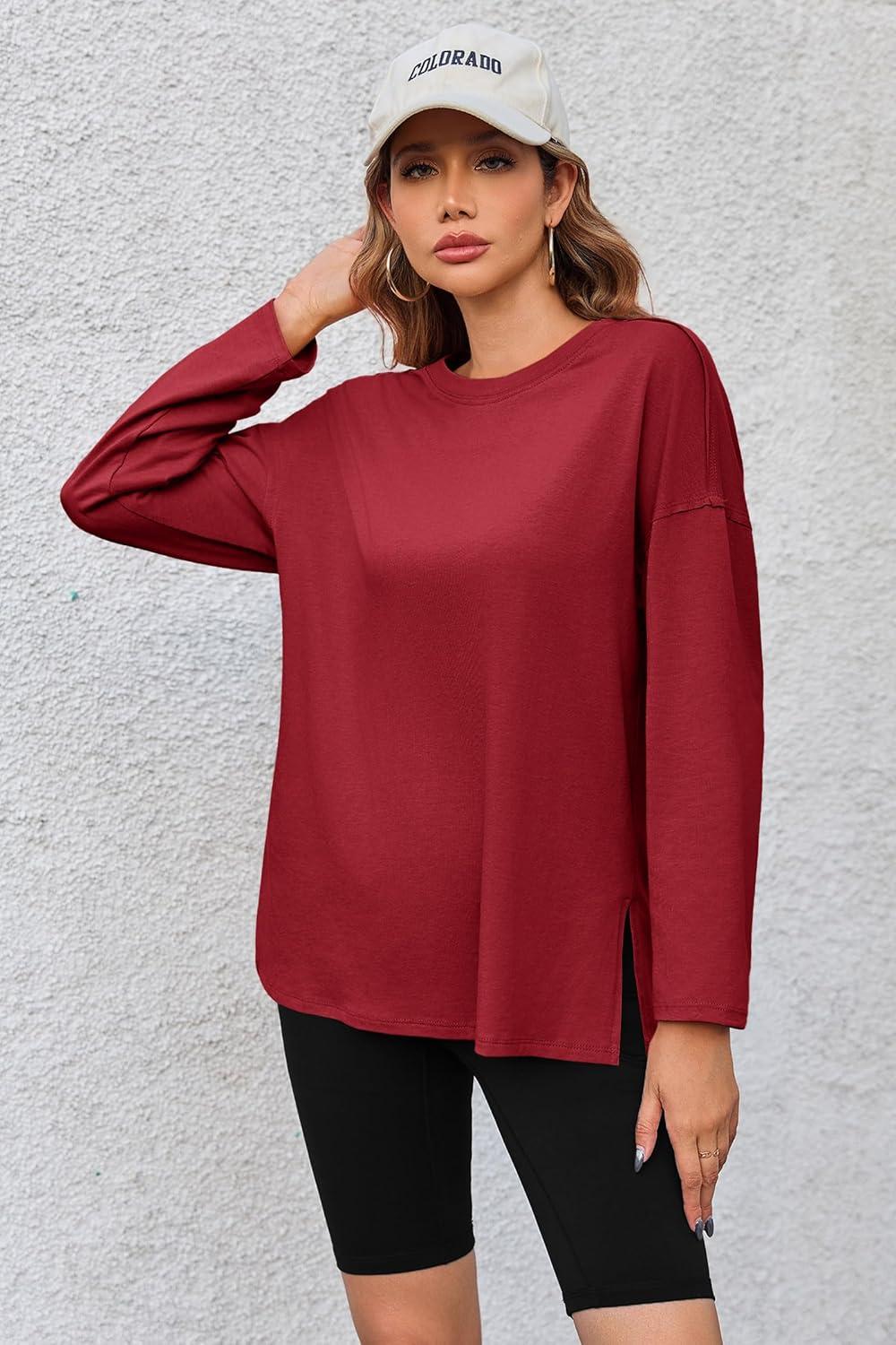 Womens Oversized Long Sleeve Shirts Crew Neck Casual Tops Loose Fit Side Slit Fall Tees(Burgundy)