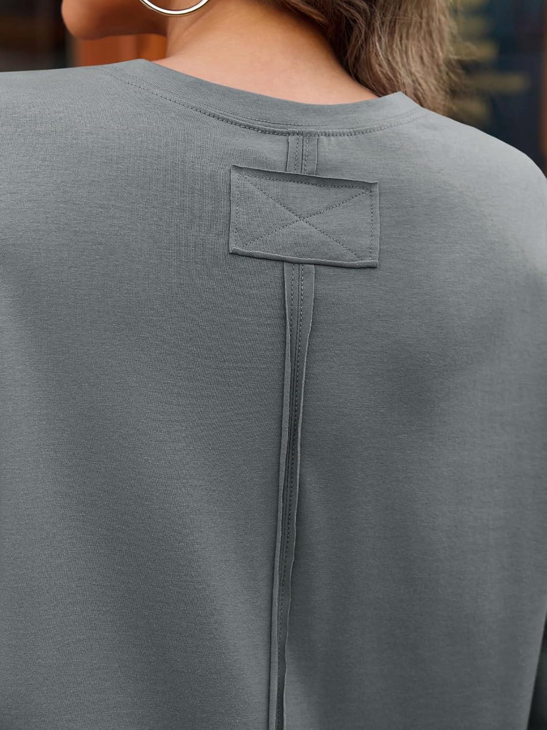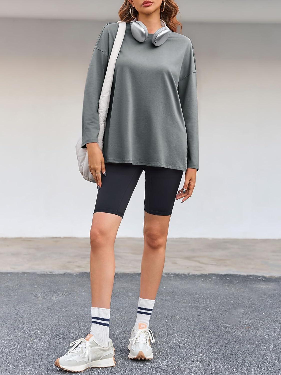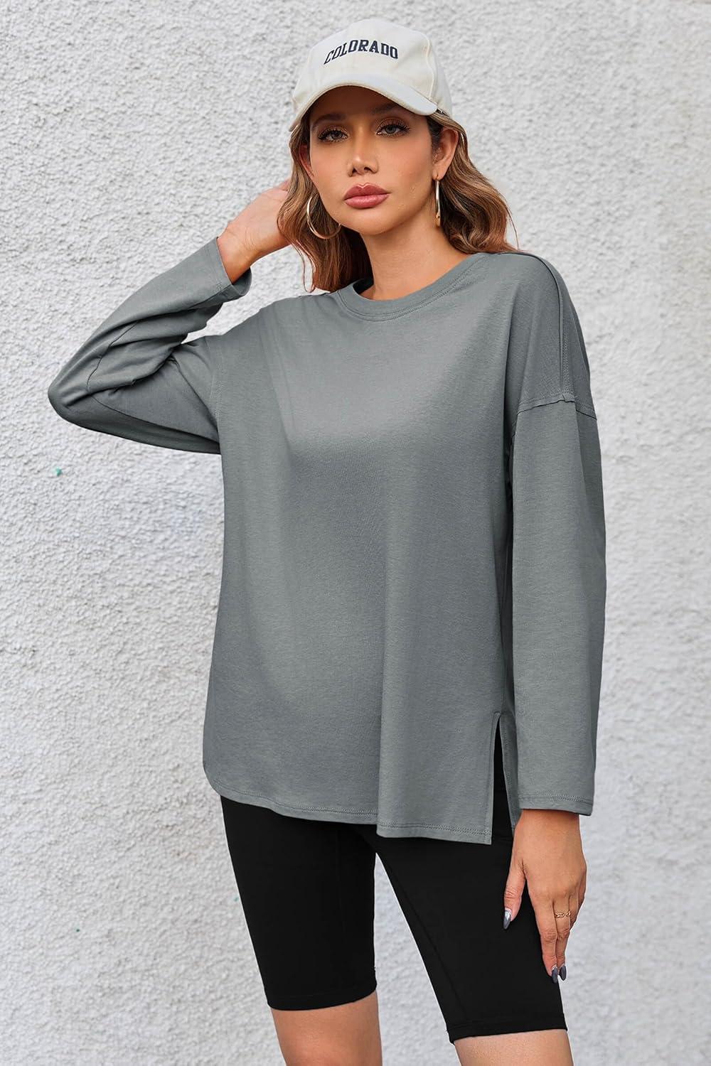 Womens Oversized Long Sleeve Shirts Crew Neck Casual Tops Loose Fit Side Slit Fall Tees(Grey)