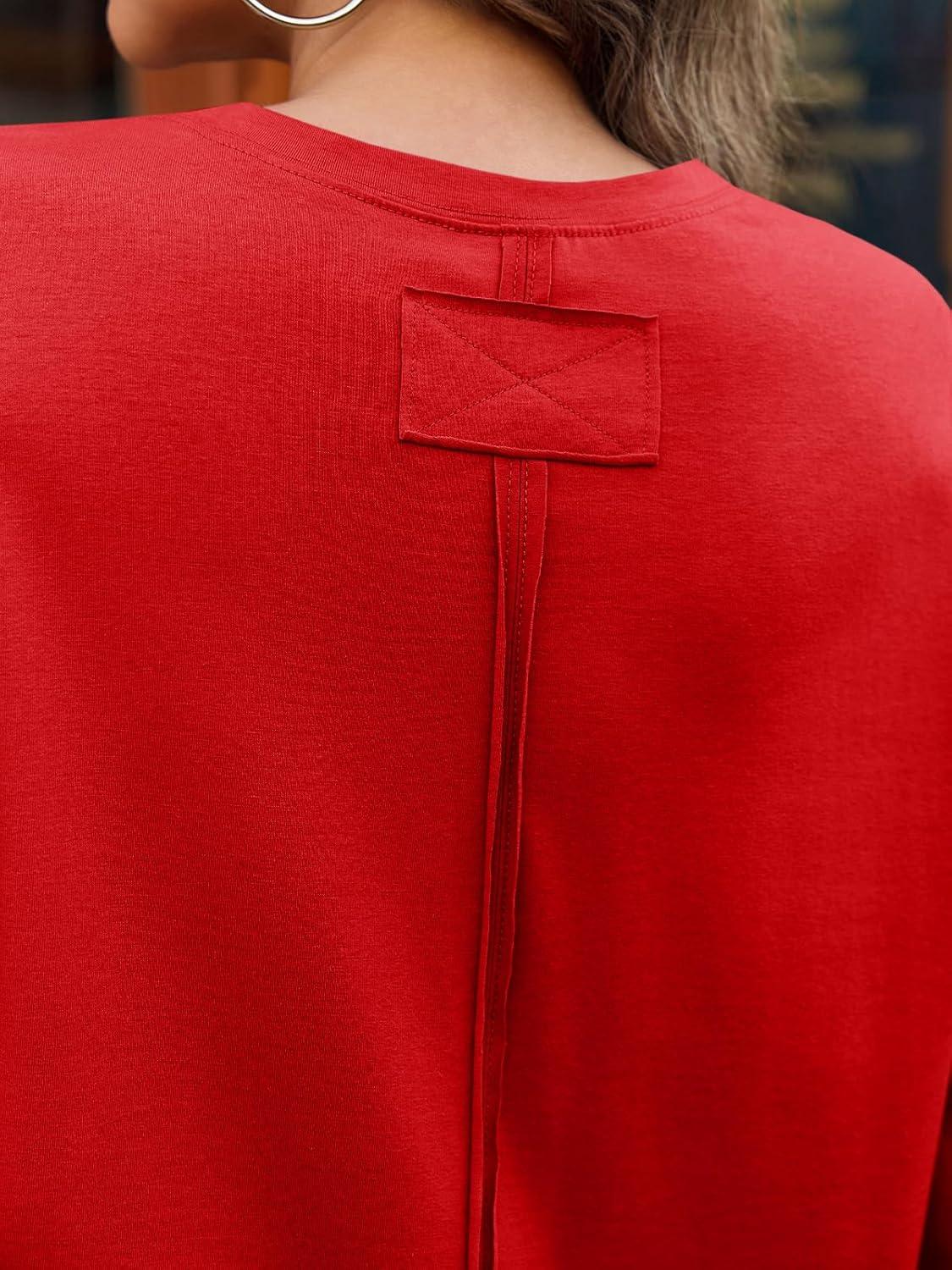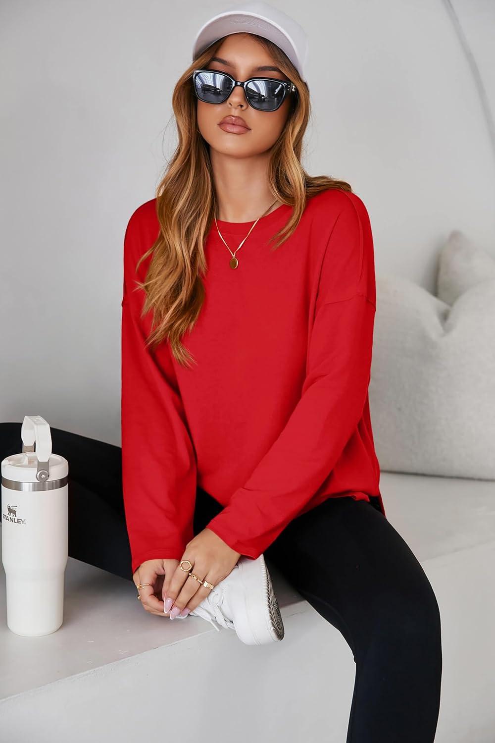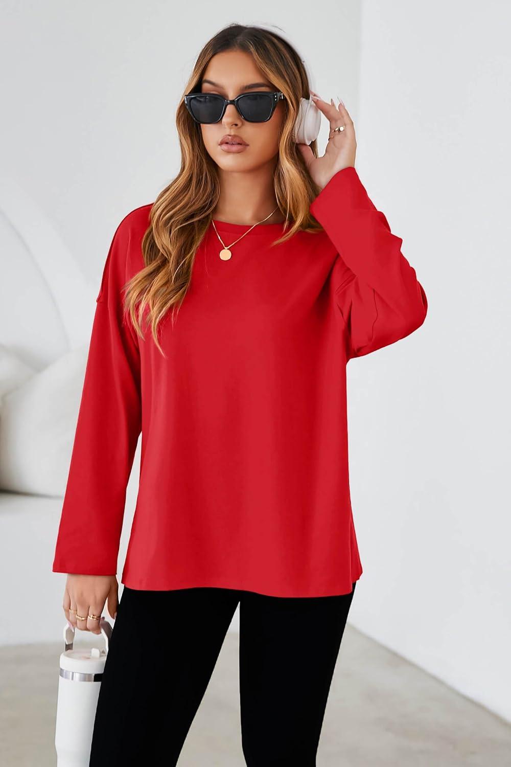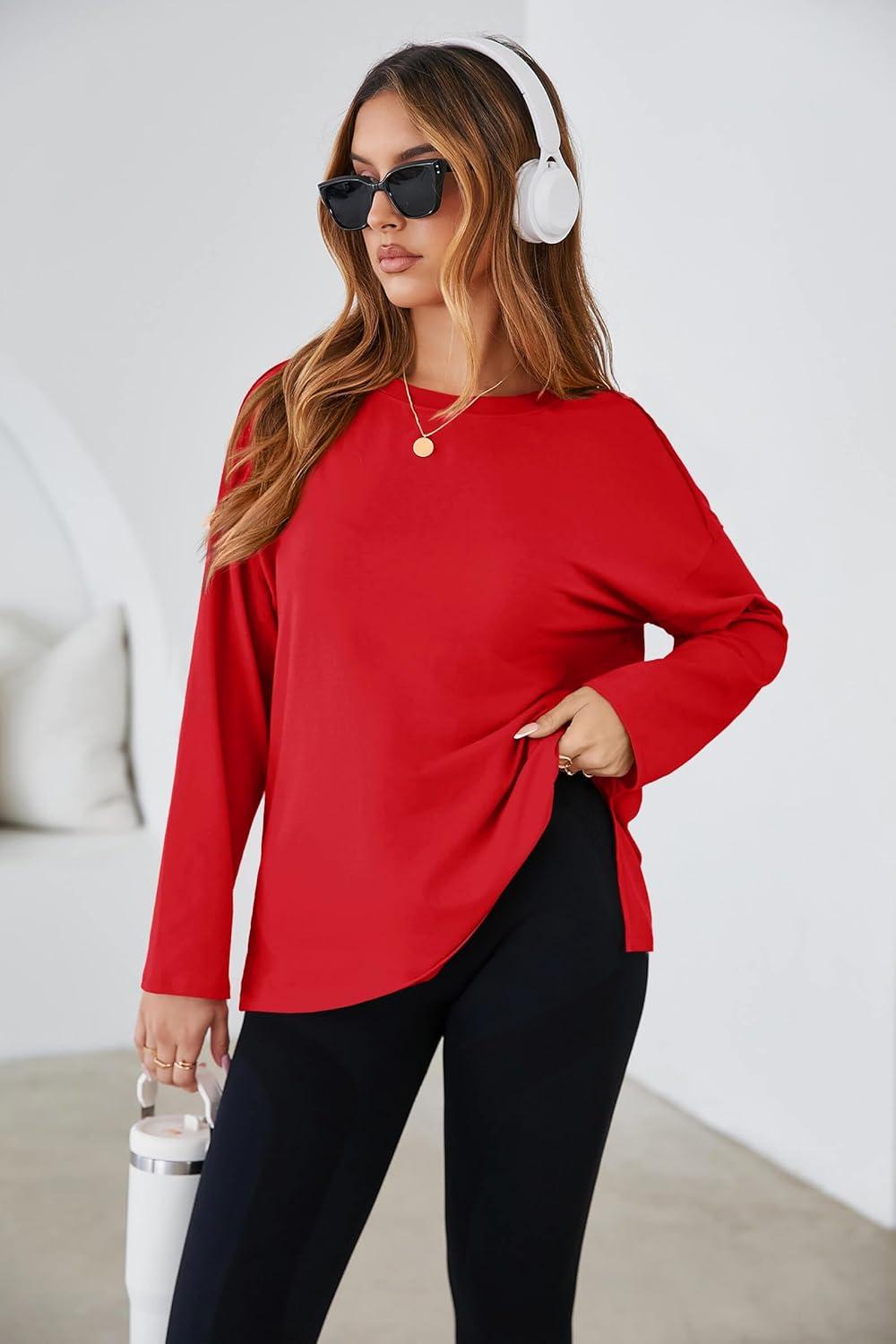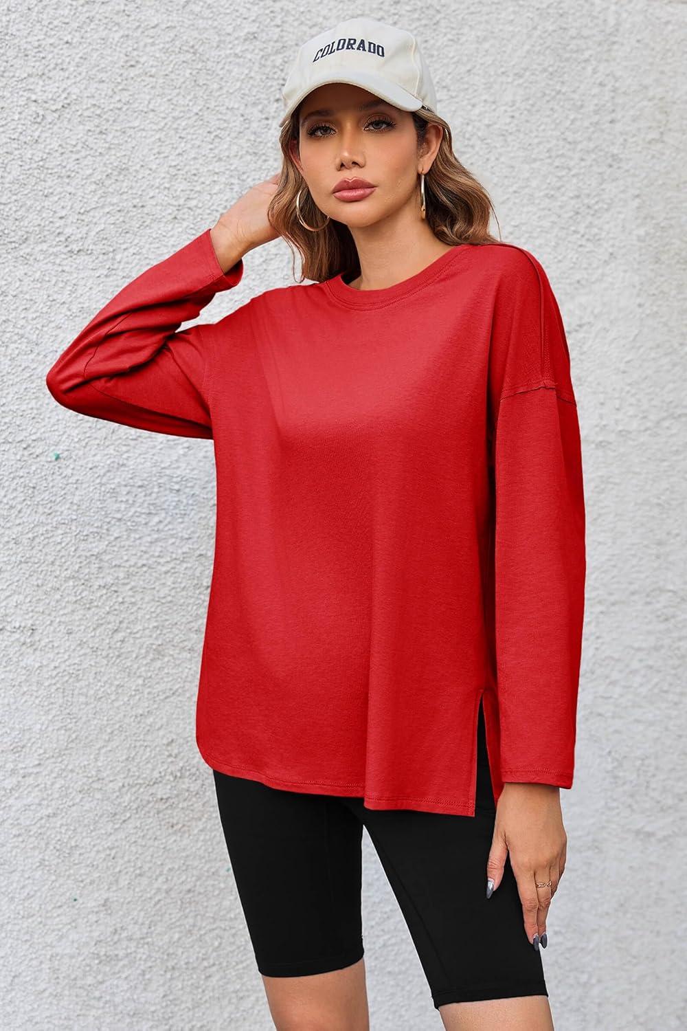 Womens Oversized Long Sleeve Shirts Crew Neck Casual Tops Loose Fit Side Slit Fall Tees(Red)
