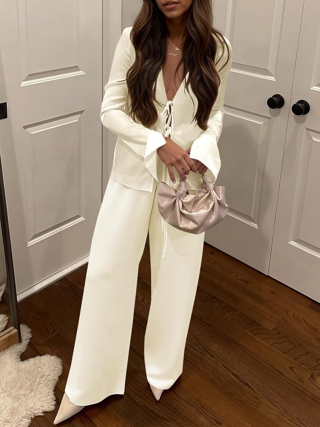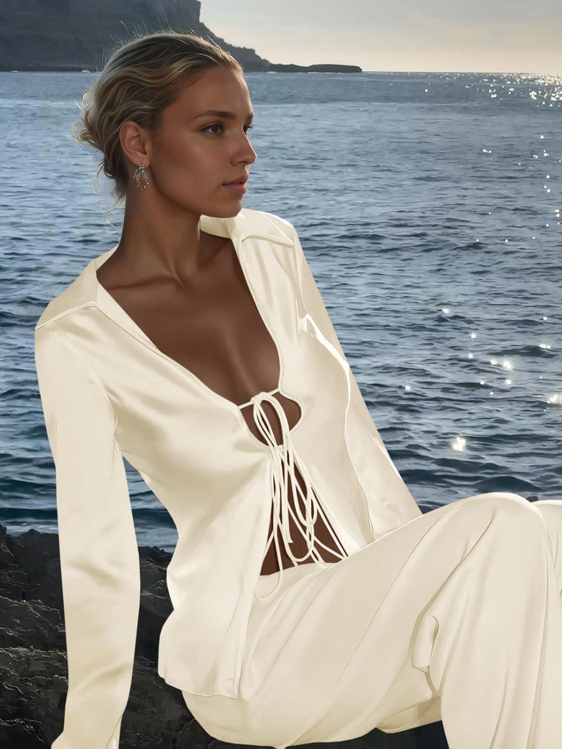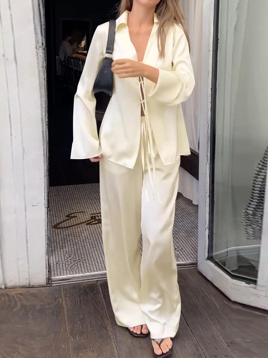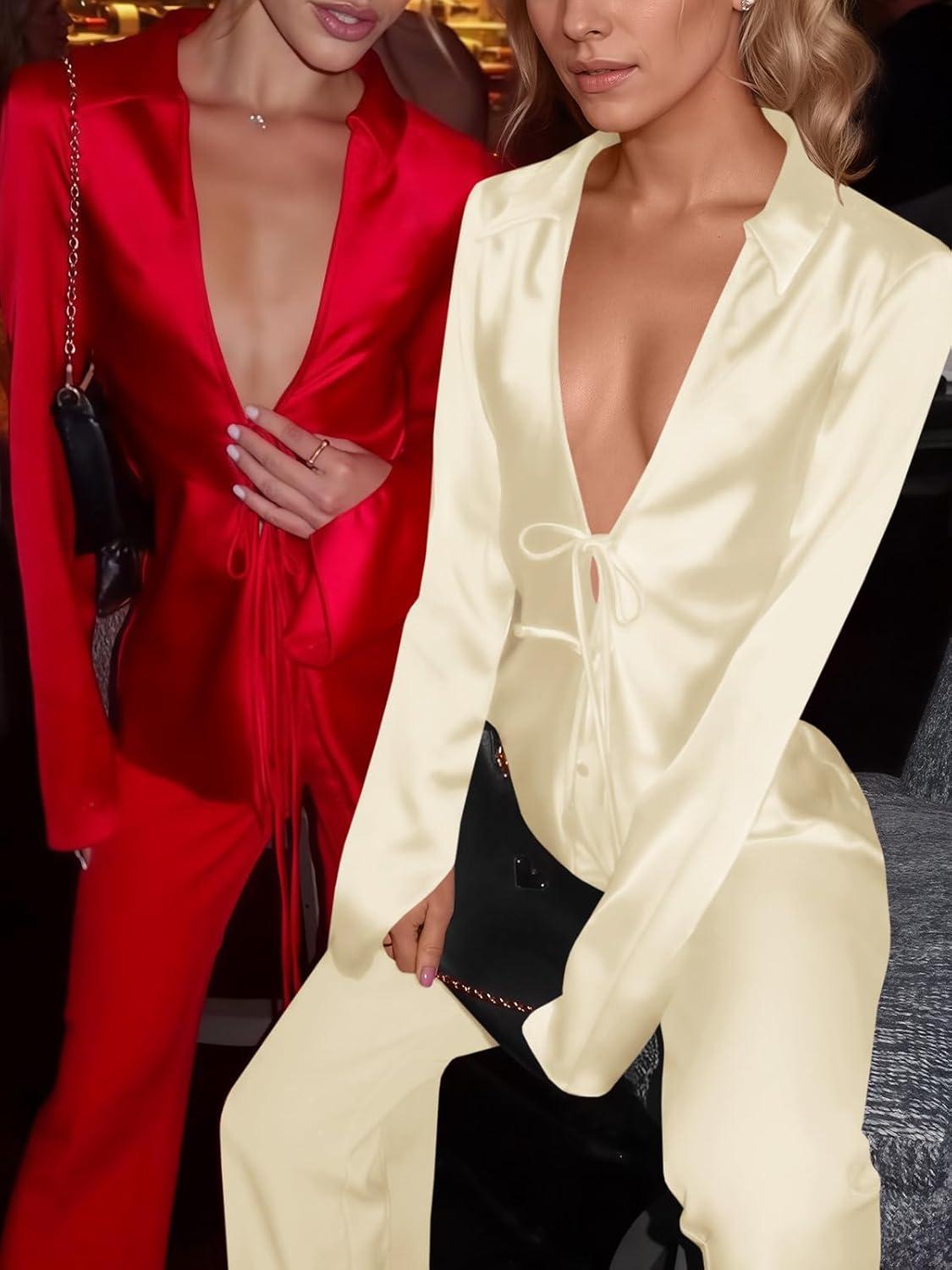 Womens Sexy Silk Satin 2 Piece Outfits Tie Front Long Sleeve Shirts and Pants Lounge Pajamas Sets Going Out Matching Set(Beige)