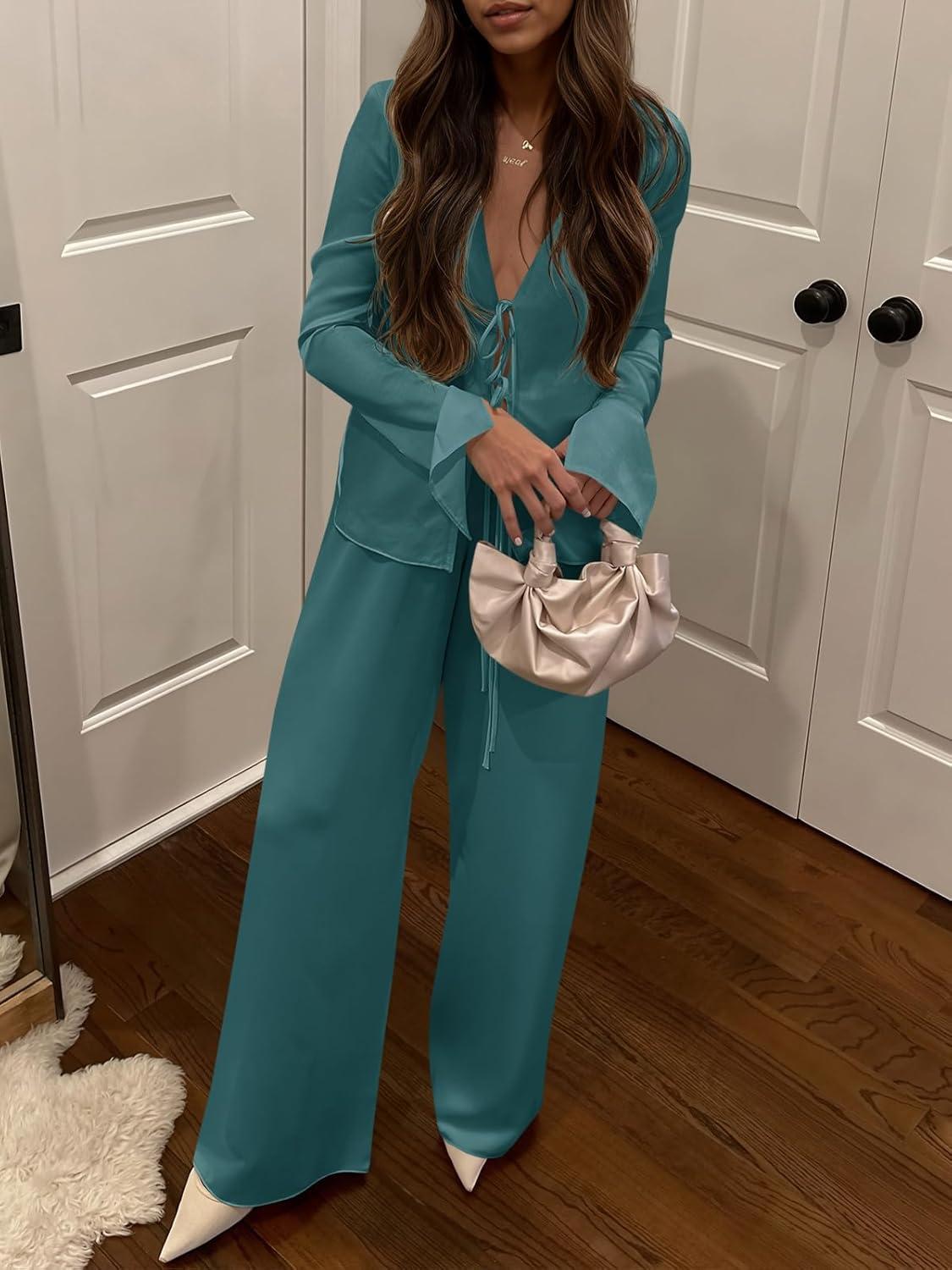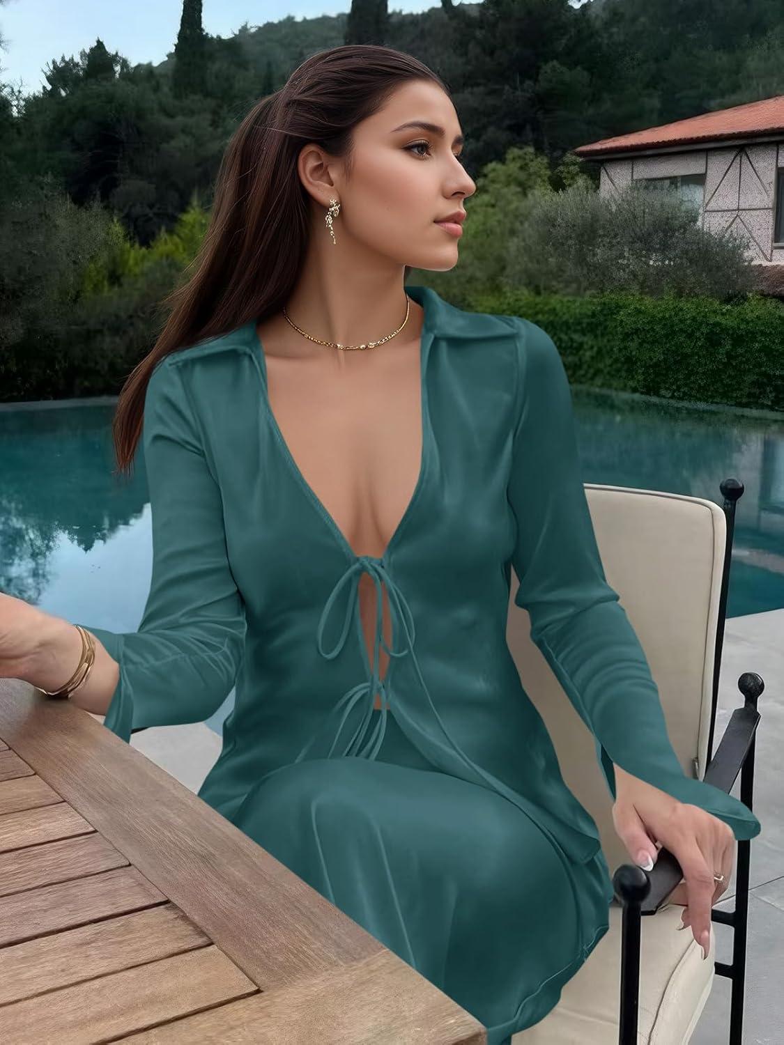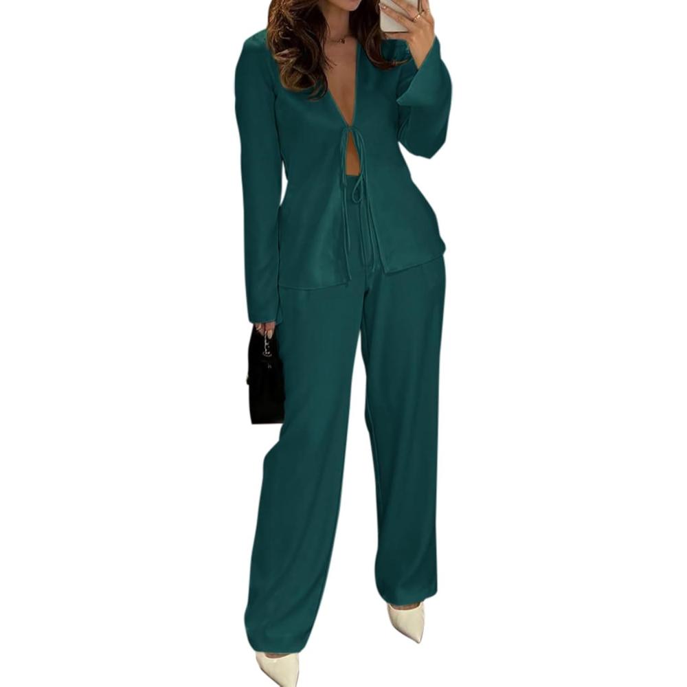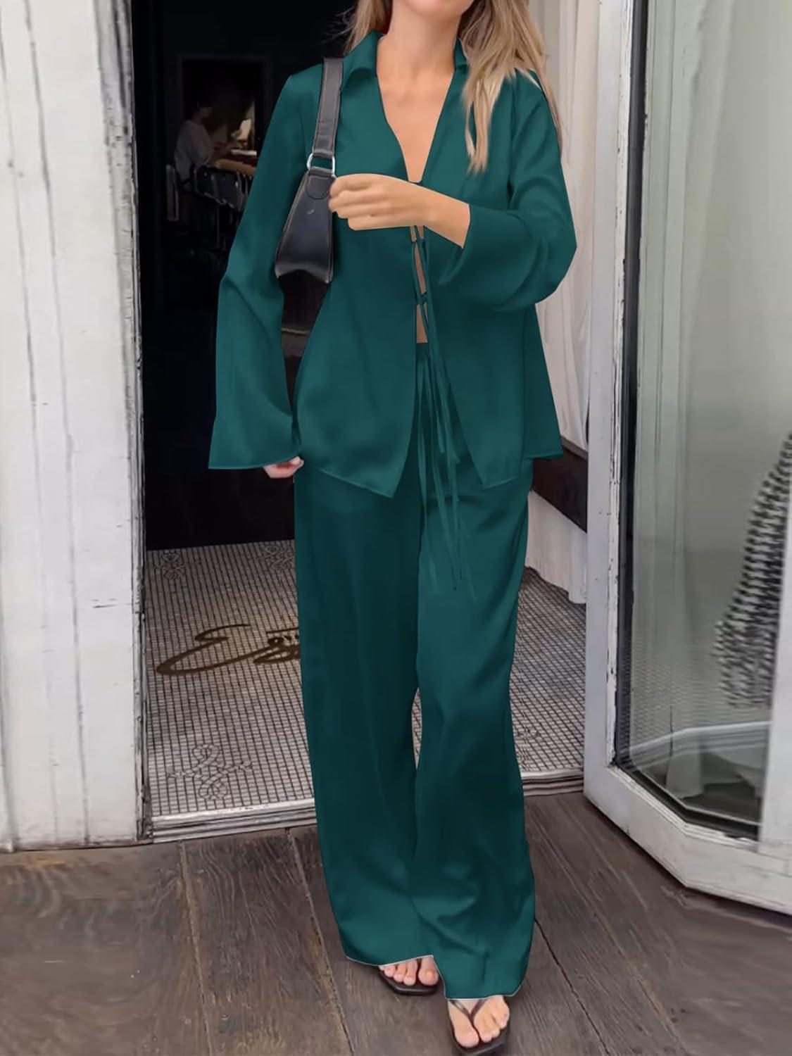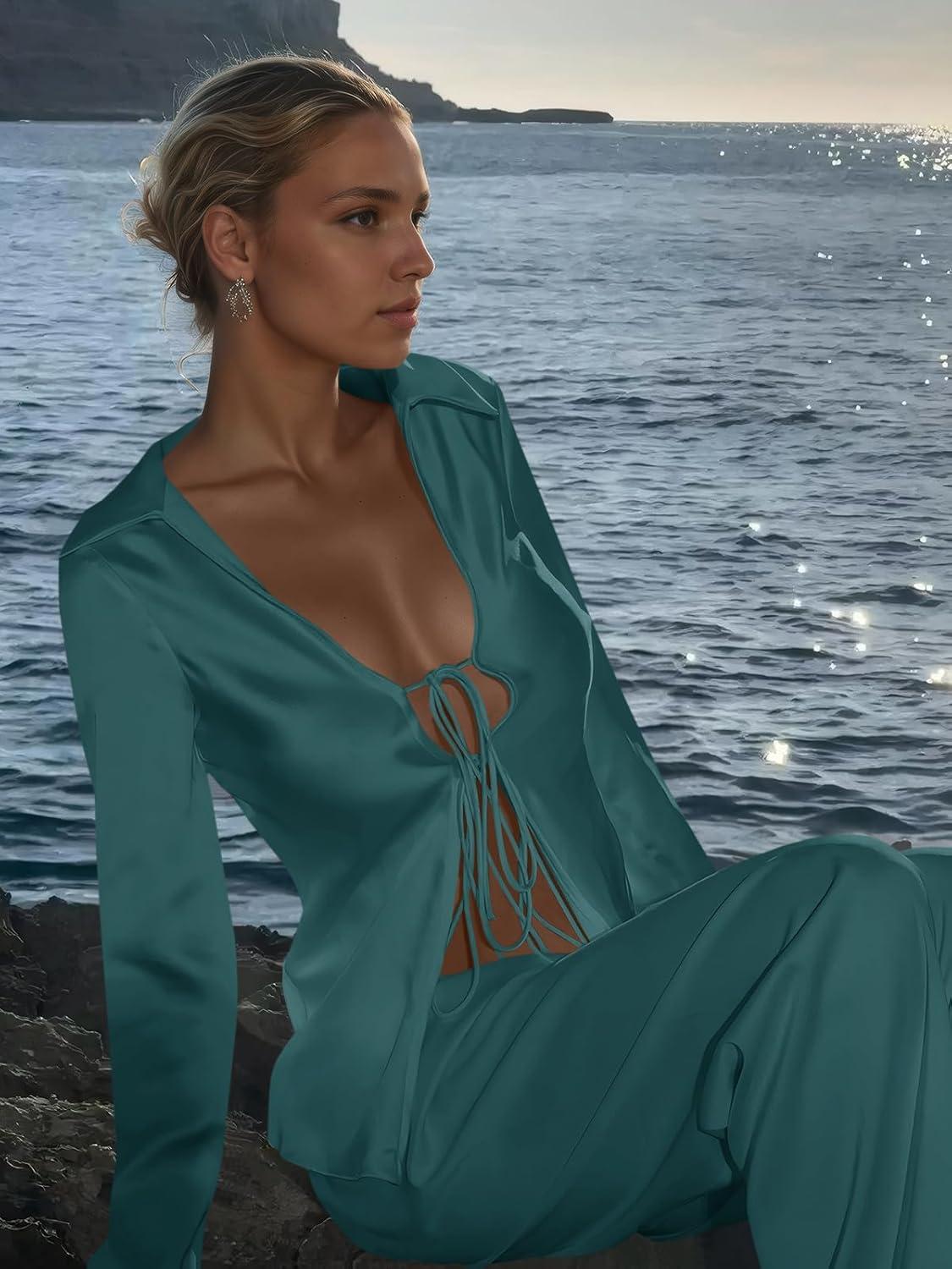 Womens Sexy Silk Satin 2 Piece Outfits Tie Front Long Sleeve Shirts and Pants Lounge Pajamas Sets Going Out Matching Set(Dark Green)